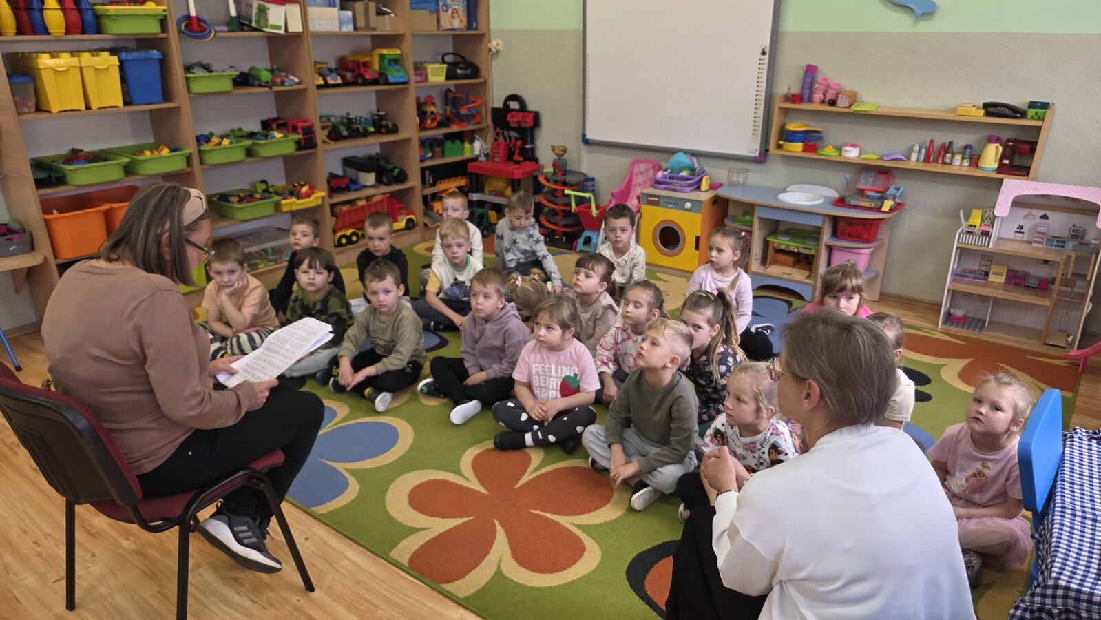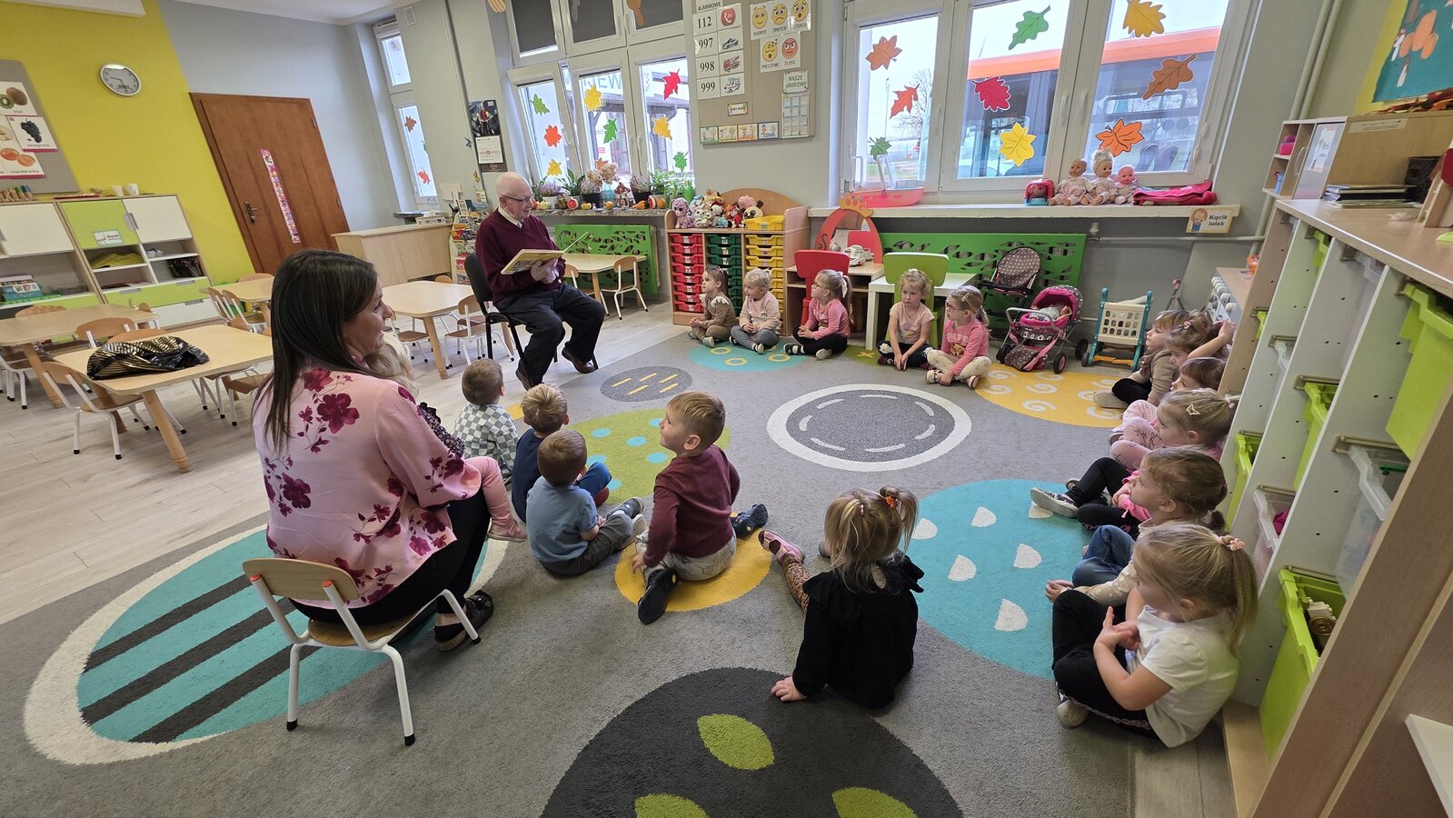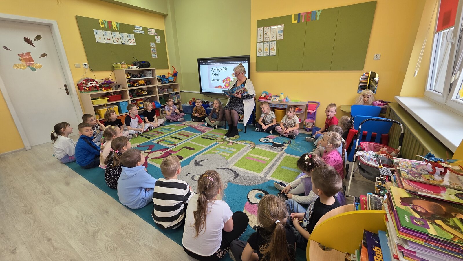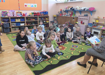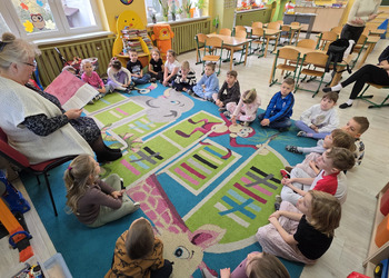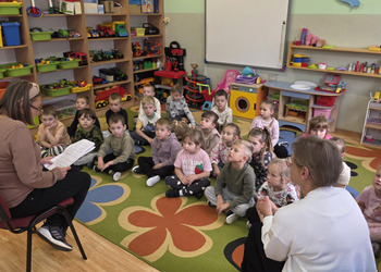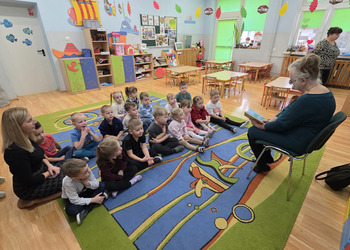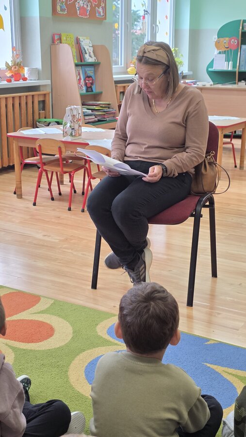 W salach panowała atmosfera zaciekawienia i radości. Dzieci siedziały zasłuchane, reagując śmiechem, zdziwieniem oraz pytaniami na kolejne fragmenty bajki.