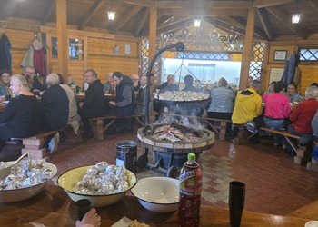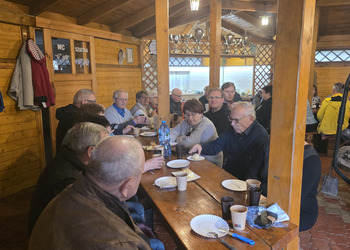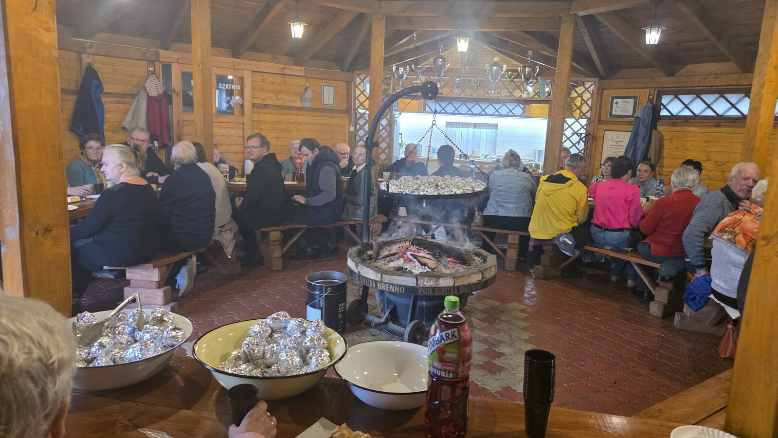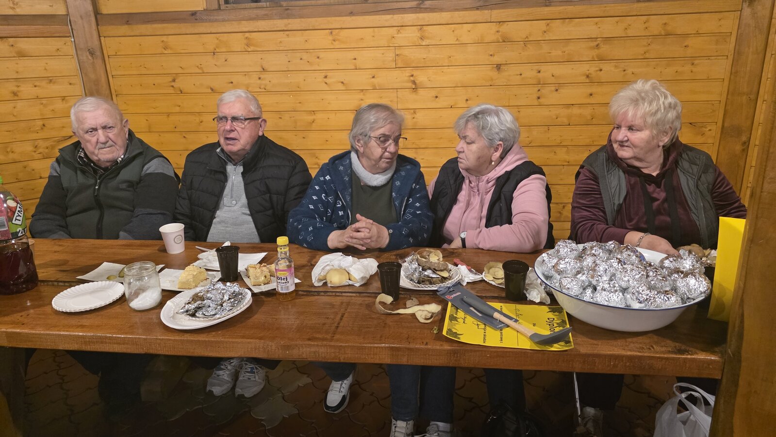W czwartek 9 października 2025 r. odbyło się klubowe święto pyry. Seniorzy wraz z zaproszonymi gośćmi zebrali się w Altance na Kisowni i wspólnie biesiadowali. Najpierw była kawa i ciacho, a później pierwsza konkurencja – rzut ziemniakiem do koszyka. Wśród licznej grupy śmiałków, po dogrywce, zwycięzcą został pan Franek. Nie mogło zabraknąć również naszego klubowego MasterChefa. W tej edycji zwyciężczynią została pani Krysia ze swoimi krokietami ziemniaczanymi. W końcu nadszedł czas na pieczone ziemniaczki. Smakowały wybornie razem z gzikiem oraz chlebem ze smalcem i ogórkiem kiszonym. Lecz to jeszcze nie był koniec naszego świętowania! Kolejną konkurencją było obieranie pyrki tak, żeby obierka była jak najdłuższa. Tu też bezkonkurencyjny okazał się pan Franek z obierką o długości 51 cm.