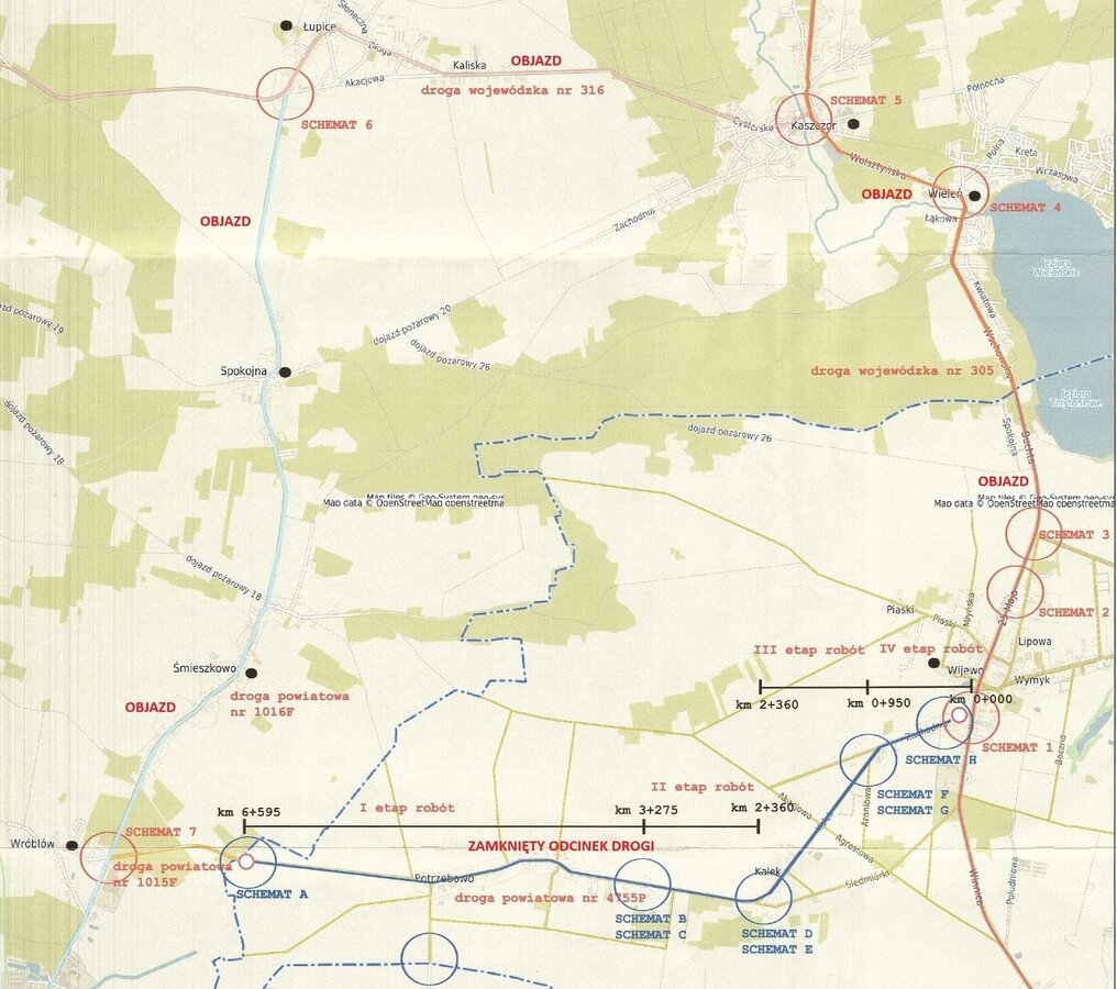 Szczegółowy przebieg objazdów przedstawiono na poniższej mapie.