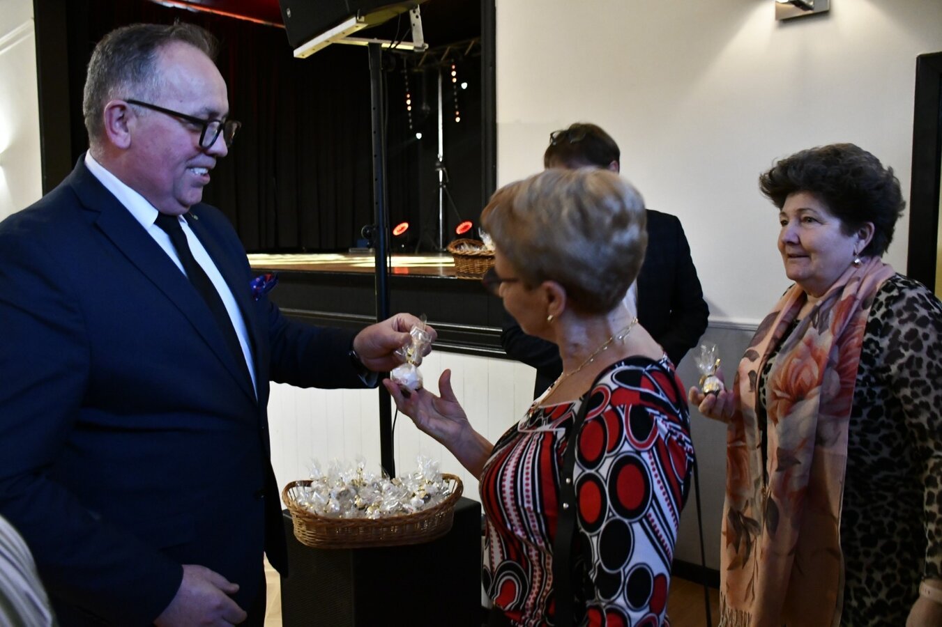 Na powitanie każda z pań otrzymała słodki upominek, który wręczali Wójt Gminy Wijewo, Pan Mieczysław Drożdżyński, Zastępca Wójta, Pan Waldemar Skrzypczak i Dyrektor Gminnego Ośrodka Kultury, Pan Leszek Bajon, składając serdeczne życzenia z okazji Dnia Kobiet.