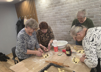 Dzieciaczki razem z Seniorkami piekły rogaliki. Wszystkie pięknie sobie radziły! Wałkowały ciasto, nakładały powidła i zwijały w rogaliki, a później zajadały ze smakiem!
