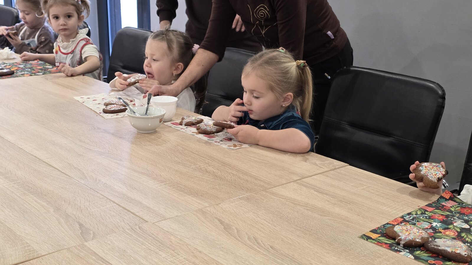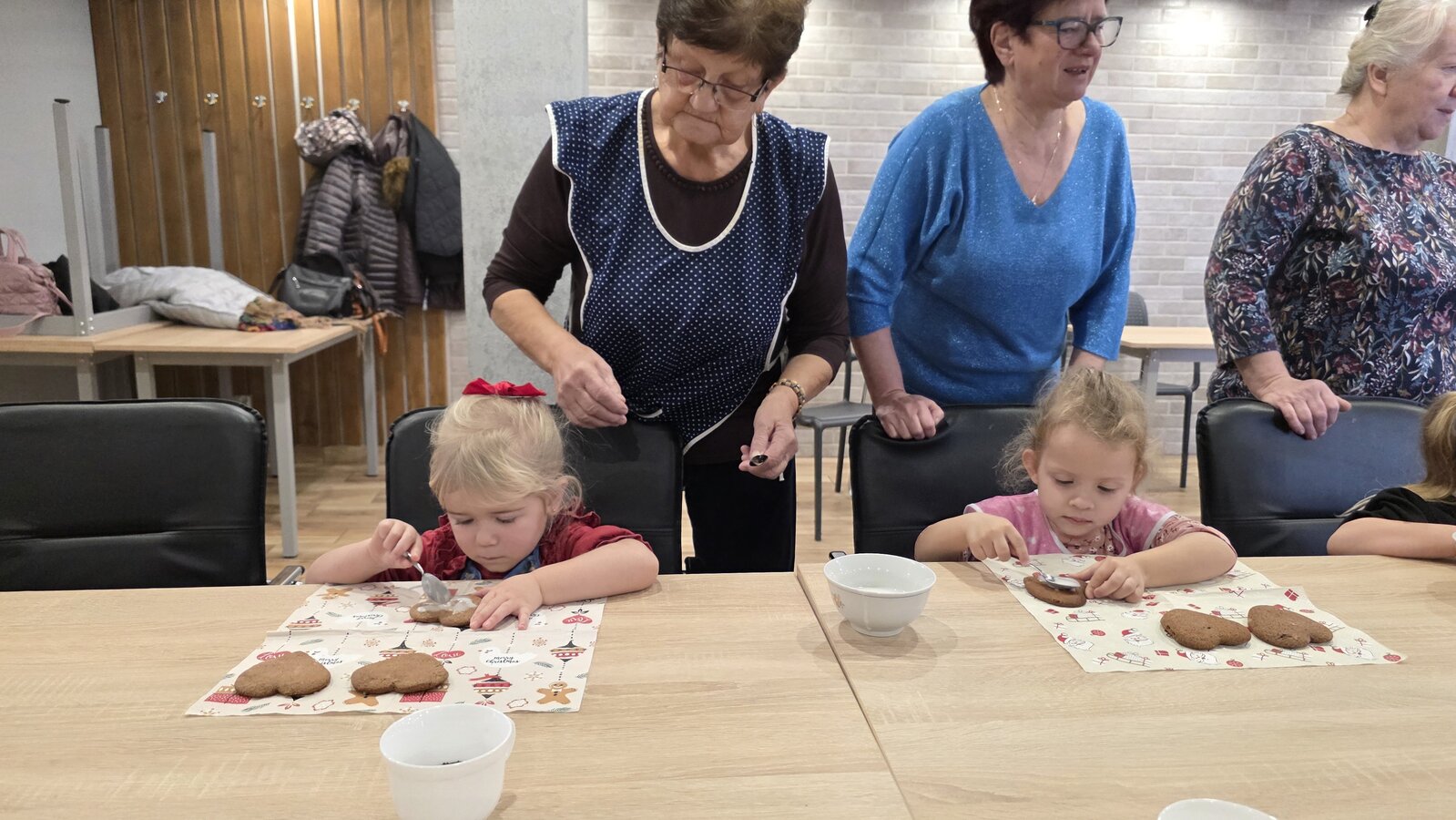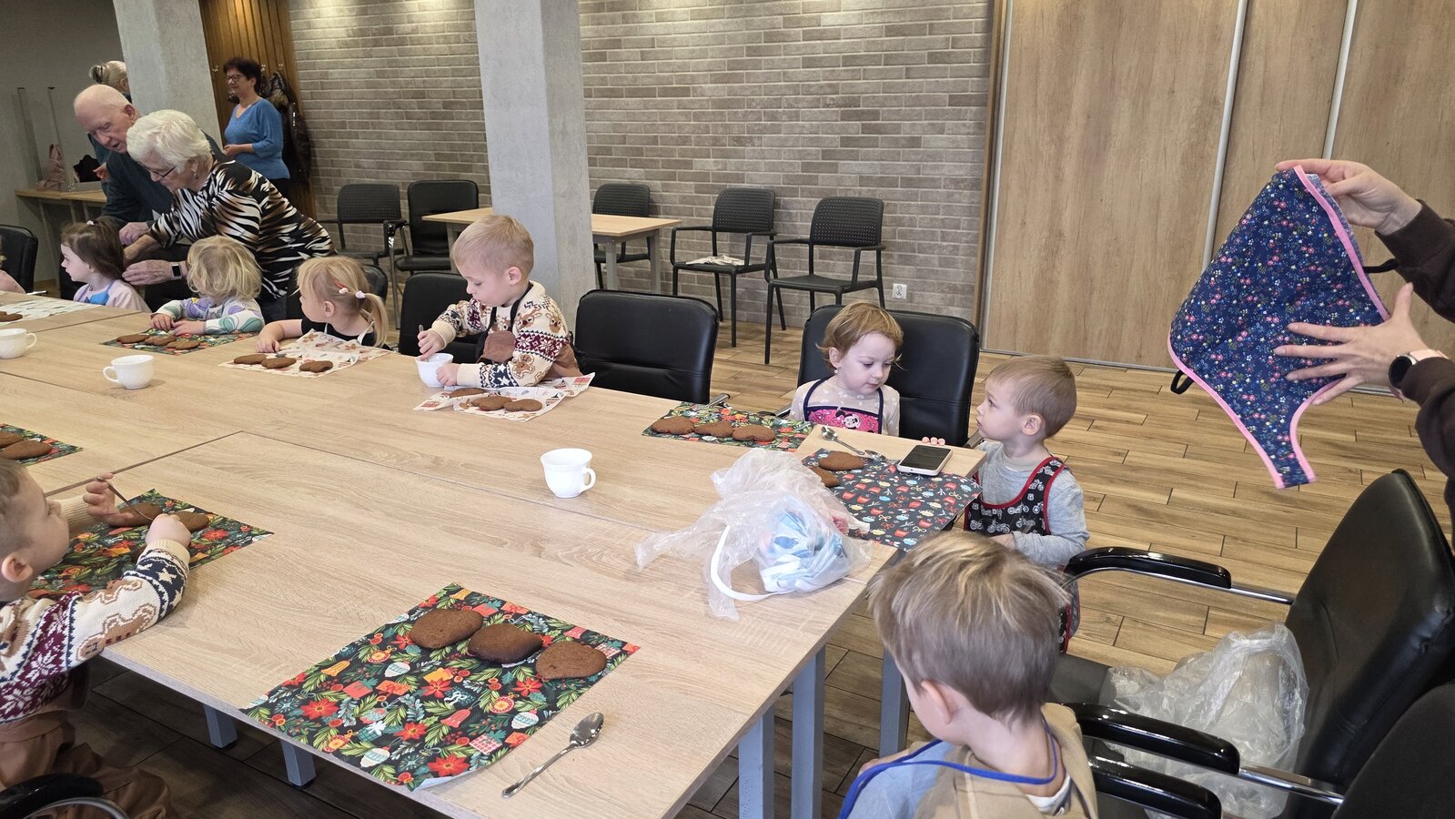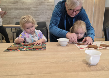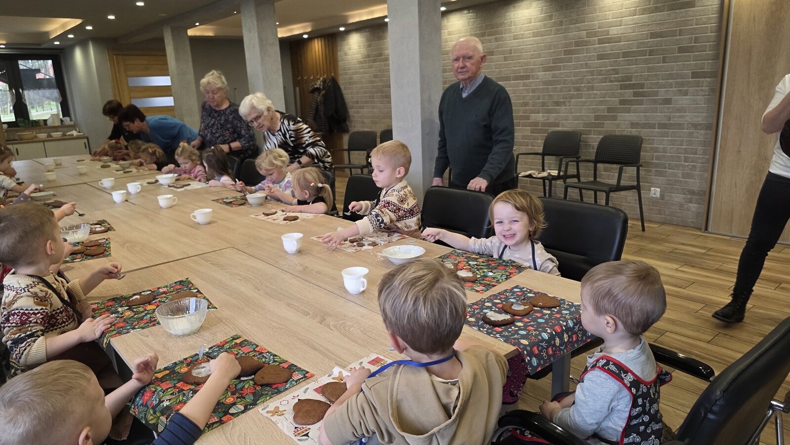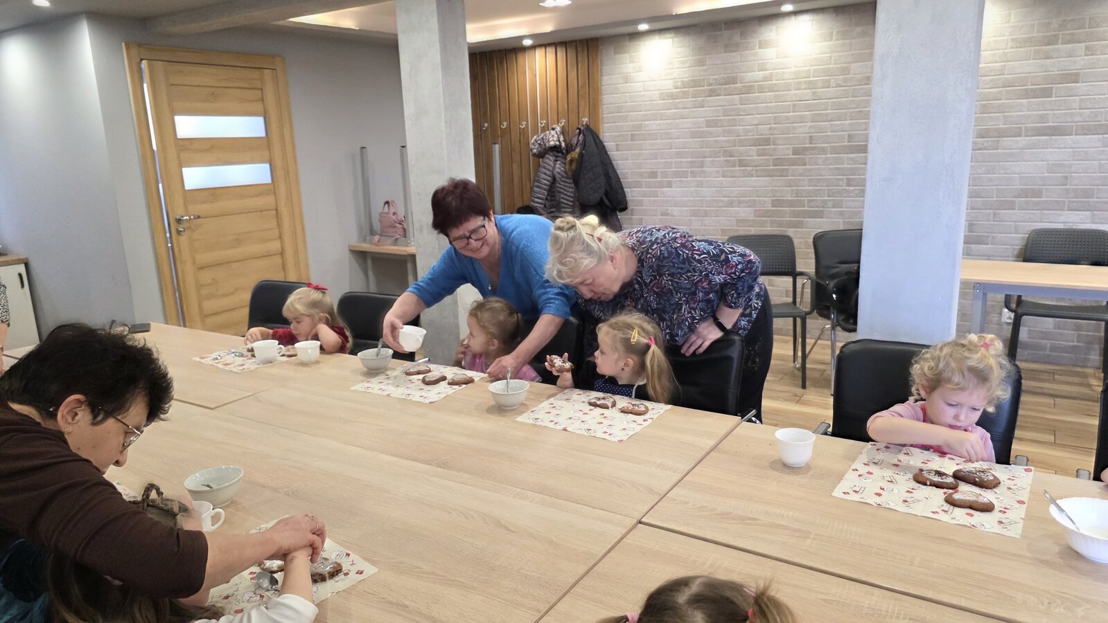 Na dzieciaczki czekały już gotowe stanowiska do dekorowania pierników – lukier oraz kolorowa posypka. Wszyscy po ubraniu fartuszków, zabrali się z entuzjazmem do pracy! Nasi Seniorzy starali się jak mogli, żeby pomóc maluchom w pracy. Efekt był świetny! Wszyscy przygotowali po trzy serduszka, które zabrali ze sobą do domów.