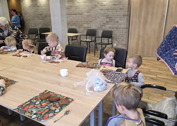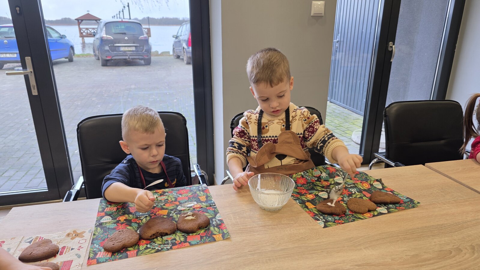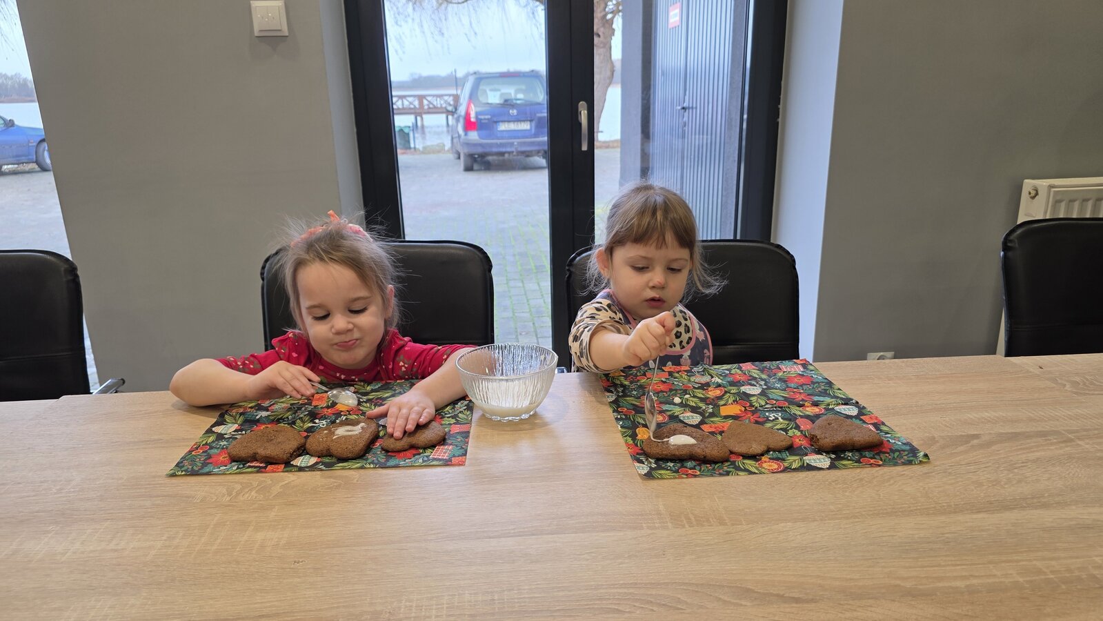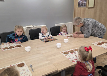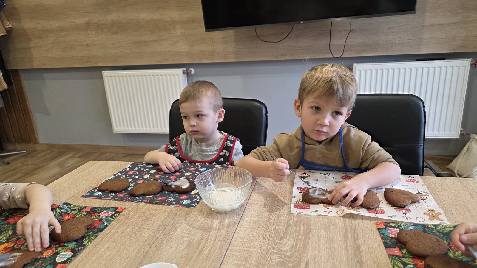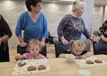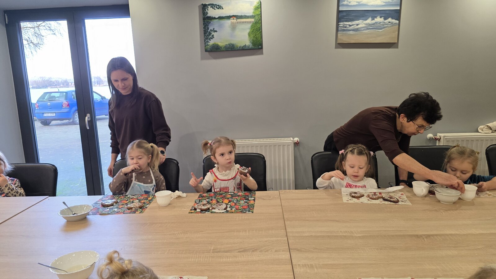 Na dzieciaczki czekały już gotowe stanowiska do dekorowania pierników – lukier oraz kolorowa posypka. Wszyscy po ubraniu fartuszków, zabrali się z entuzjazmem do pracy! Nasi Seniorzy starali się jak mogli, żeby pomóc maluchom w pracy. Efekt był świetny! Wszyscy przygotowali po trzy serduszka, które zabrali ze sobą do domów.