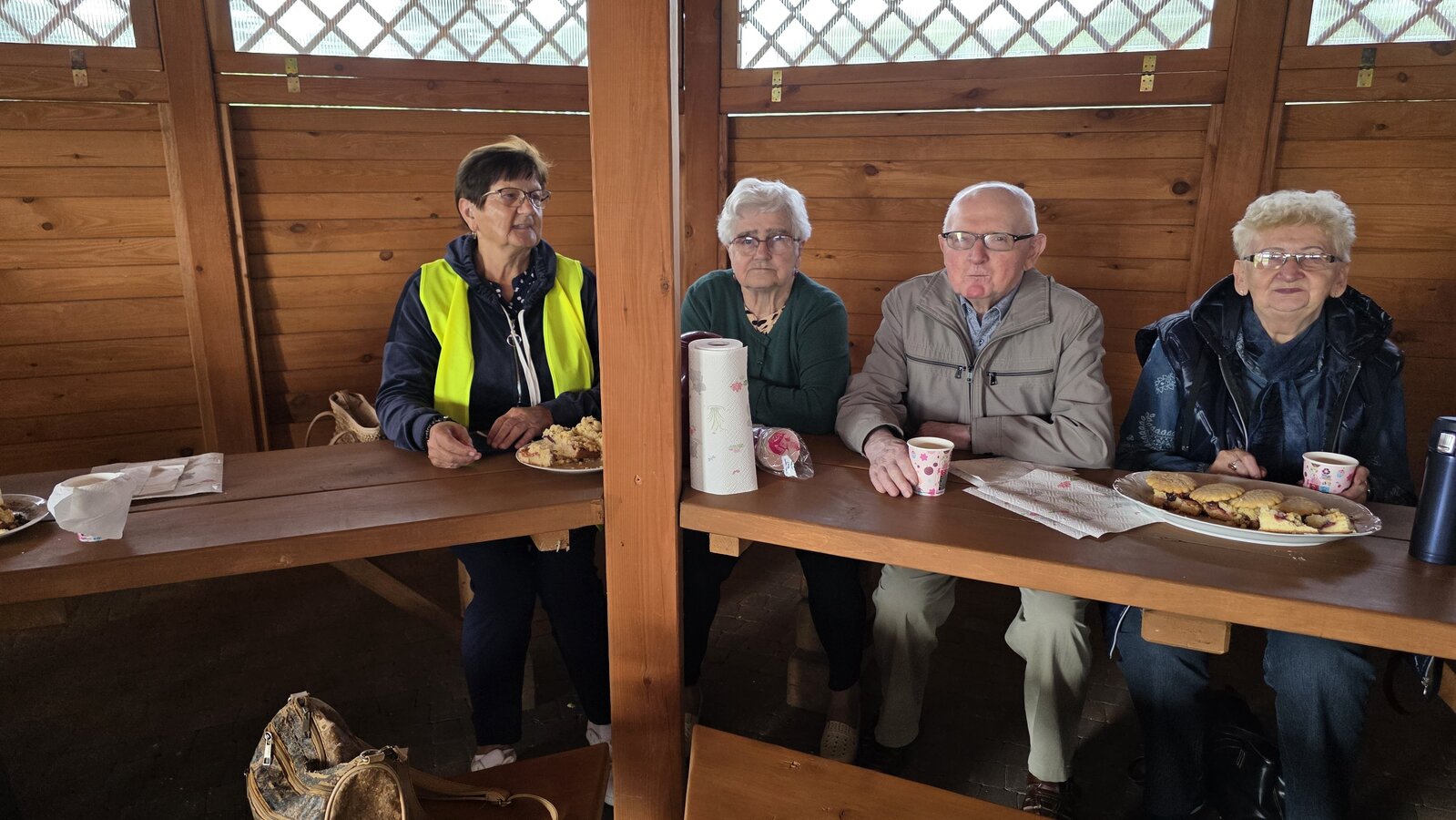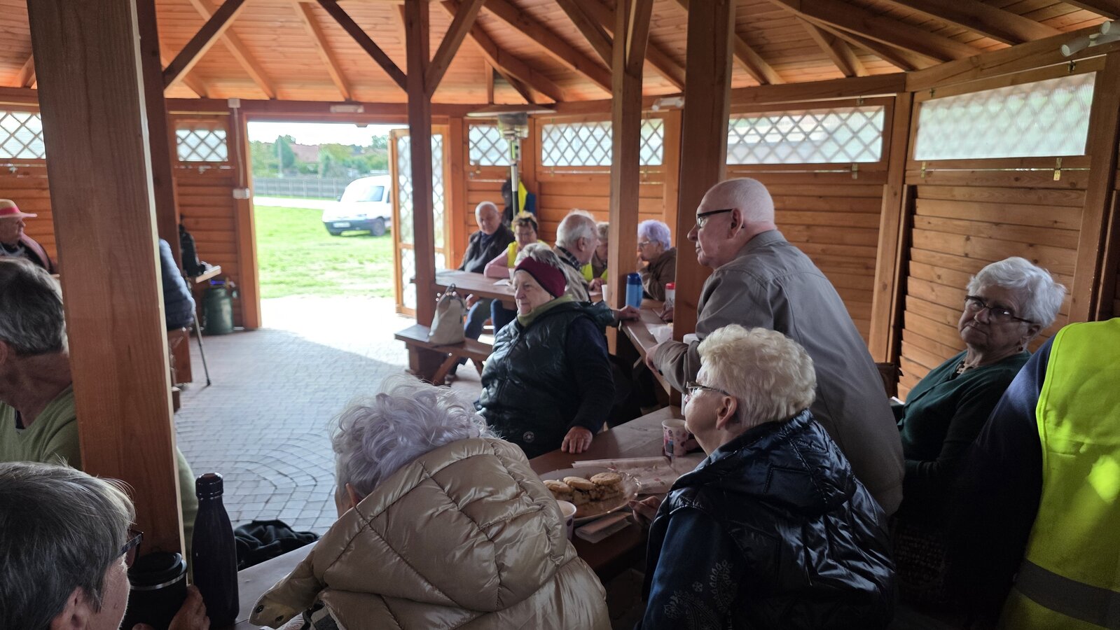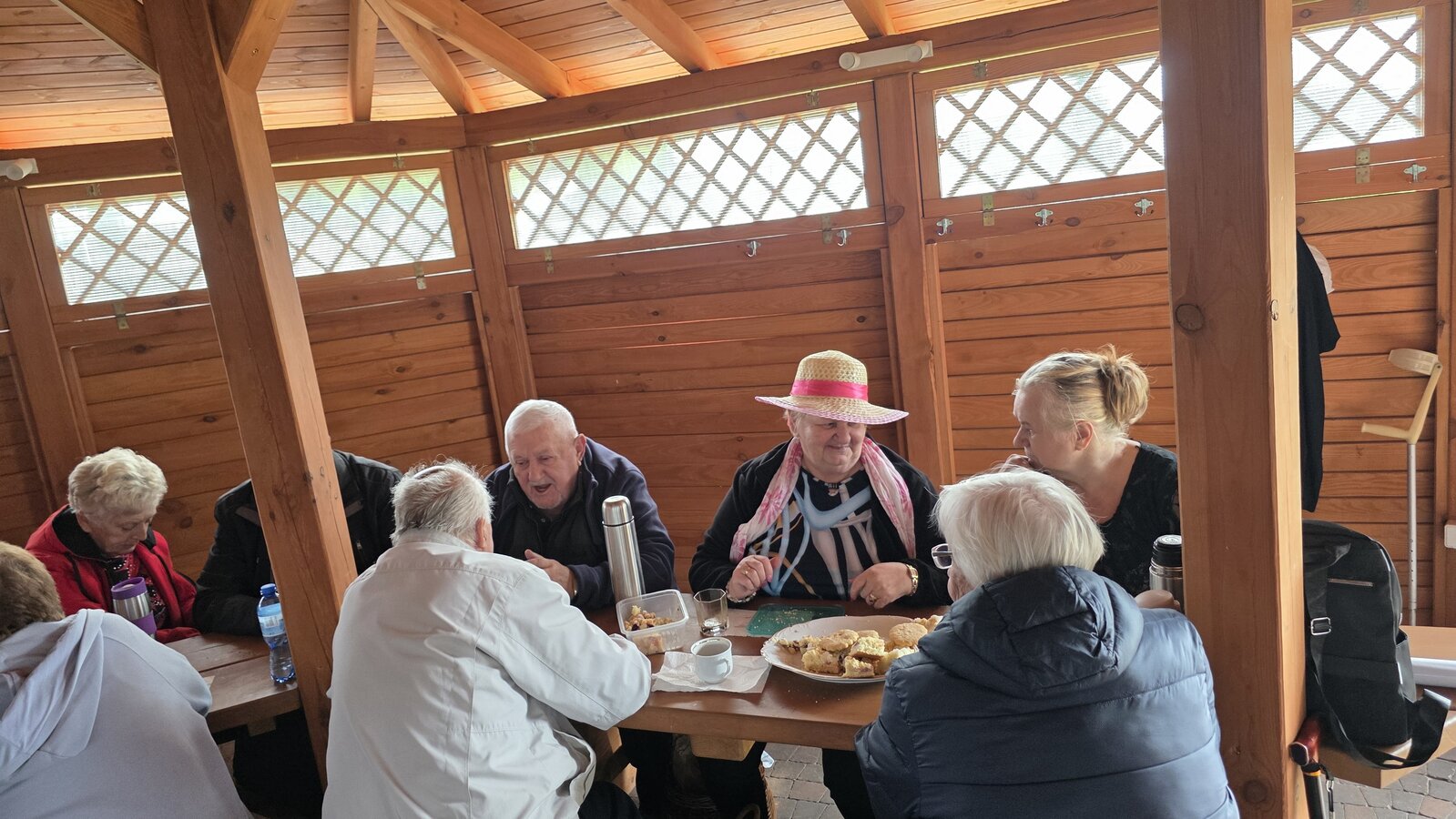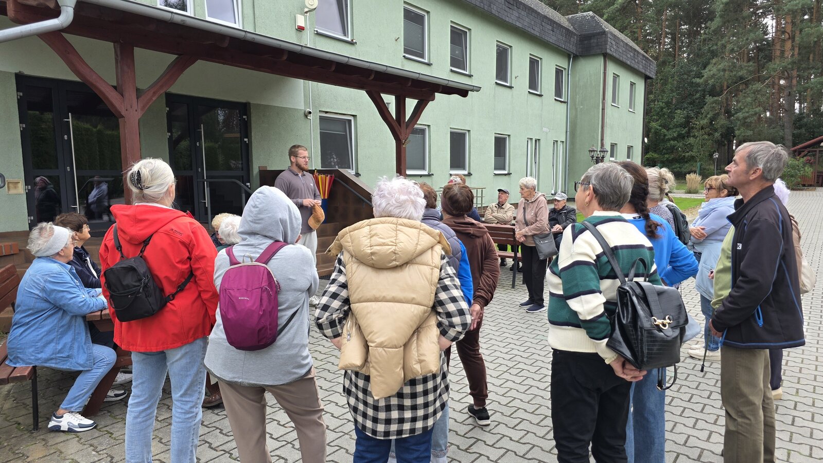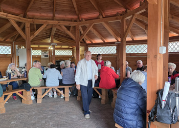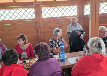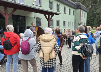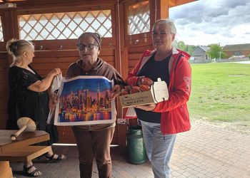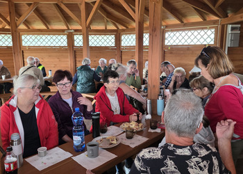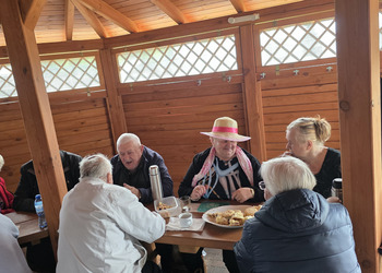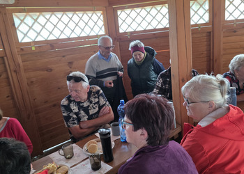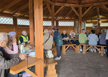 We wtorek 16 września 2025 r. Seniorzy udali się na rowerówkę do Zaborówca. Na miejscu czekali na nas klubowicze z Zaborówca, którzy przygotowali altankę specjalnie na nasze przybycie. Czekało na nas ciasto drożdżowe i kawa. Po poczęstunku pani Ela przygotowała dla nas niespodziankę – szukanie kolorowych muszelek. Oprócz muszelek znalazły się również grzybki. Zwycięzcy poszukiwań otrzymali nagrody – obraz wyklejany diamencikami oraz kartonik pomidorów. Później poszliśmy do Archidiecezjalnego Domu Rekolekcyjnego, gdzie oprowadził nas po nim dyrektor Konrad Perz. Poznaliśmy historię tego miejsca oraz odwiedziliśmy kaplicę św. Urszuli Ledóchowskiej. Na koniec czekał na nas w altance obiad z Kogucika.
