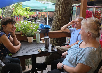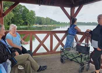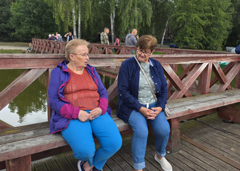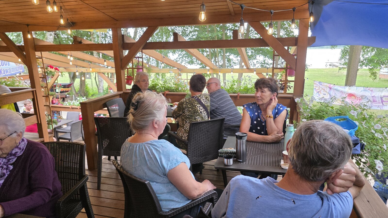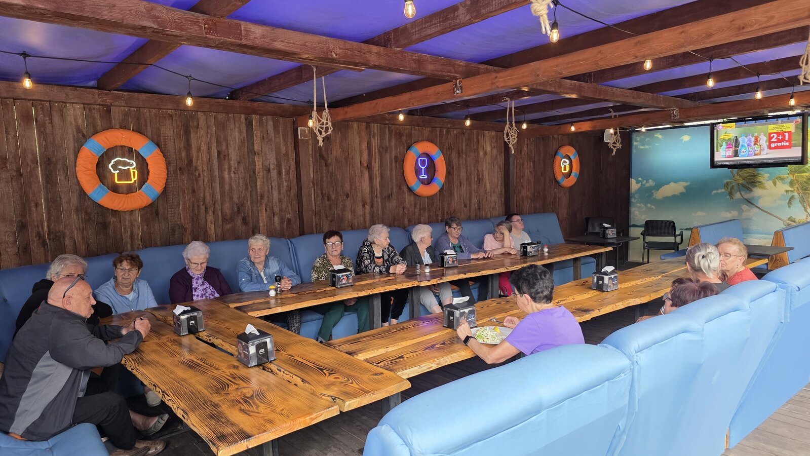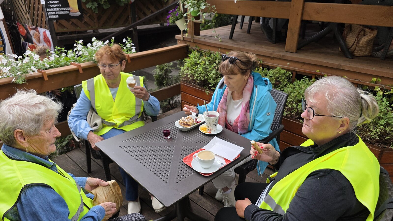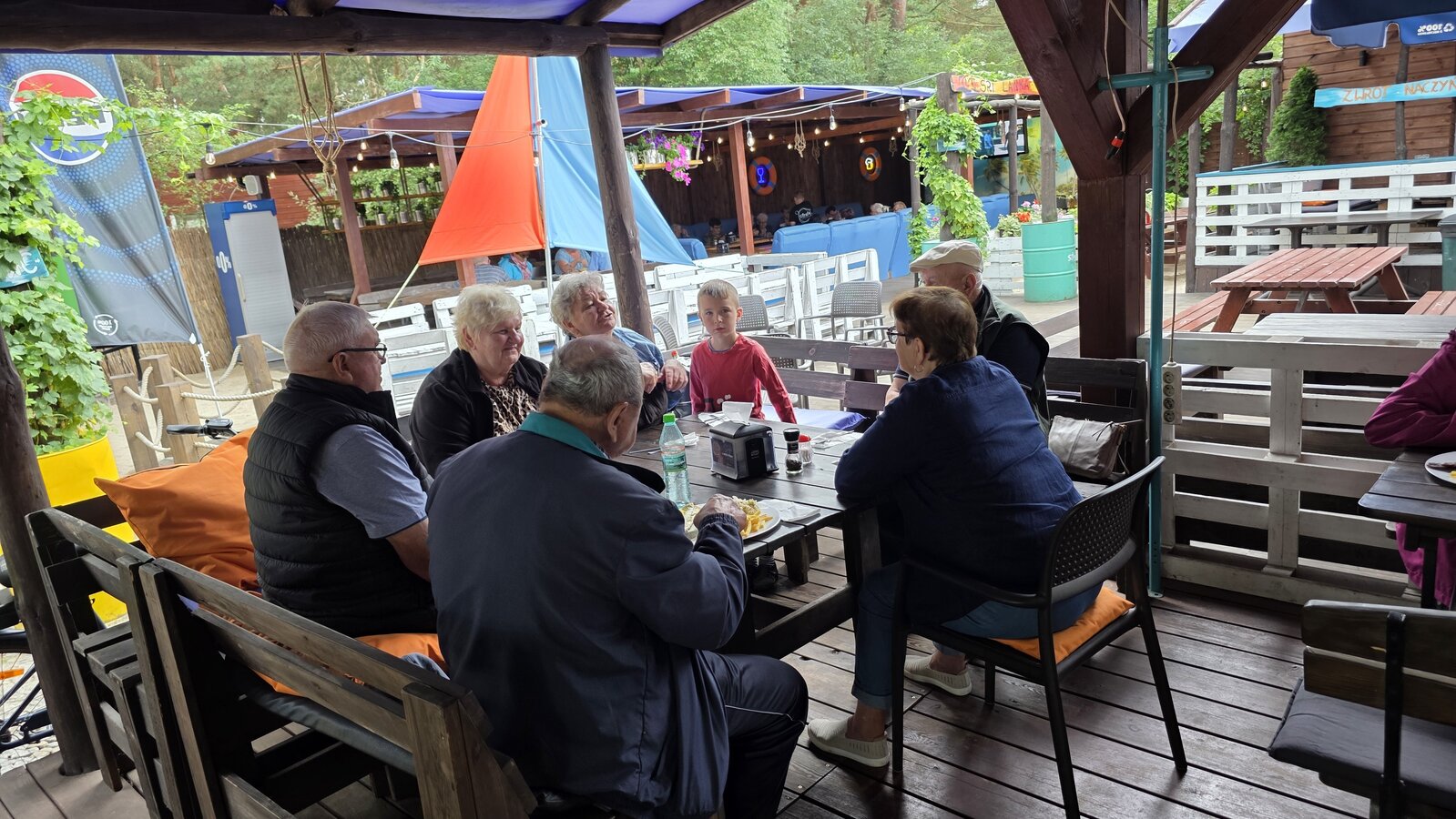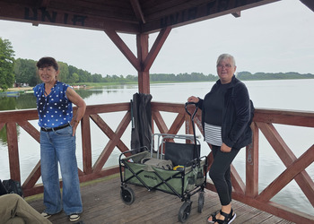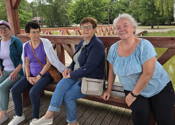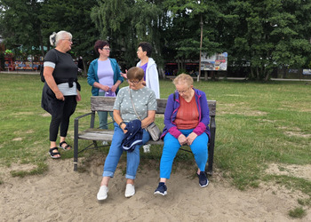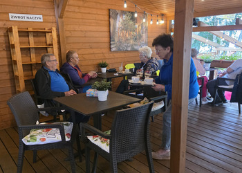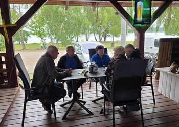 Najpierw jednak przystanęliśmy w Słodkim Zakątku na kawę i ciacho. Zjedliśmy pyszne desery, lody i ciasta. Później była chwila czasu wolnego. Część spędziła go na plaży, inni spacerując po molku a jeszcze inni obserwowali jezioro z ogródków. W końcu przyszedł czas na upragnioną rybkę! Wszyscy ze smakiem ją zajadali a ogromne porcje szokowały naszych Seniorów! Jest to z pewnością najlepsza ryba w naszej okolicy! Polecamy wszystkim!