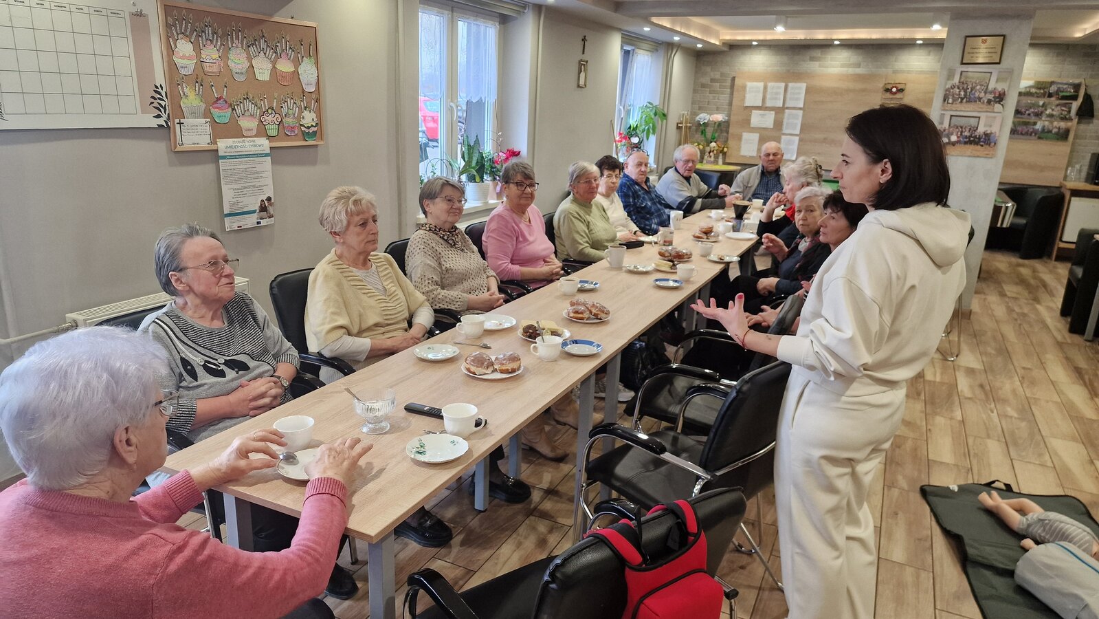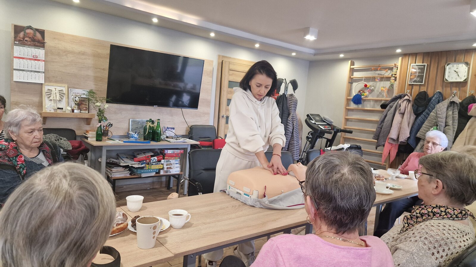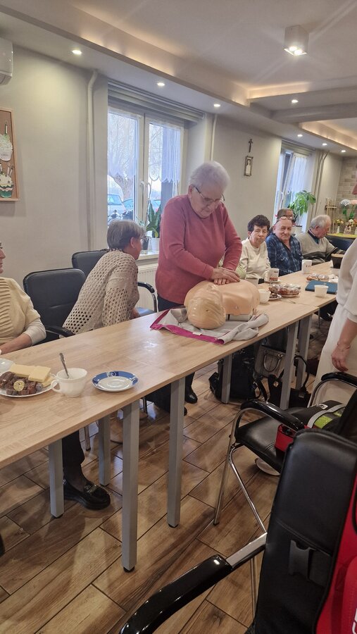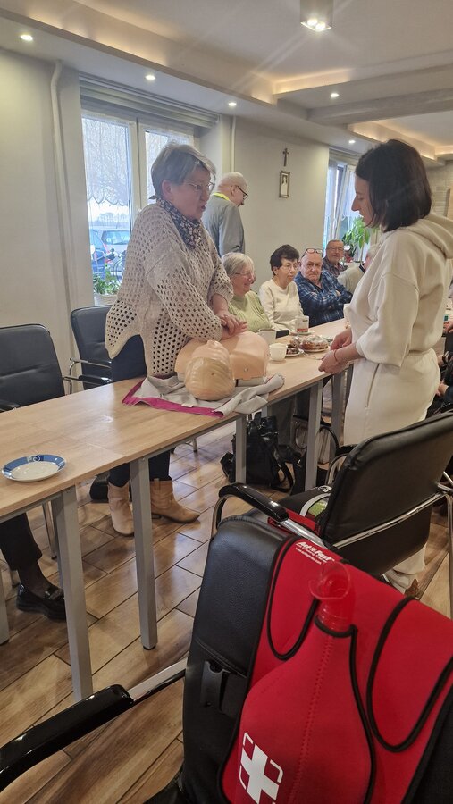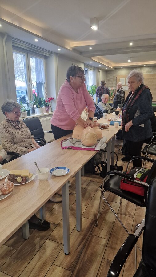 Nigdy nie wiadomo kiedy może przydać się umiejętność udzielenia pierwszej pomocy. Dlatego też w piątek, 28 lutego, odbyło się szkolenie, które przeprowadziła pani Anita Solarczyk. Seniorzy dowiedzieli się jak przeprowadzić resuscytację krążeniowo-oddechową oraz jak udzielić pomocy osobie dławiącej się. Zapoznali się też z obsługą urządzenia AED, które może uratować życie za pomocą impulsu elektrycznego w celu przywrócenia prawidłowego rytmu serca. Pani Anita przypomniała również zasady pierwszej pomocy w przypadku oparzenia, złamania, krwawienia, zawału serca czy też udaru. Seniorzy mieli możliwość użycia w praktyce uzyskanej wiedzy, co sprawiło im wiele radości.