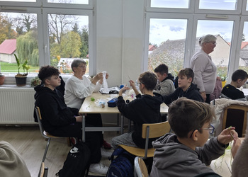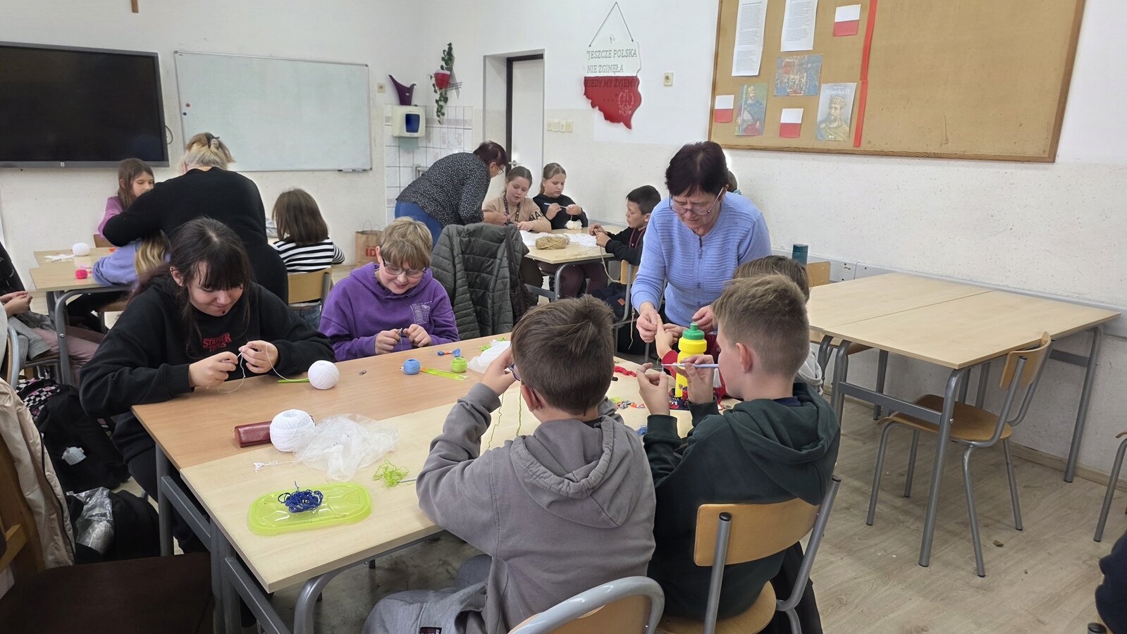 Jak co roku, tym razem we wtorek 28 października, nasze Seniorki z sekcji szydełkowej: panie Renata, Elżbieta, Rozalia, Teresa, Aniela oraz Zosia zostały zaproszone przez panią Monikę Rękoś na lekcje techniki w klasie 5. Wizyta Seniorek w szkole na zajęciach z szydełkowania to jeden z tych momentów, które choć z pozoru drobne, zostają w pamięci na długo. To spotkanie dwóch światów: młodych, często zabieganych uczniów oraz doświadczonych kobiet, które niosą ze sobą spokój, cierpliwość i historie utkane tak samo gęsto jak ich robótki.