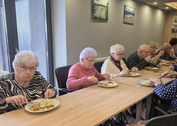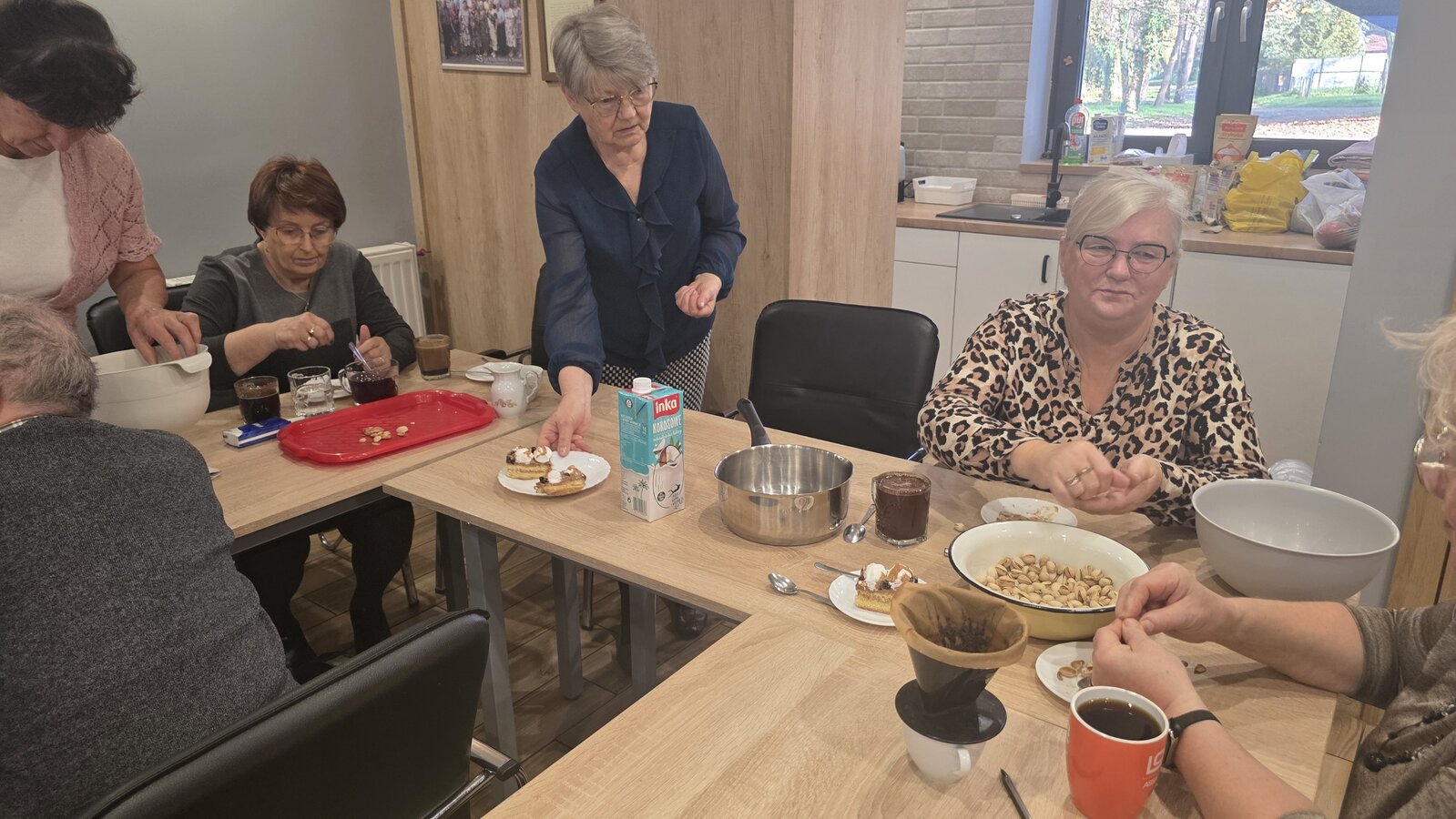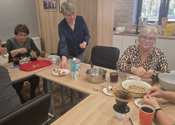 Było to spotkanie pełne smaku, wiedzy i dobrej zabawy! Pod czujnym okiem dietetyczki, Seniorzy uczyli się jak przygotowywać zdrowe, lekkie i pyszne potrawy, które nie tylko cieszą podniebienie, ale też wspierają nasze zdrowie. Wszyscy z zapałem pomagali jak mogli, żeby pomóc w przygotowaniu obiadu oraz deseru. Na stole pojawiło się kaszotto z grzybami i cukinią, surówka z kapusty pekińskiej oraz łosoś z panierką pieczony w piekarniku. Dla osób nie jedzących ryb, był oczywiście kurczak. Na deser pojawiły się nasiona chia z owocami.