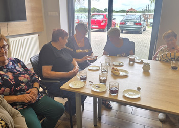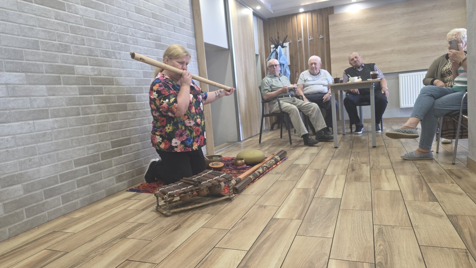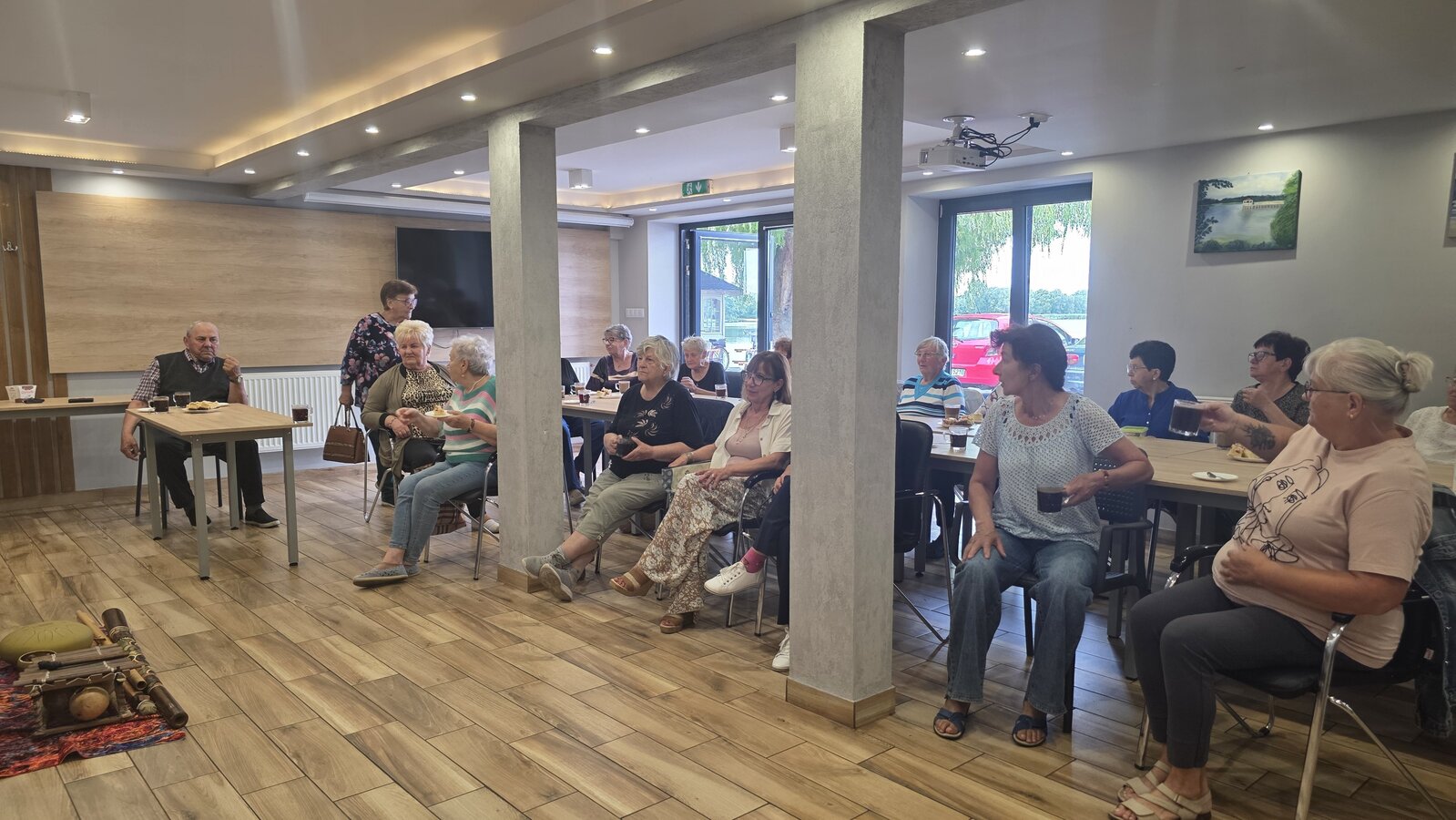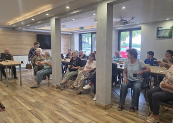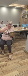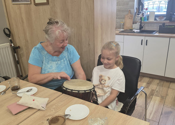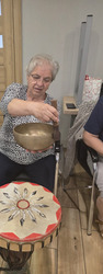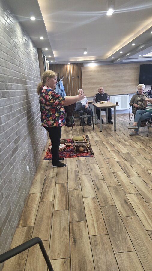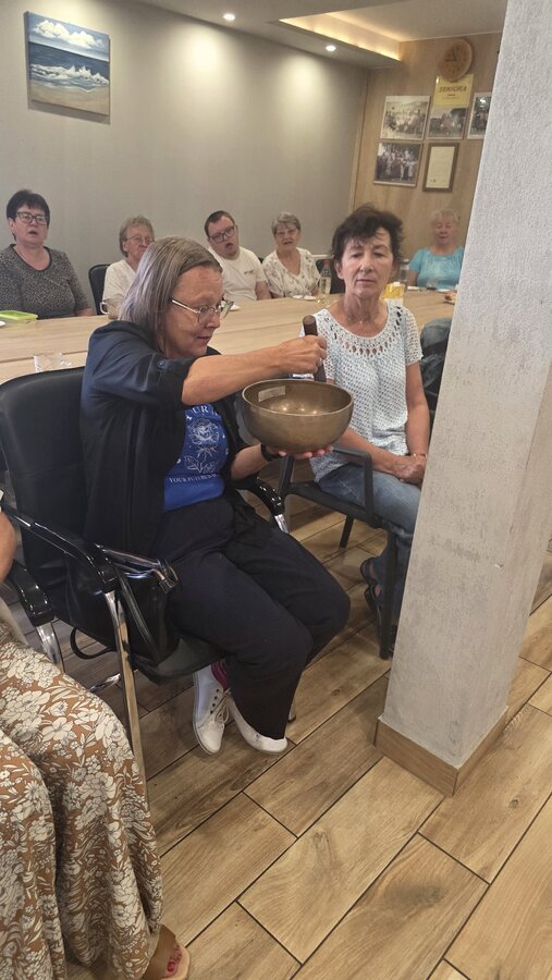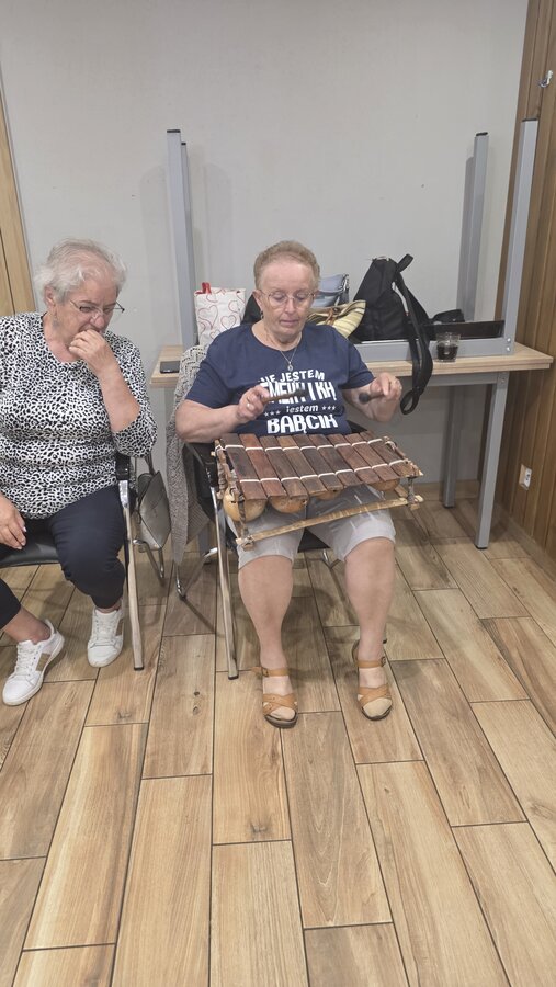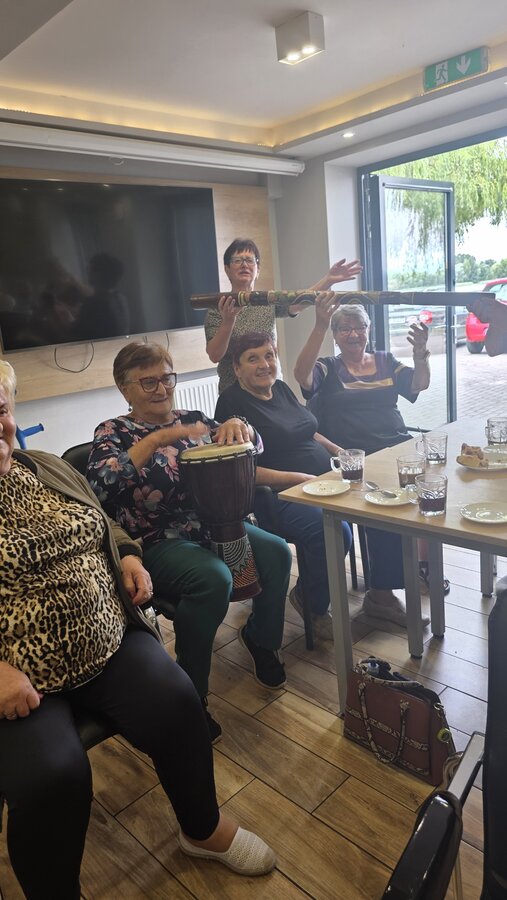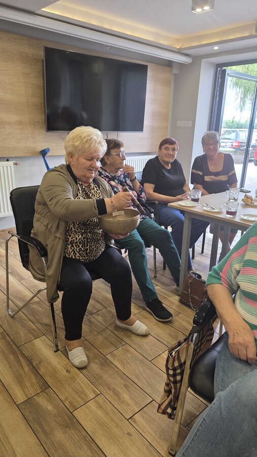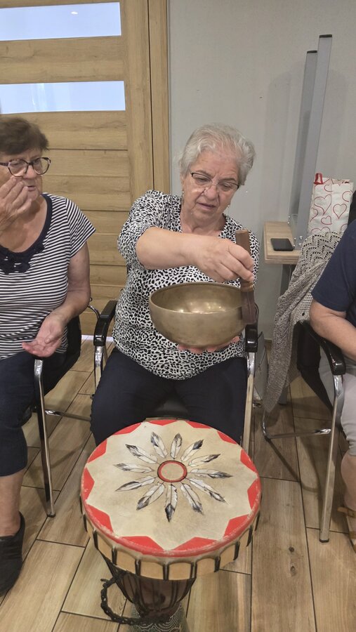 A na koniec tygodnia (piątek, 18 lipca 2025) czekały na naszych Seniorów fantastyczne zajęcia i to nie byle jakie, bo zajęcia z muzykoterapii. Poprowadziła je pani Magdalena Wasyluk z Wijewa, która muzykoterapię holistyczną studiowała w Czechach u samego twórcy – Lubomira Holzera. Pani Magda opowiedziała o swojej pracy i jednocześnie pasji jaką jest muzyka i muzykoterapia. Opowiedziała o instrumentach, które ze sobą przywiozła, a także na nich zagrała! Seniorzy z zachwytem i zainteresowaniem słuchali naszego gościa, który niewątpliwie sprawił im wiele radości muzyką! Uśmiech nie schodził im z twarzy, tym bardziej że mogli na tych instrumentach również sami zagrać…