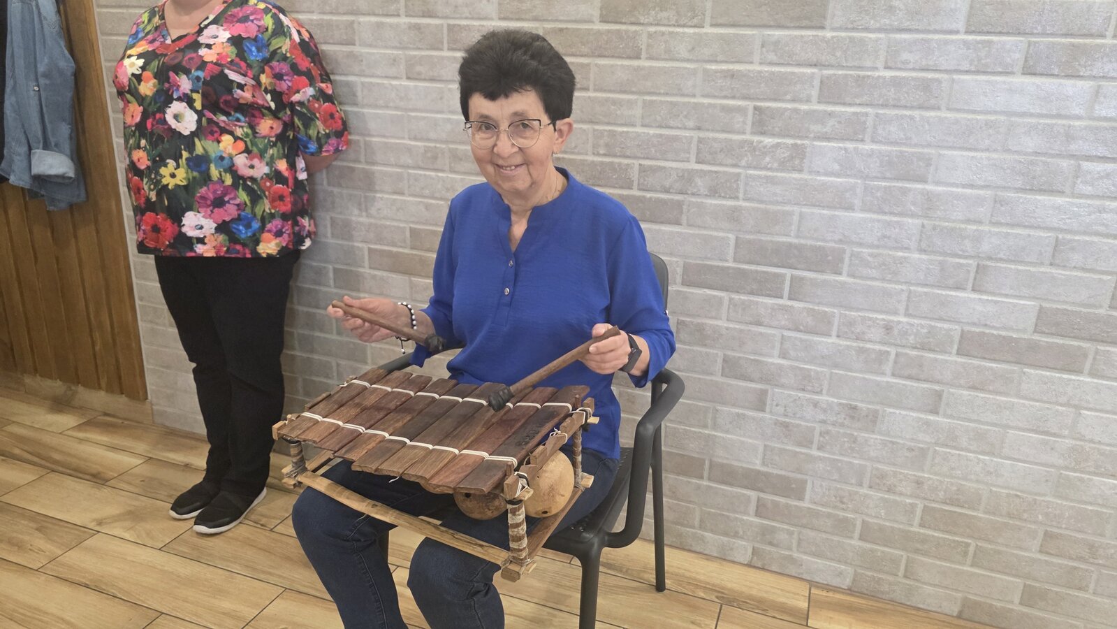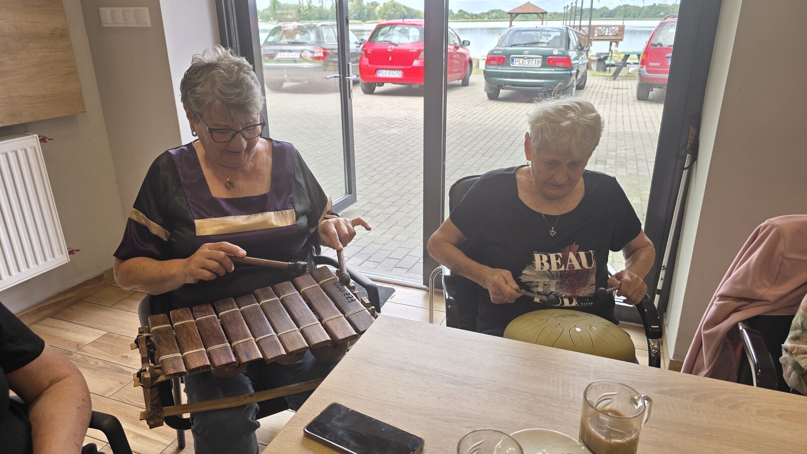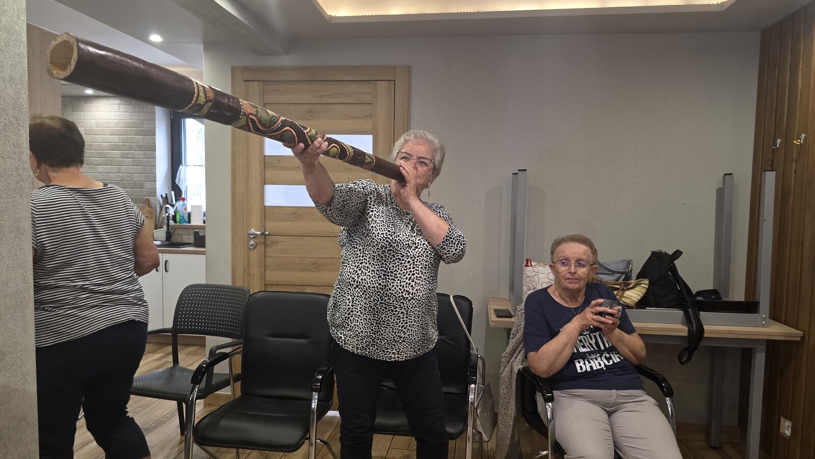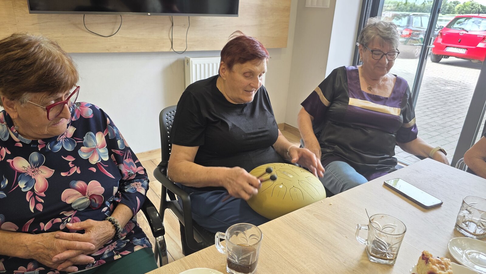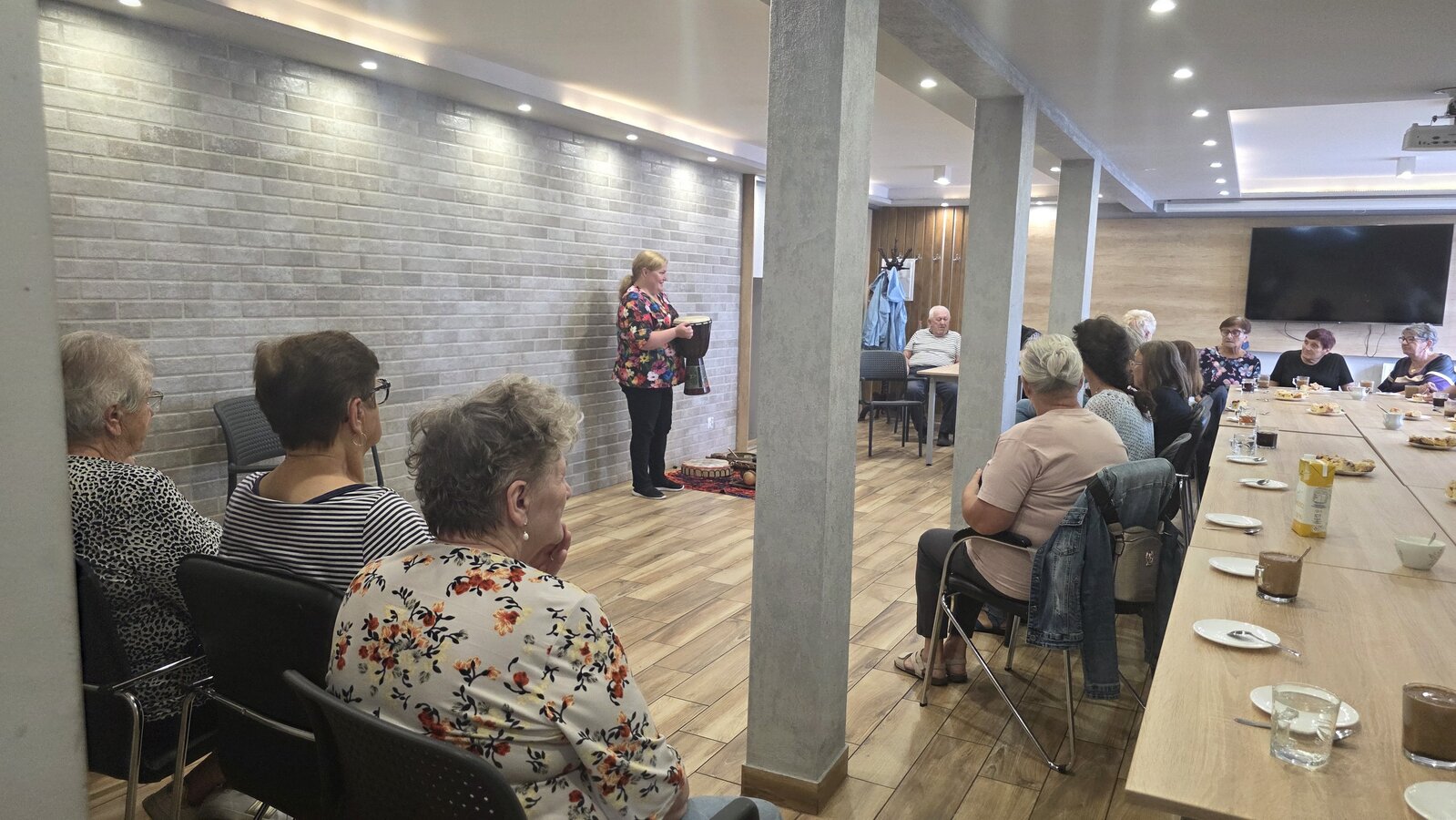 A na koniec tygodnia (piątek, 18 lipca 2025) czekały na naszych Seniorów fantastyczne zajęcia i to nie byle jakie, bo zajęcia z muzykoterapii. Poprowadziła je pani Magdalena Wasyluk z Wijewa, która muzykoterapię holistyczną studiowała w Czechach u samego twórcy – Lubomira Holzera. Pani Magda opowiedziała o swojej pracy i jednocześnie pasji jaką jest muzyka i muzykoterapia. Opowiedziała o instrumentach, które ze sobą przywiozła, a także na nich zagrała! Seniorzy z zachwytem i zainteresowaniem słuchali naszego gościa, który niewątpliwie sprawił im wiele radości muzyką! Uśmiech nie schodził im z twarzy, tym bardziej że mogli na tych instrumentach również sami zagrać…