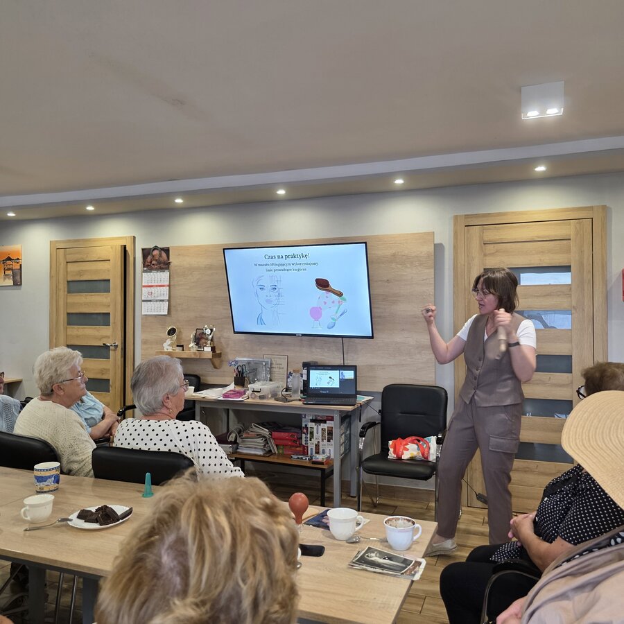Temat wykładu przyciągnął bardzo dużą liczbę Seniorek, co nas bardzo cieszy. Na początku spotkania pani Ewa opowiedziała o starzeniu się skóry, jak wygląda to zjawisko i jakie są jego główne objawy (zmarszczki, przebarwienia czy też wysuszenie skóry) oraz co robić żeby opóźnić ten proces, czyli masaże za pomocą różnych technik i różnych narzędzi. Panie dowiedziały się też jakie dodatkowe czynniki wpływają na zmianę w wyglądzie: bruksizm, stres, zła pozycja kręgosłupa, wady zgryzu czy też nieleczenie lub utrata zębów.