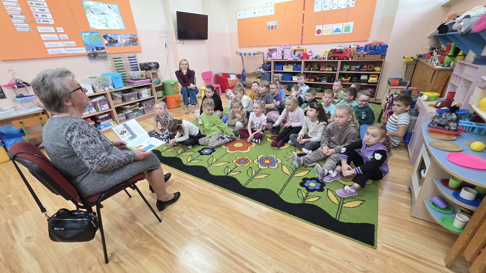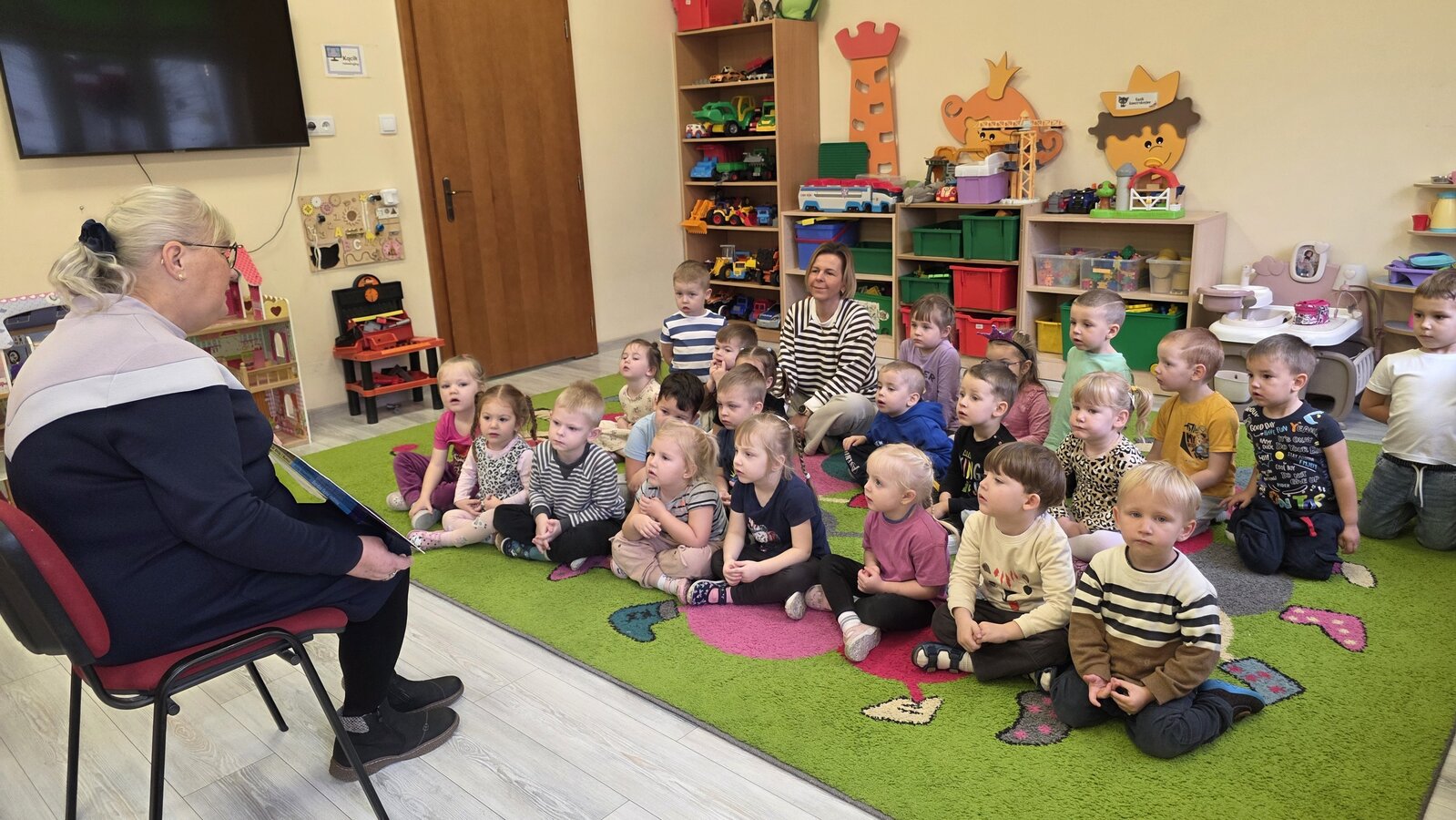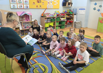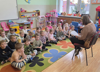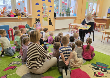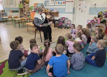 W salach panowała atmosfera zaciekawienia i radości. Dzieci siedziały zasłuchane, reagując śmiechem, zdziwieniem oraz pytaniami na kolejne fragmenty bajki.