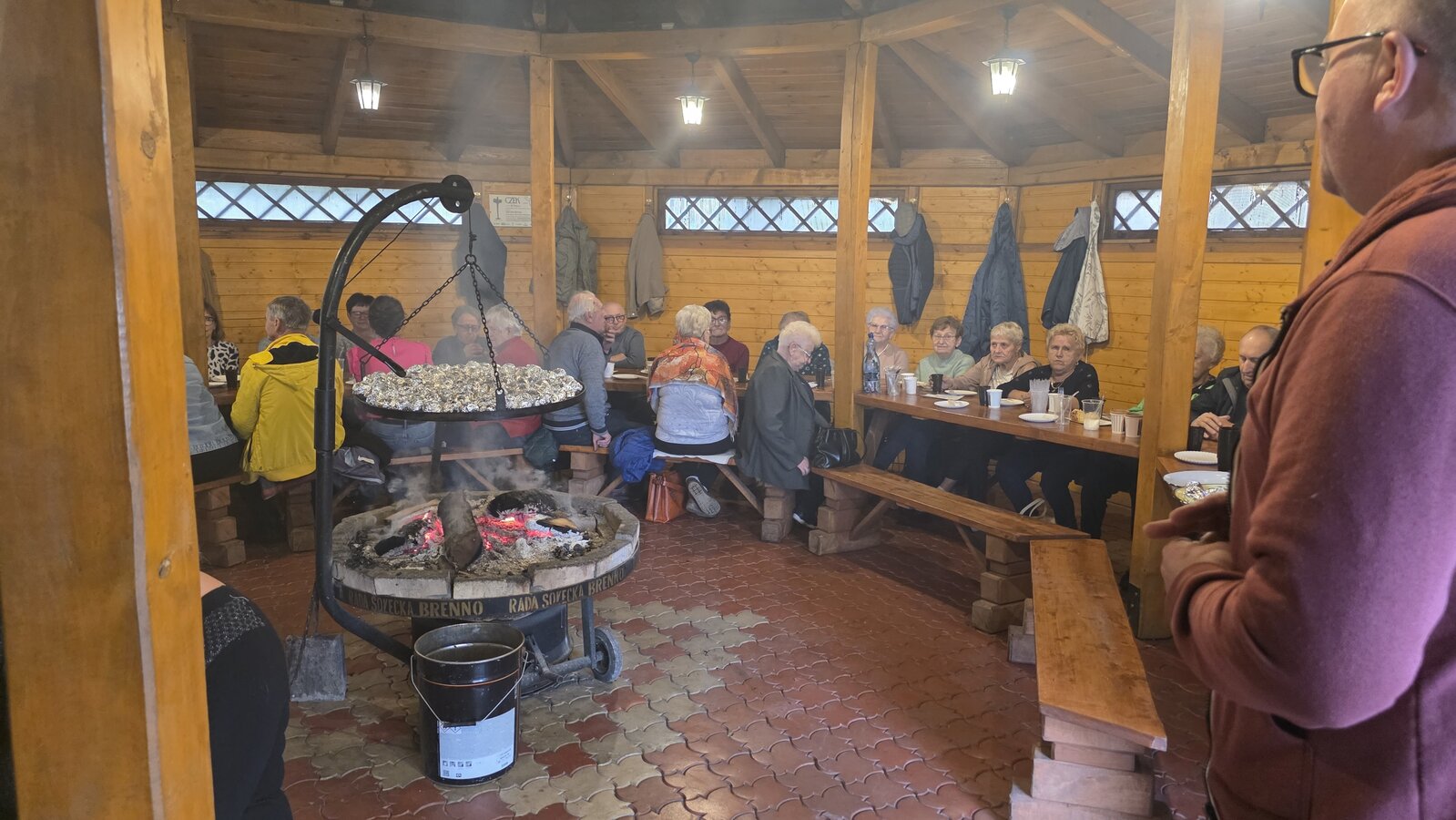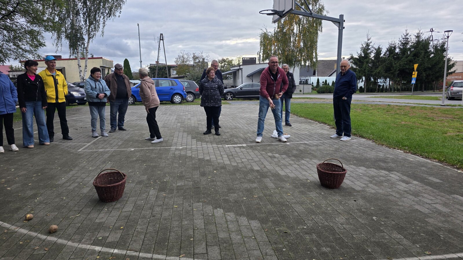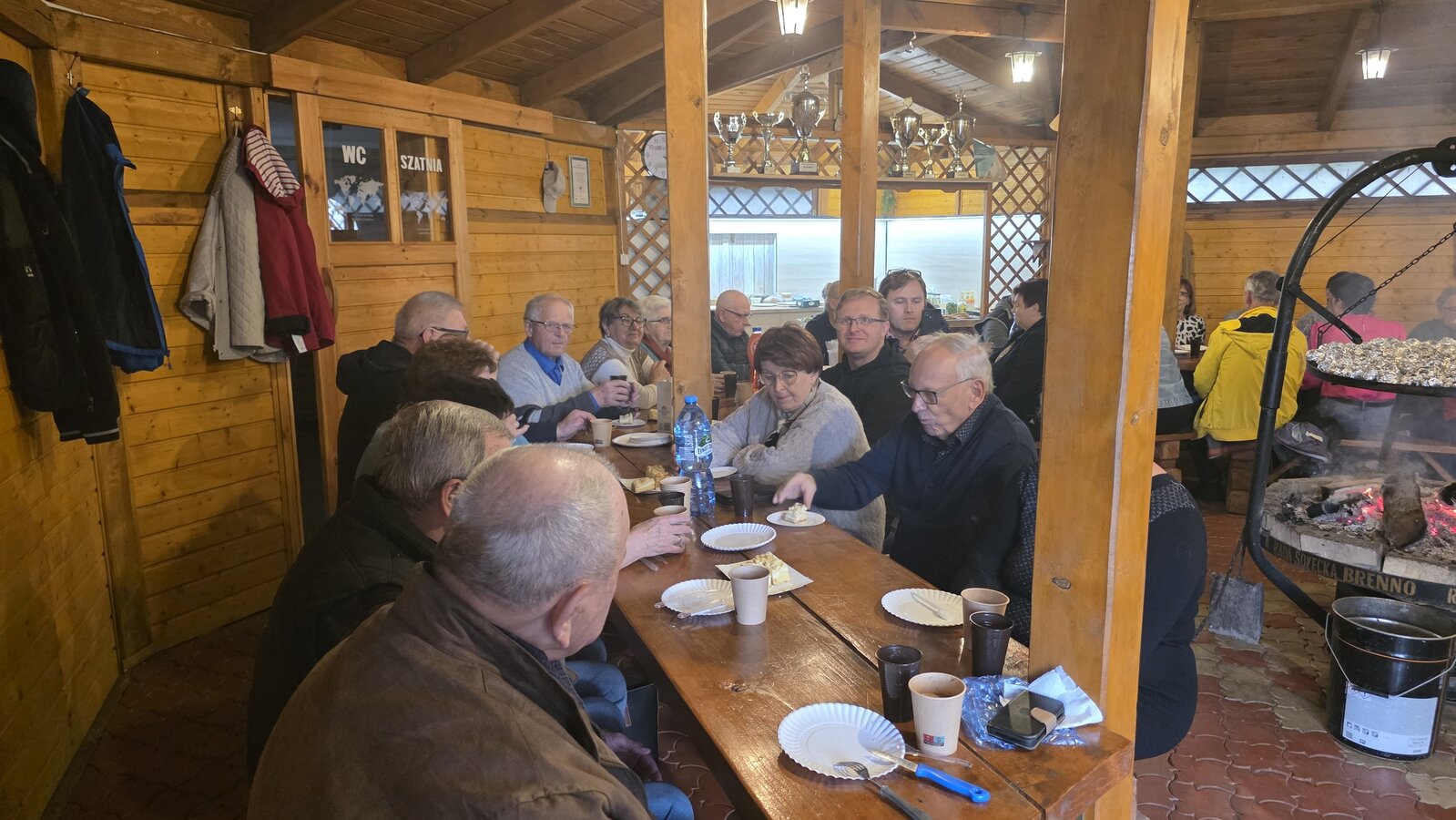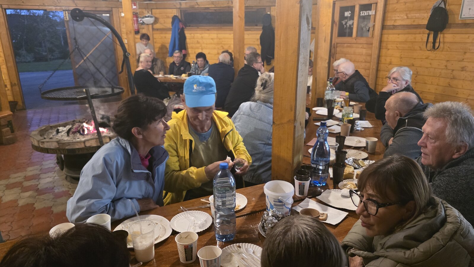 W czwartek 9 października 2025 r. odbyło się klubowe święto pyry. Seniorzy wraz z zaproszonymi gośćmi zebrali się w Altance na Kisowni i wspólnie biesiadowali. Najpierw była kawa i ciacho, a później pierwsza konkurencja – rzut ziemniakiem do koszyka. Wśród licznej grupy śmiałków, po dogrywce, zwycięzcą został pan Franek. Nie mogło zabraknąć również naszego klubowego MasterChefa. W tej edycji zwyciężczynią została pani Krysia ze swoimi krokietami ziemniaczanymi. W końcu nadszedł czas na pieczone ziemniaczki. Smakowały wybornie razem z gzikiem oraz chlebem ze smalcem i ogórkiem kiszonym. Lecz to jeszcze nie był koniec naszego świętowania! Kolejną konkurencją było obieranie pyrki tak, żeby obierka była jak najdłuższa. Tu też bezkonkurencyjny okazał się pan Franek z obierką o długości 51 cm.