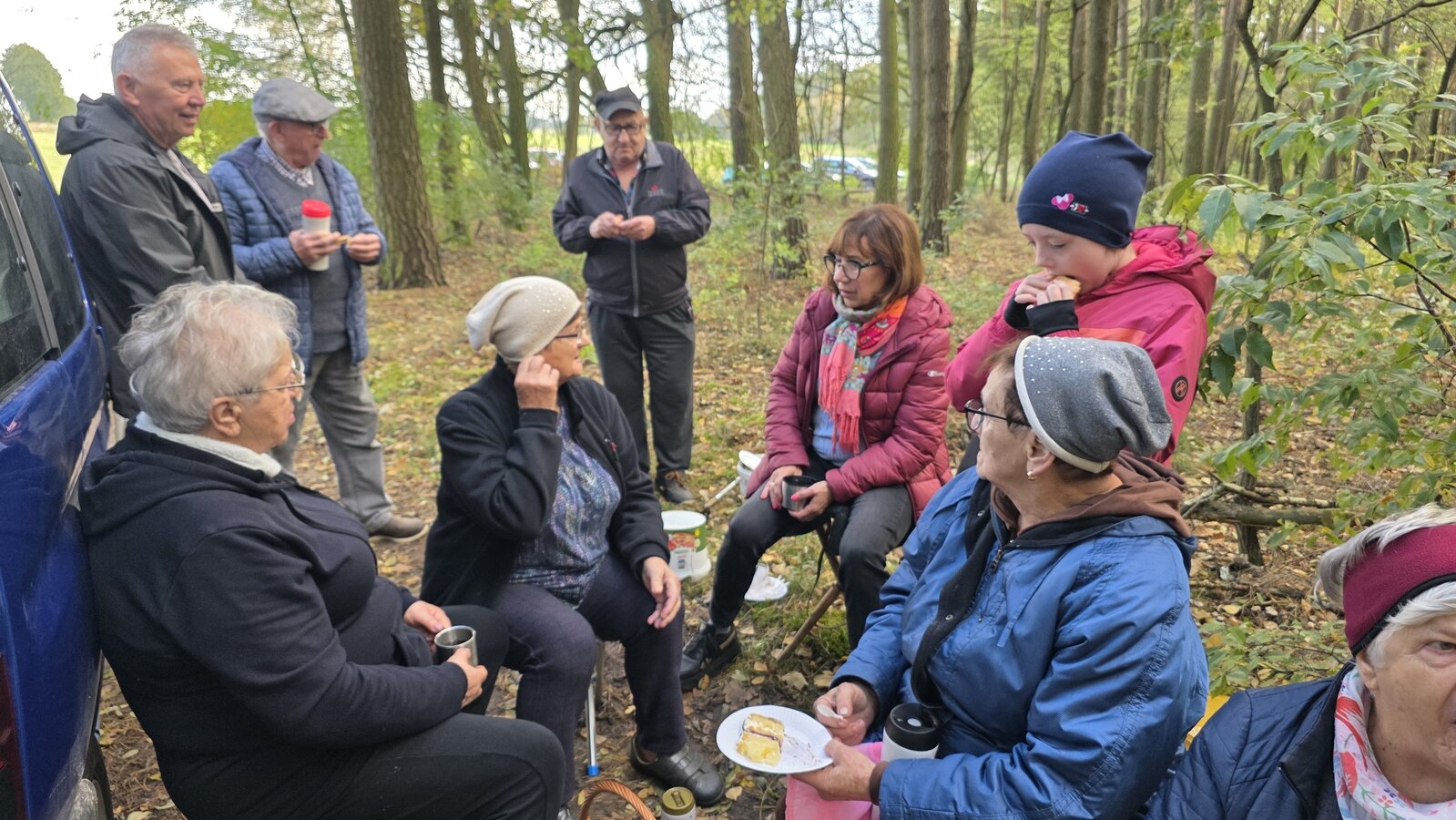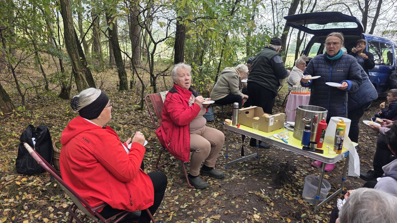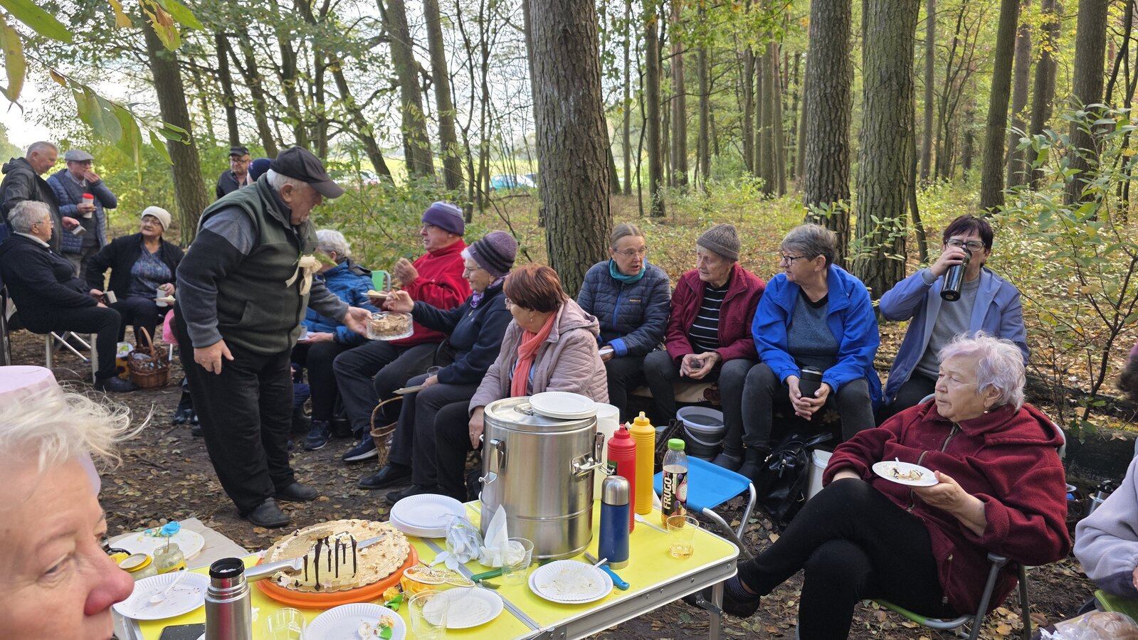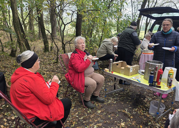 Po zakończonym zbieraniu wszyscy spotkaliśmy się na pikniku. Była kawa z termosów oraz bułki z parówką. Świętowaliśmy też 60-tą rocznicę ślubu pani Zosi i pana Stasia. Zaśpiewaliśmy naszym jubilatom „Sto lat”, złożyliśmy życzenia oraz wręczyliśmy upominek. Oni za to przywieźli dwa torty oraz mały poczęstunek.