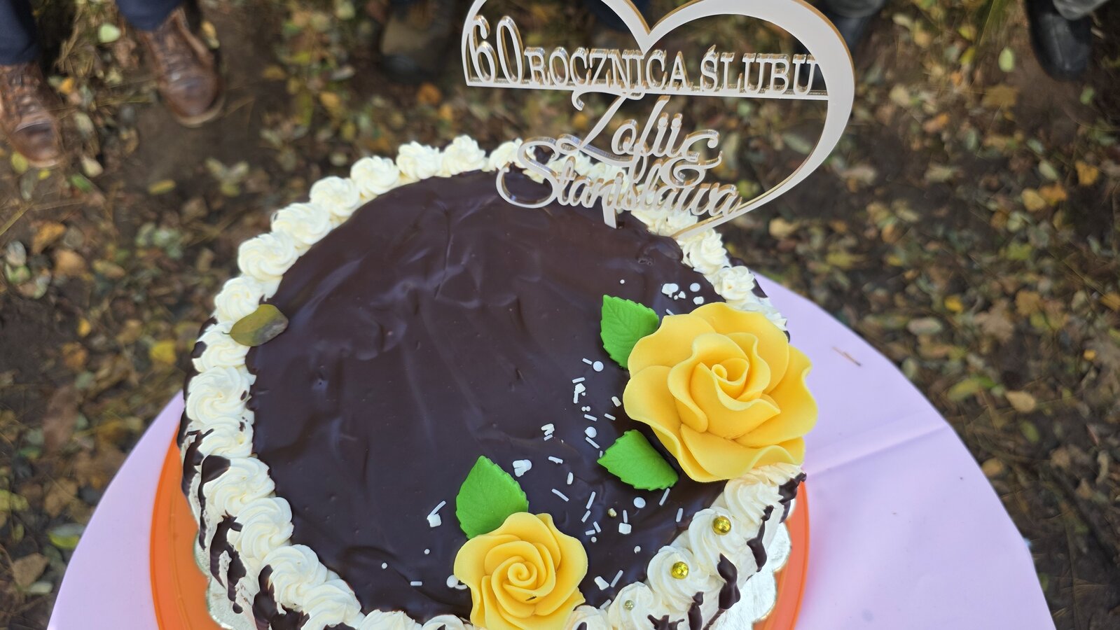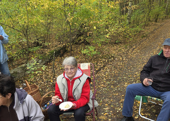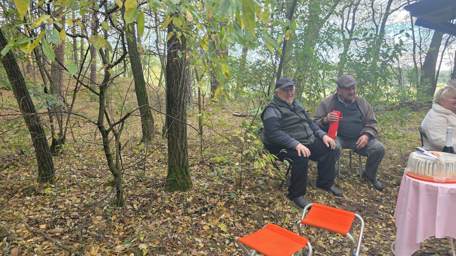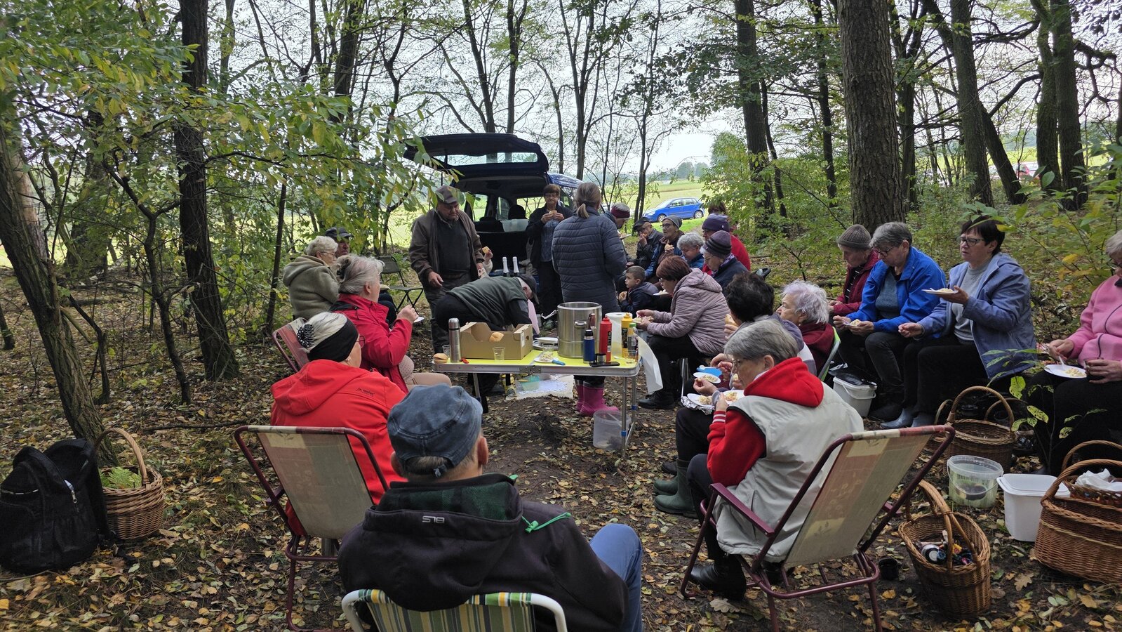 Po zakończonym zbieraniu wszyscy spotkaliśmy się na pikniku. Była kawa z termosów oraz bułki z parówką. Świętowaliśmy też 60-tą rocznicę ślubu pani Zosi i pana Stasia. Zaśpiewaliśmy naszym jubilatom „Sto lat”, złożyliśmy życzenia oraz wręczyliśmy upominek. Oni za to przywieźli dwa torty oraz mały poczęstunek.