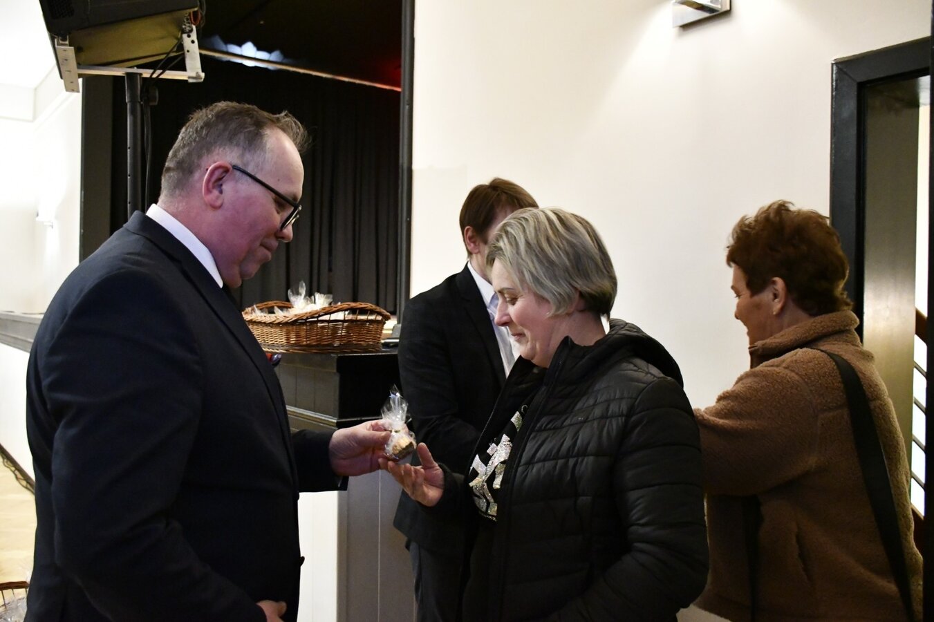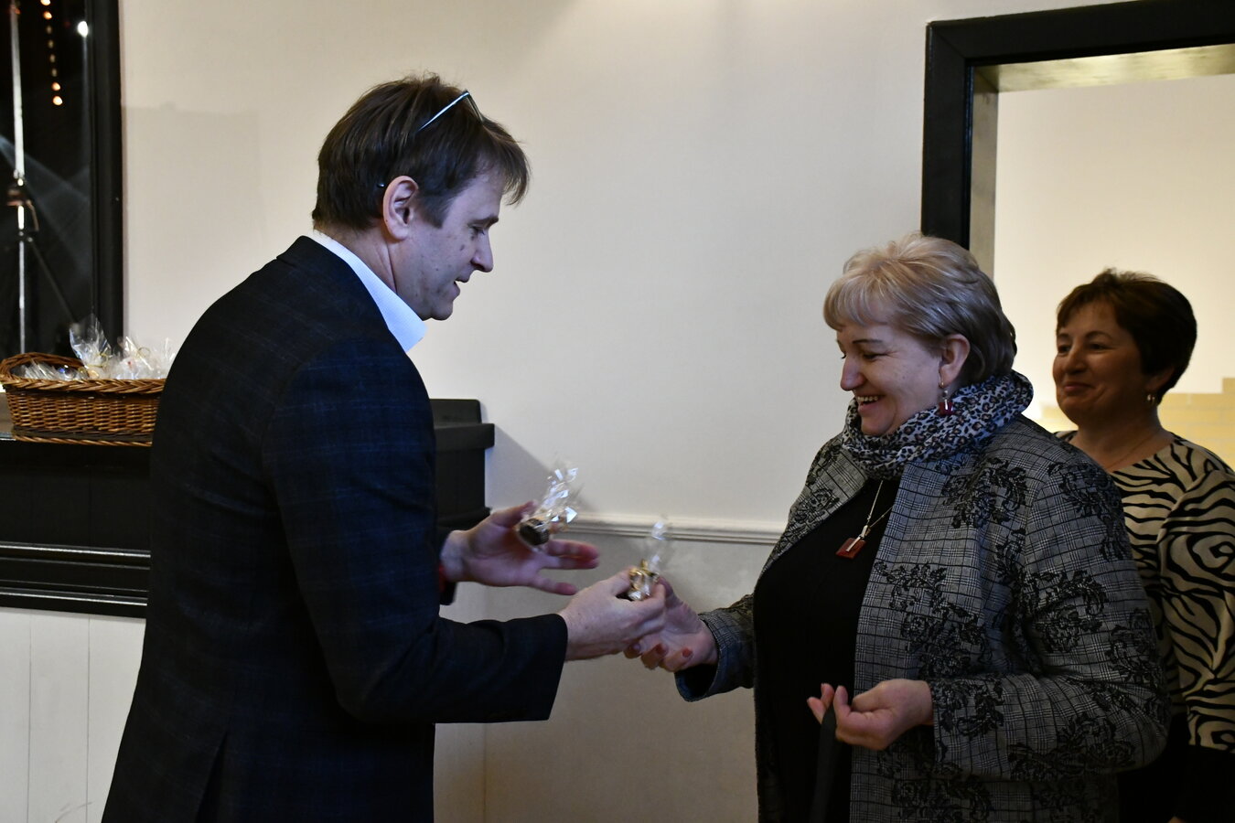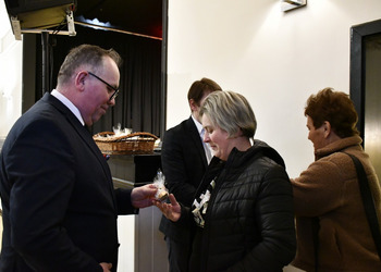 Na powitanie każda z pań otrzymała słodki upominek, który wręczali Wójt Gminy Wijewo, Pan Mieczysław Drożdżyński, Zastępca Wójta, Pan Waldemar Skrzypczak i Dyrektor Gminnego Ośrodka Kultury, Pan Leszek Bajon, składając serdeczne życzenia z okazji Dnia Kobiet.