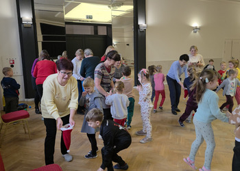 Panie wychowawczynie przygotowały dla Seniorek i dzieci wiele zadań. Były zabawy ruchowe, wyścigi rzędów oraz tańce i śpiew. Wszyscy doskonale sobie radzili z wyzwaniami, pomagając sobie i dopingując. Było wiele śmiechu i wyśmienitej zabawy.