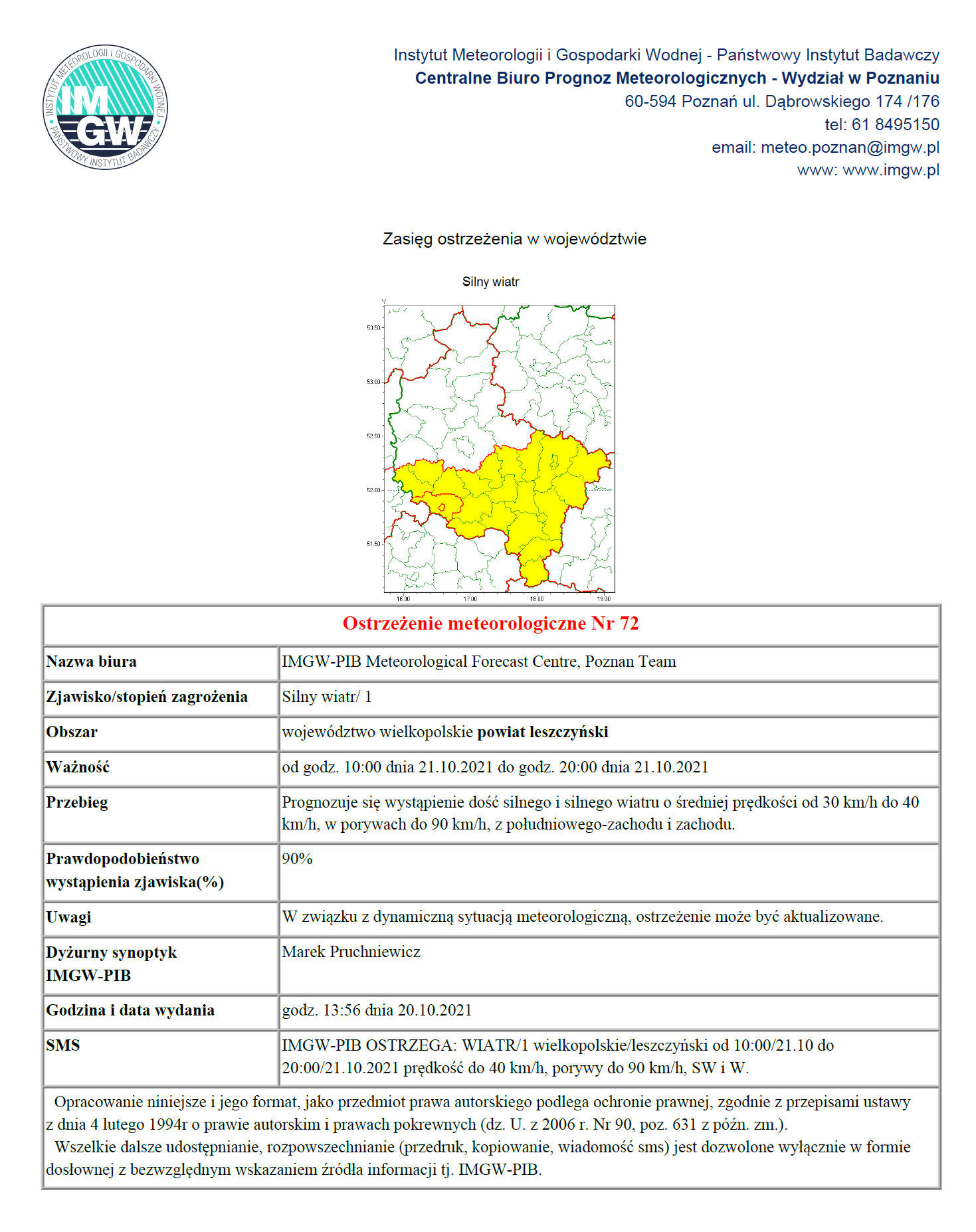 Ostrzeżenie meteorologiczne Nr 72 - silny wiatr