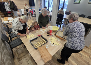 Dzieciaczki razem z Seniorkami piekły rogaliki. Wszystkie pięknie sobie radziły! Wałkowały ciasto, nakładały powidła i zwijały w rogaliki, a później zajadały ze smakiem!