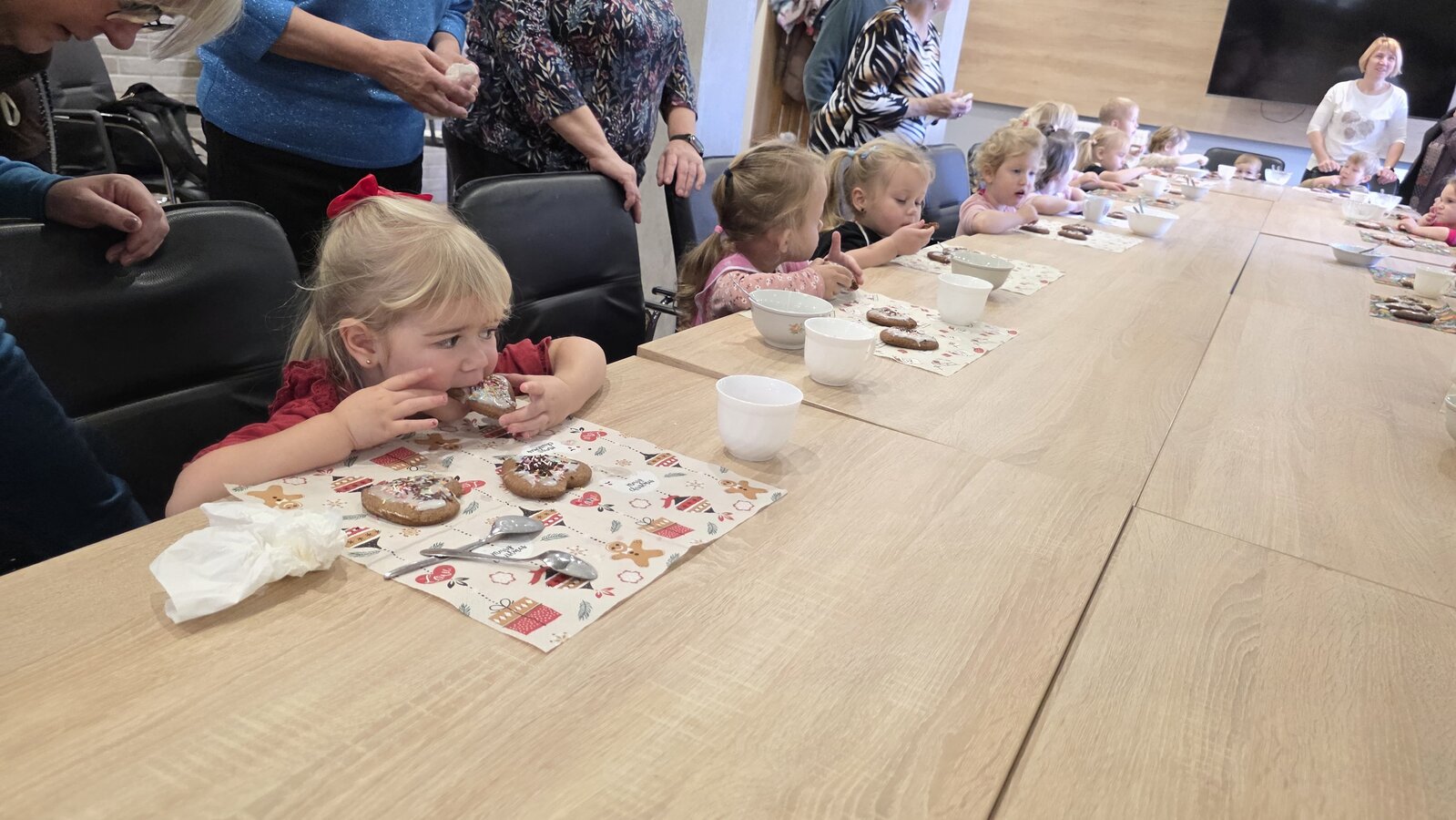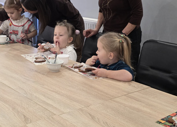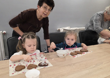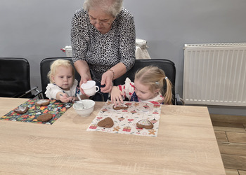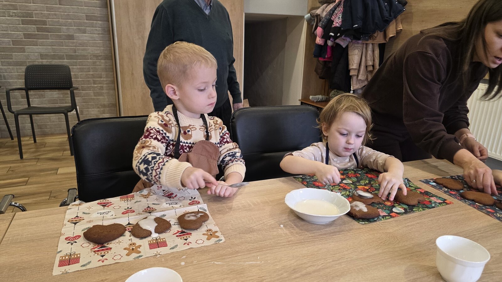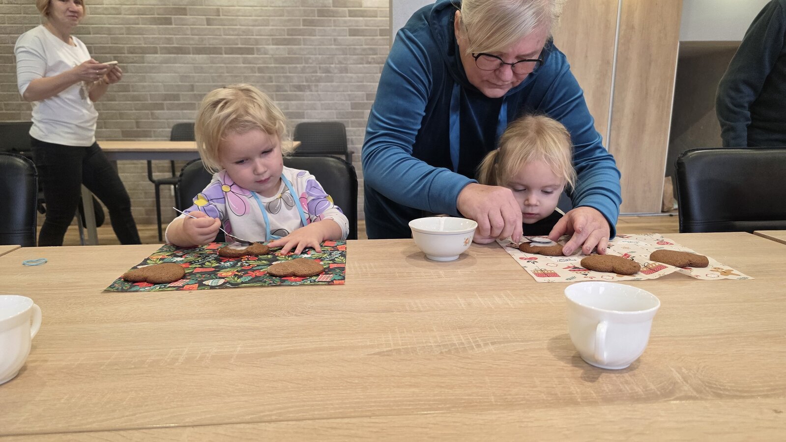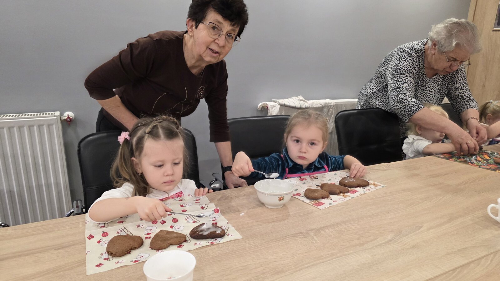 Na dzieciaczki czekały już gotowe stanowiska do dekorowania pierników – lukier oraz kolorowa posypka. Wszyscy po ubraniu fartuszków, zabrali się z entuzjazmem do pracy! Nasi Seniorzy starali się jak mogli, żeby pomóc maluchom w pracy. Efekt był świetny! Wszyscy przygotowali po trzy serduszka, które zabrali ze sobą do domów.