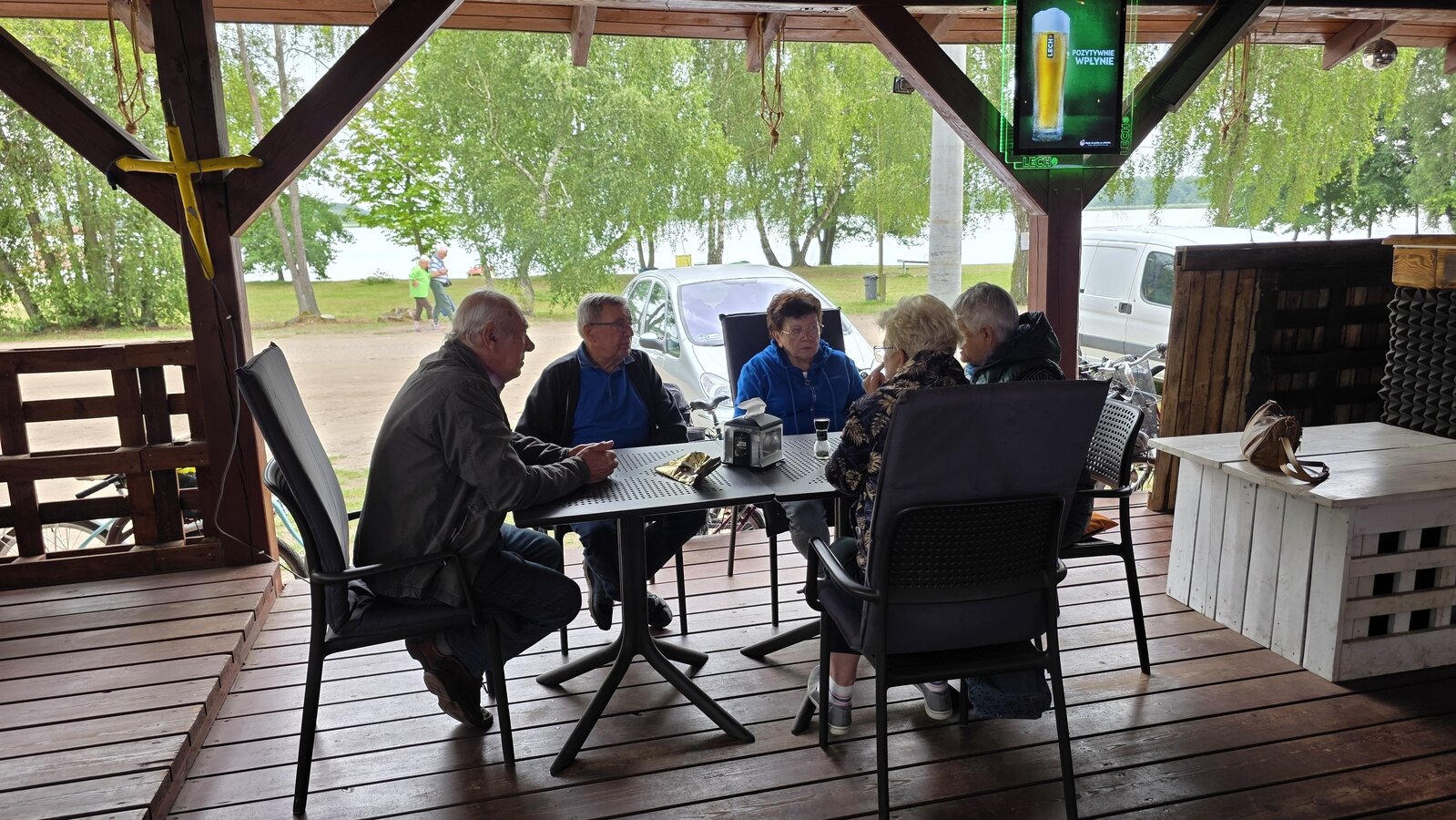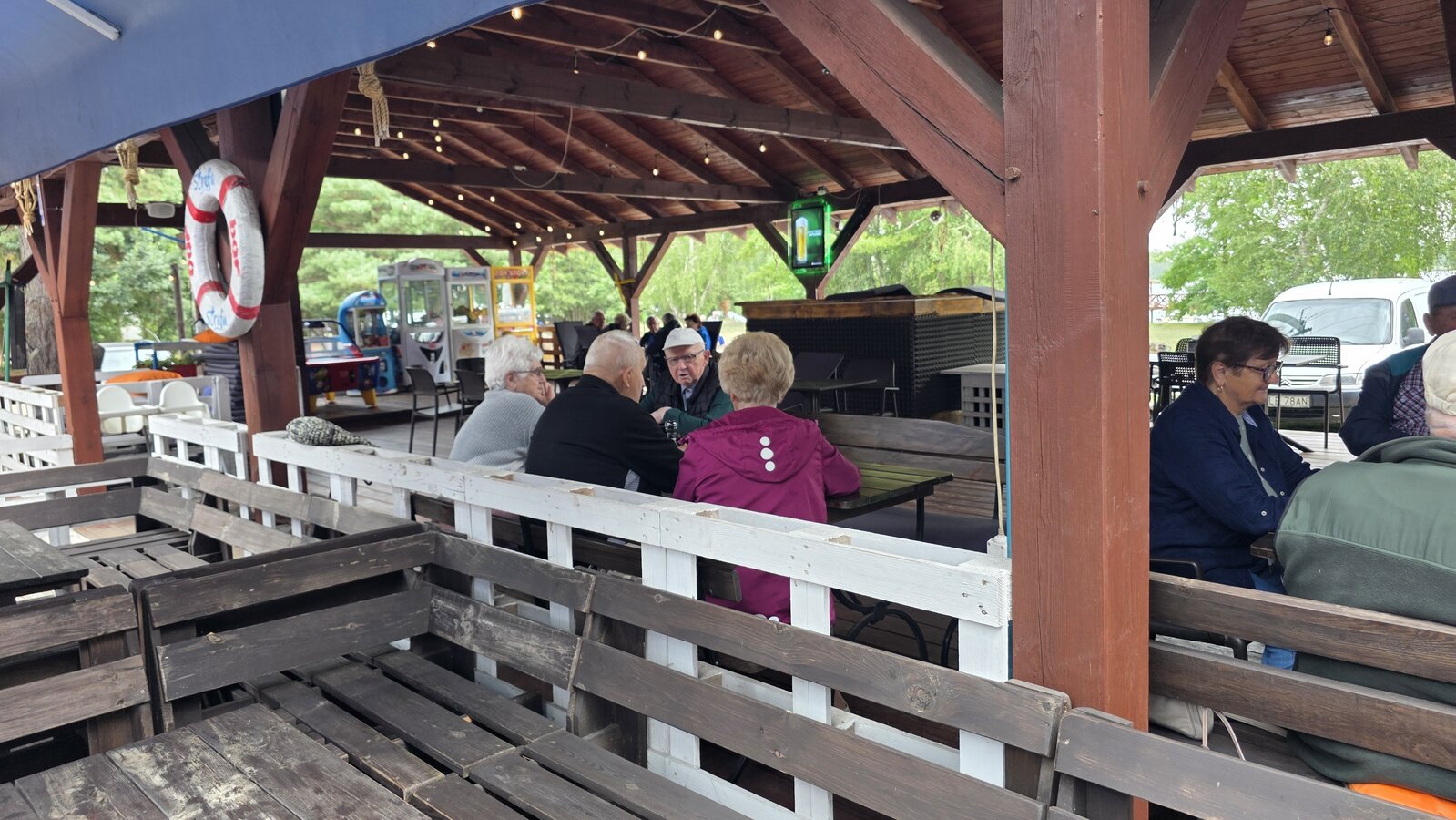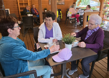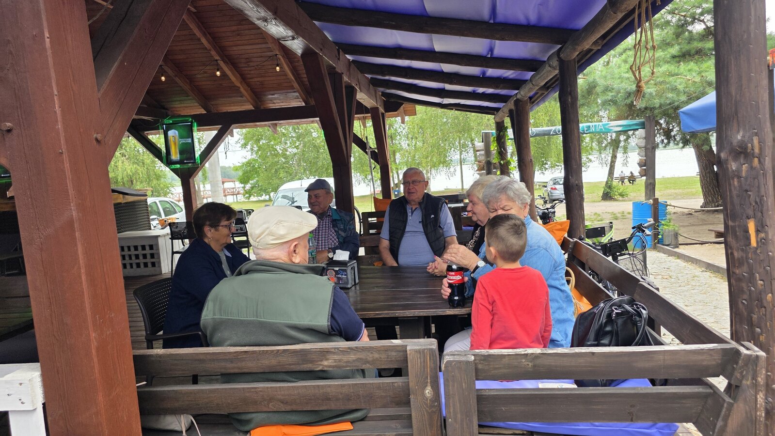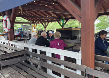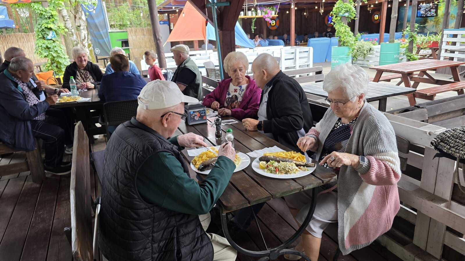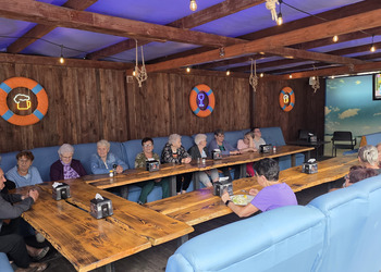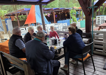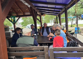 Najpierw jednak przystanęliśmy w Słodkim Zakątku na kawę i ciacho. Zjedliśmy pyszne desery, lody i ciasta. Później była chwila czasu wolnego. Część spędziła go na plaży, inni spacerując po molku a jeszcze inni obserwowali jezioro z ogródków. W końcu przyszedł czas na upragnioną rybkę! Wszyscy ze smakiem ją zajadali a ogromne porcje szokowały naszych Seniorów! Jest to z pewnością najlepsza ryba w naszej okolicy! Polecamy wszystkim!