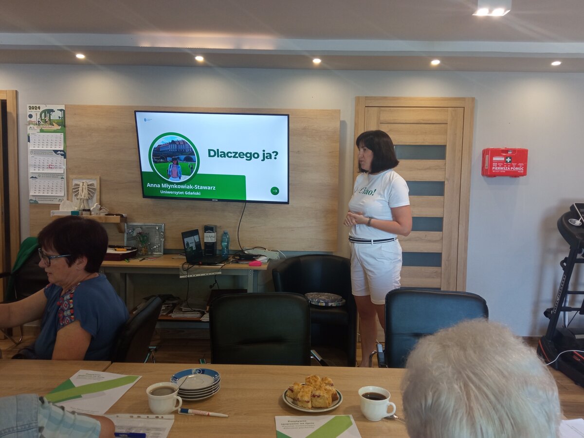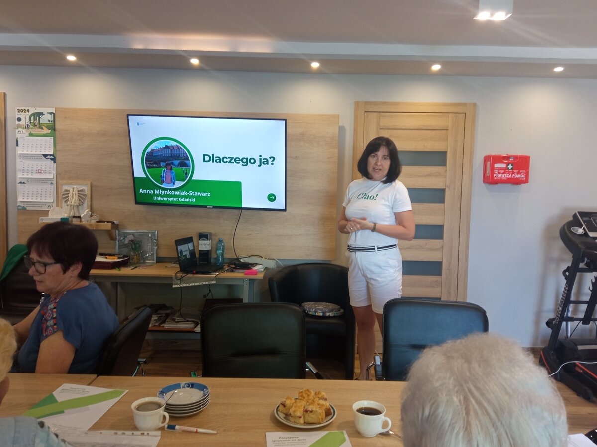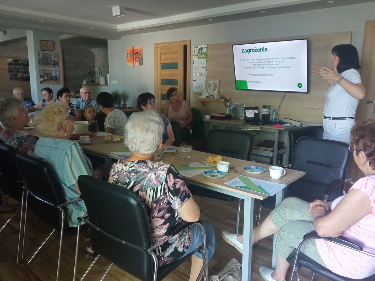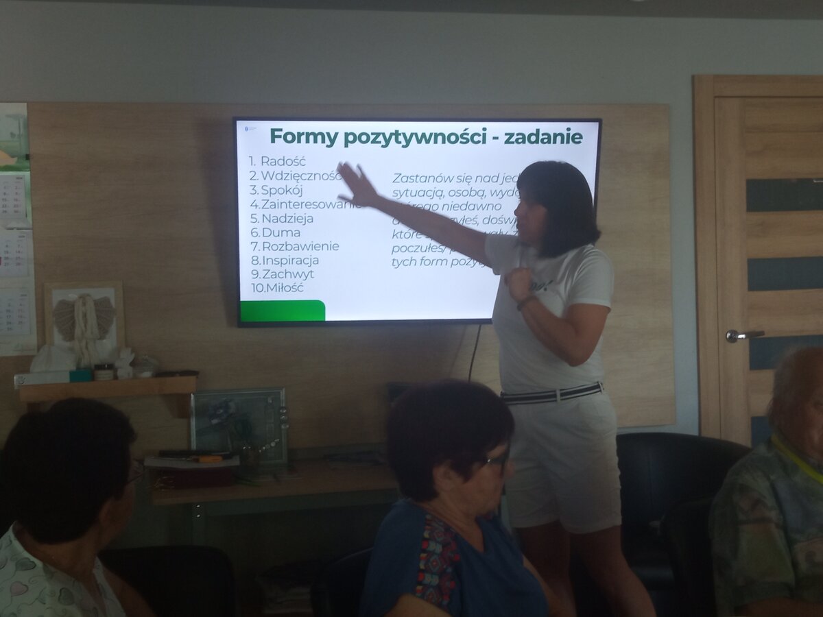 W piątek 19 lipca 2024 roku odbyło się spotkanie z córką jednej z naszych Seniorek, Anną Młynkowiak – Stawarz, pracownikiem Uniwersytetu Gdańskiego. Pani Anna z racji tego, że skończyła psychologię, przygotowała wykład dotyczący pozytywnego myślenia. Dowiedzieliśmy się między innymi dlaczego pozytywne spojrzenie na życie ma znaczenie, jak zmniejszyć negatywność a jak zwiększyć pozytywność. Poznaliśmy też formy pozytywności. Wykład był bardzo interesujący. Wywołał w naszych Seniorach wiele emocji – był śmiech ale też wzruszenie. Każdy z uczestników otrzymał karty do samodzielnej pracy w domu nad swoją pozytywnością.