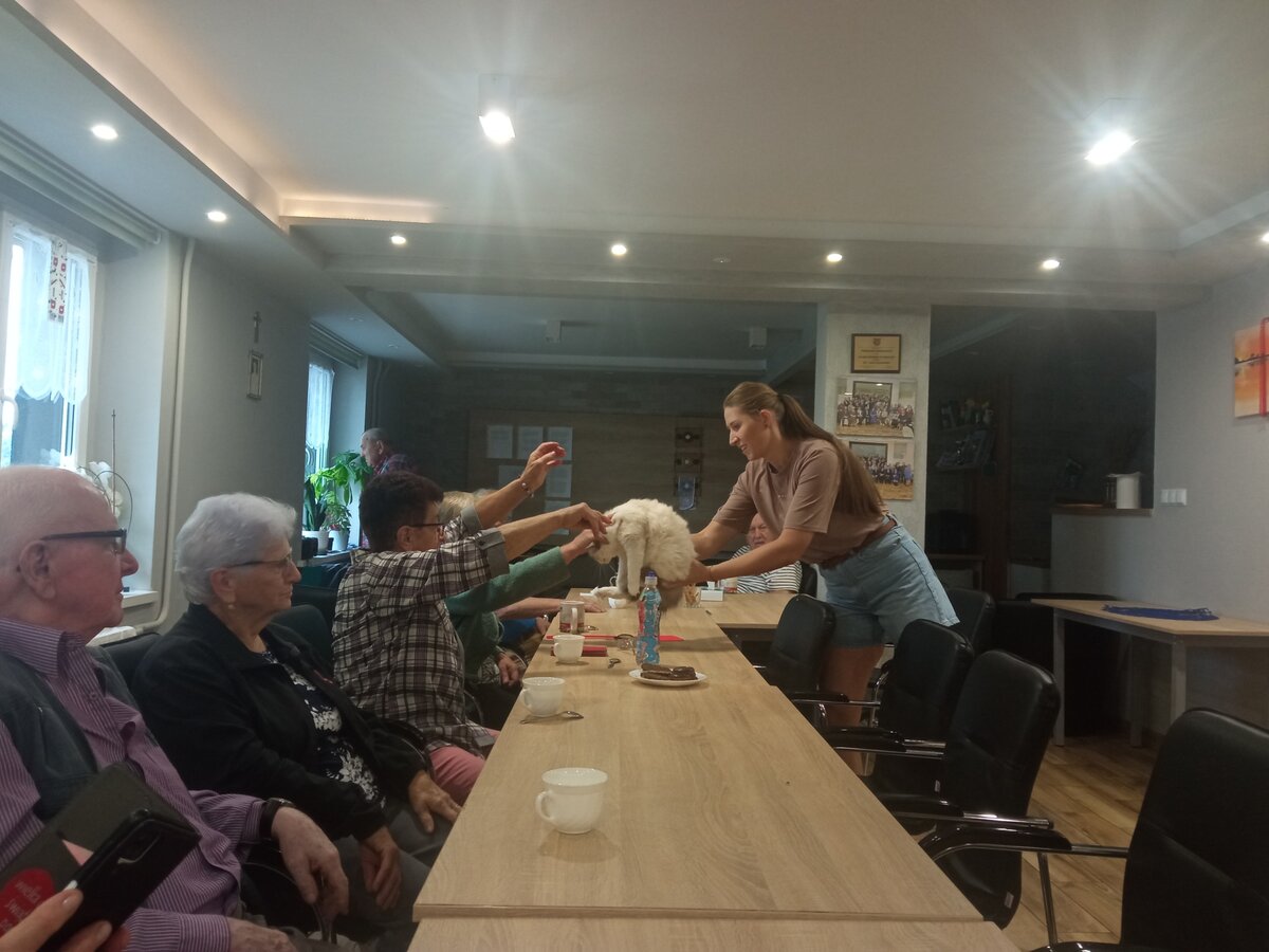 Pani Agnieszka pięknie przekazała nam swoją wiedzę dotyczącą kotów. Seniorzy byli bardzo zainteresowani tematem, o czym świadczyły liczne pytania. Mogliśmy też pogłaskać kociaki.