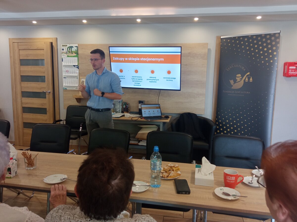 We wtorek 9 lipca 2024 r. w Klubie odbyło się spotkanie z panem Krzysztofem Pławeckim, założycielem Fundacji LexCultura. W ramach fundacji oraz projektu Srebrny Konsument 2.0 prowadzone są spotkania z Seniorami, które mają na celu podniesienie świadomości wielkopolskich seniorów w zakresie praw konsumenckich a także zdefiniowanie potencjalnych zagrożeń i sposobów zapobiegania im poprzez świadome korzystanie z praw konsumenckich. W czasie szkolenia zostały poruszone różne tematy, m.in. prawa związane ze zwrotem oraz reklamacją wadliwych produktów i usług, nieuczciwe praktyki rynkowe, podstawowe prawa konsumentów zawierających umowy przez Internet a także wiele innych. Szkolenie było niewątpliwie bardzo interesujące oraz edukujące. Wydaje się, że wiemy dużo o naszych prawach jako konsumenci, jednak wykład pokazał nam, że istnieje wiele „chwytów”, które są dla nas nieznane. Seniorzy bardzo aktywnie uczestniczyli w spotkaniu, trwała ożywiona dyskusja.