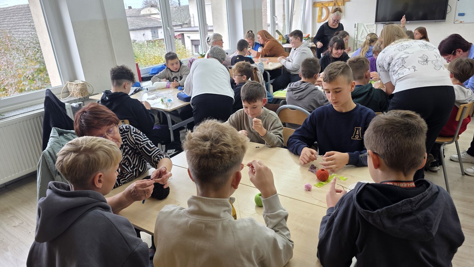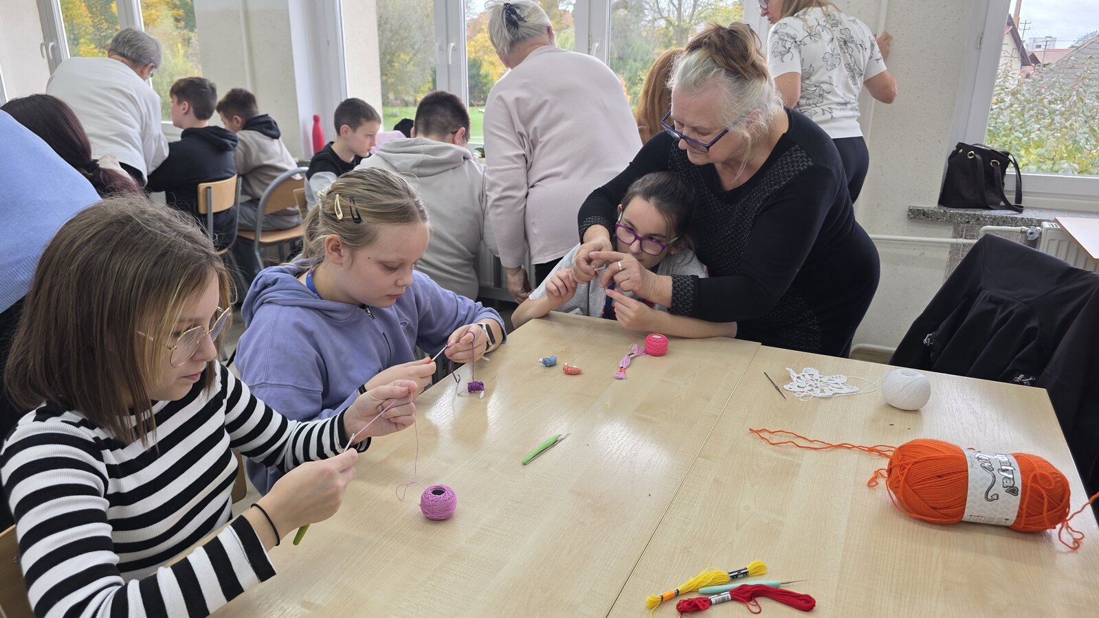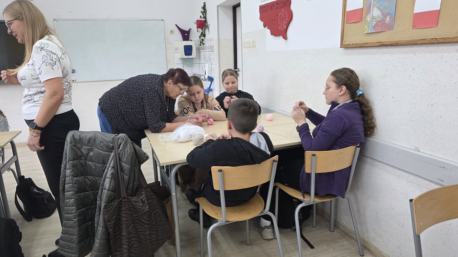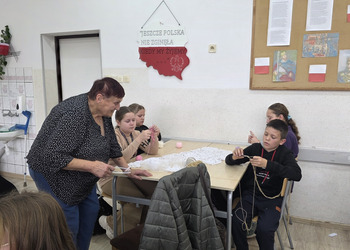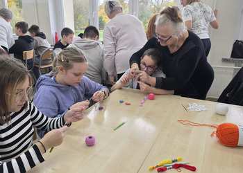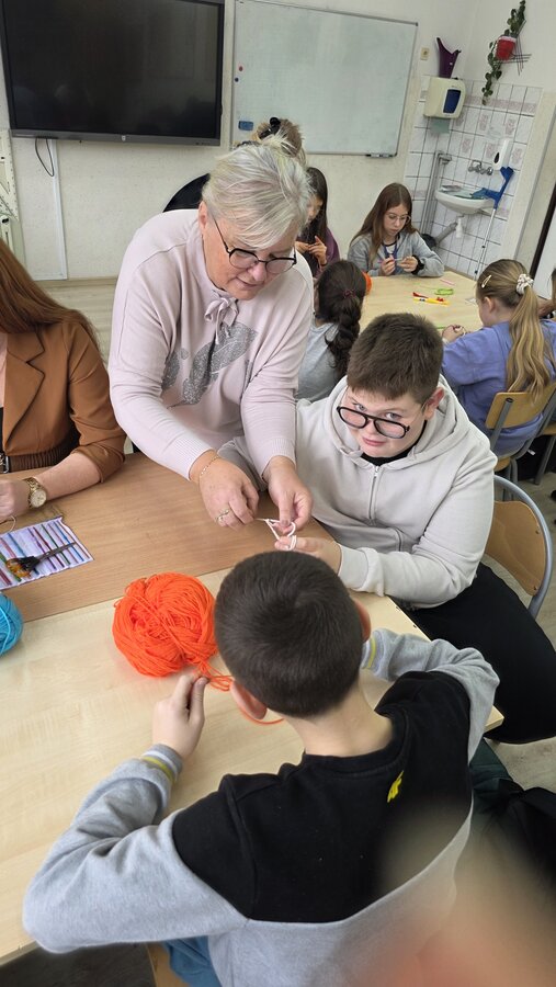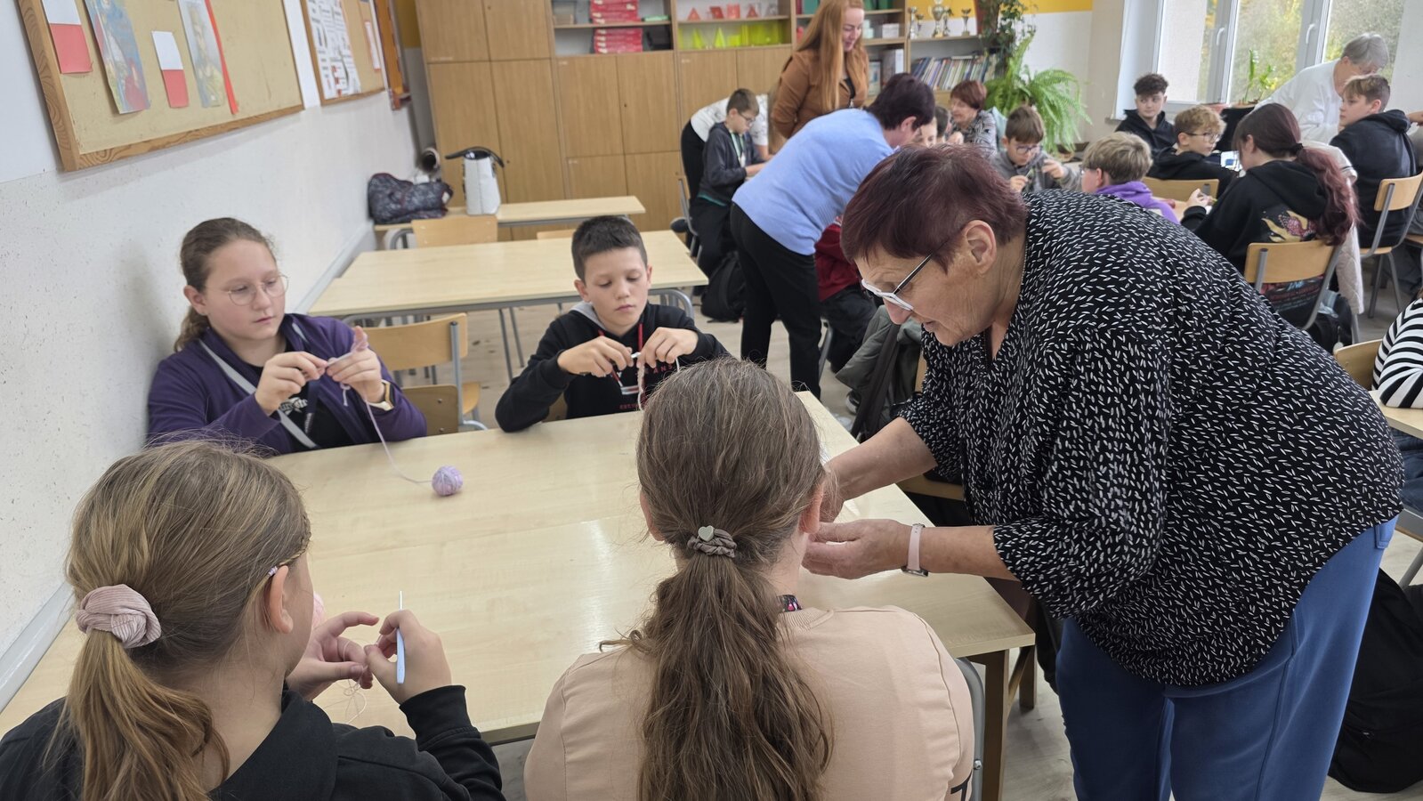 Jak co roku, tym razem we wtorek 28 października, nasze Seniorki z sekcji szydełkowej: panie Renata, Elżbieta, Rozalia, Teresa, Aniela oraz Zosia zostały zaproszone przez panią Monikę Rękoś na lekcje techniki w klasie 5. Wizyta Seniorek w szkole na zajęciach z szydełkowania to jeden z tych momentów, które choć z pozoru drobne, zostają w pamięci na długo. To spotkanie dwóch światów: młodych, często zabieganych uczniów oraz doświadczonych kobiet, które niosą ze sobą spokój, cierpliwość i historie utkane tak samo gęsto jak ich robótki.