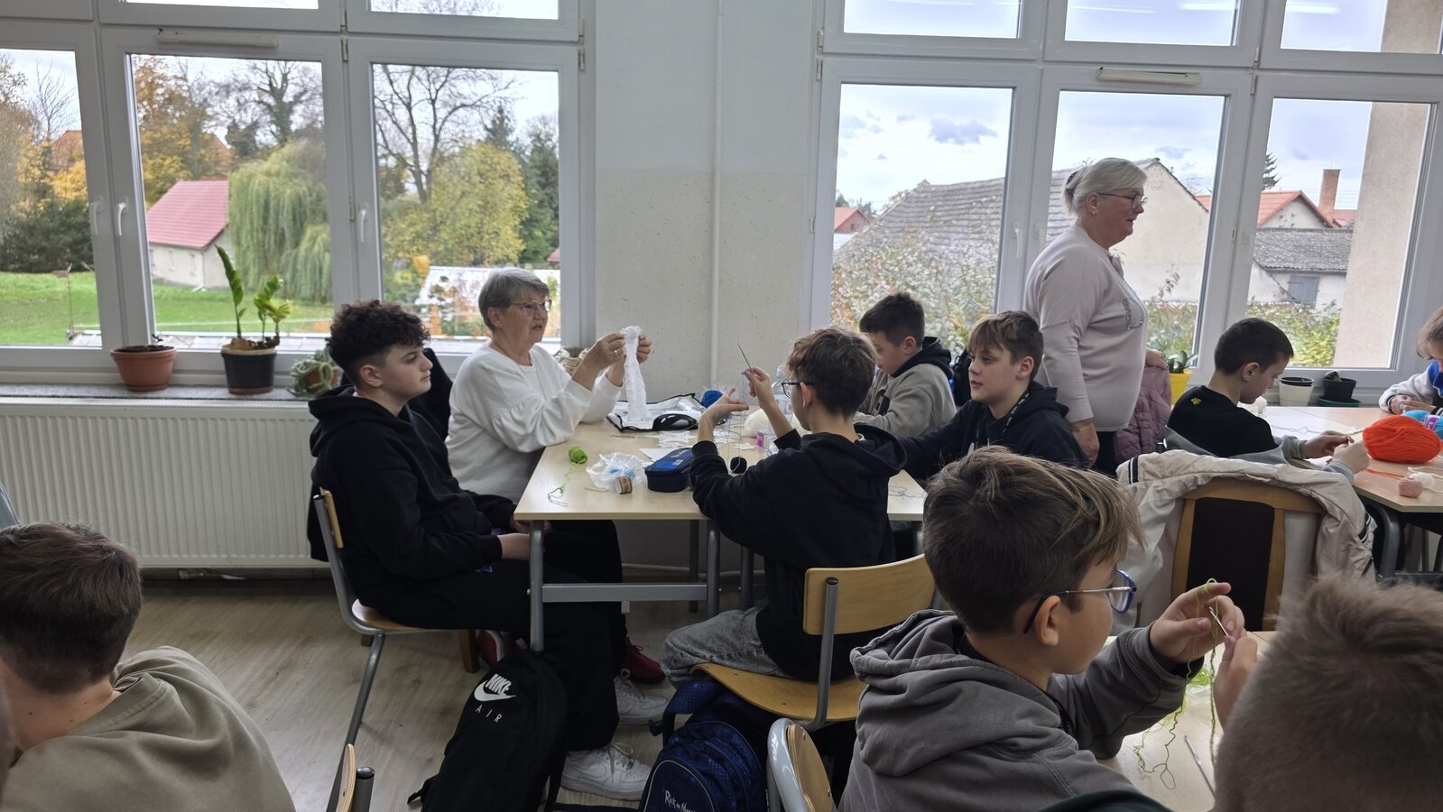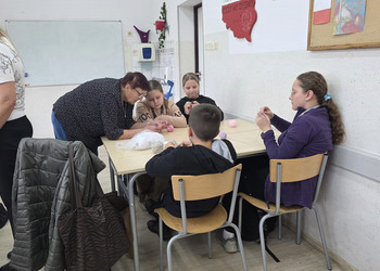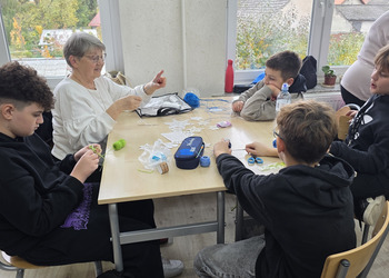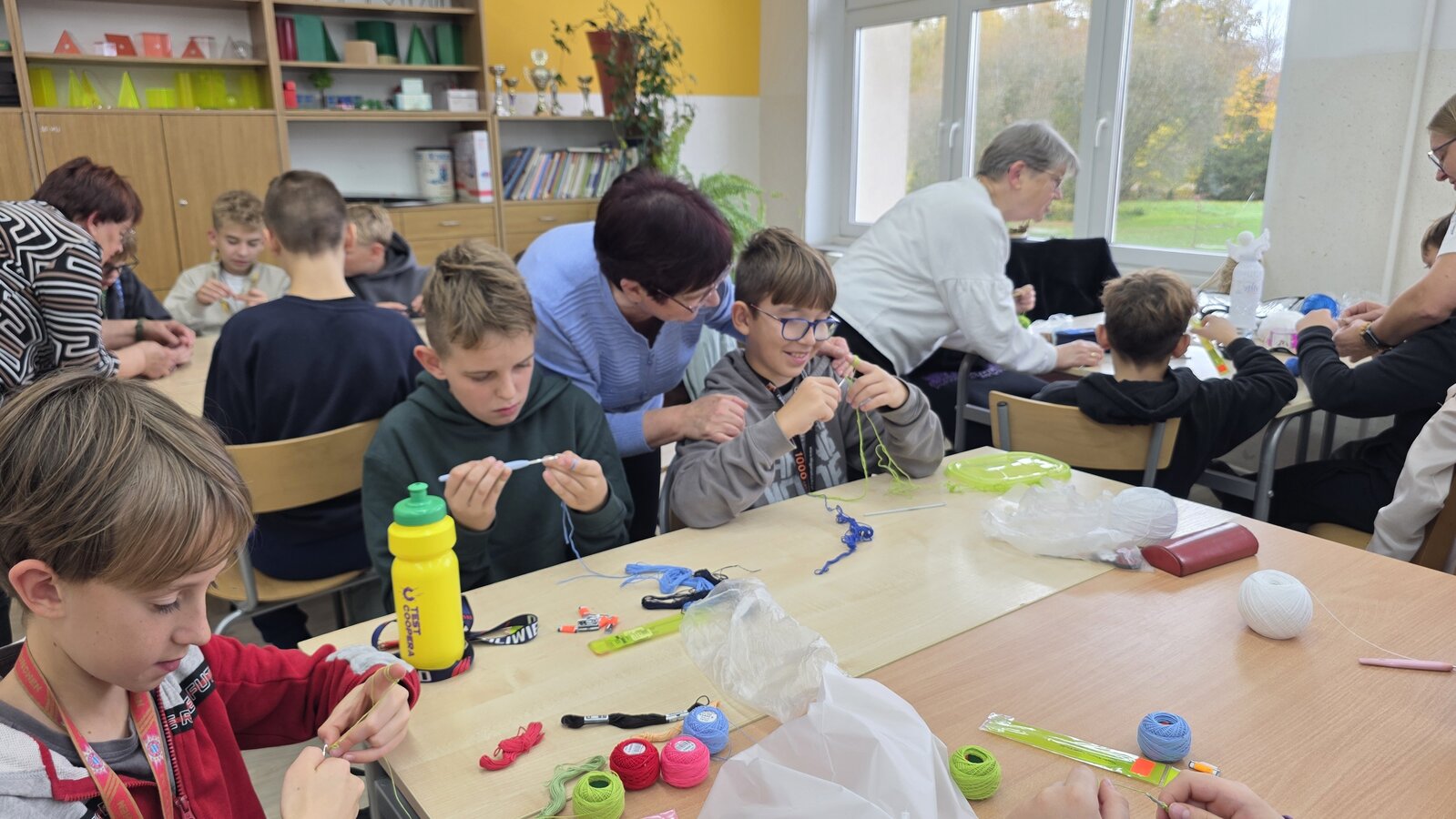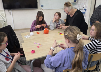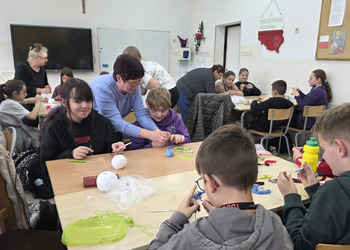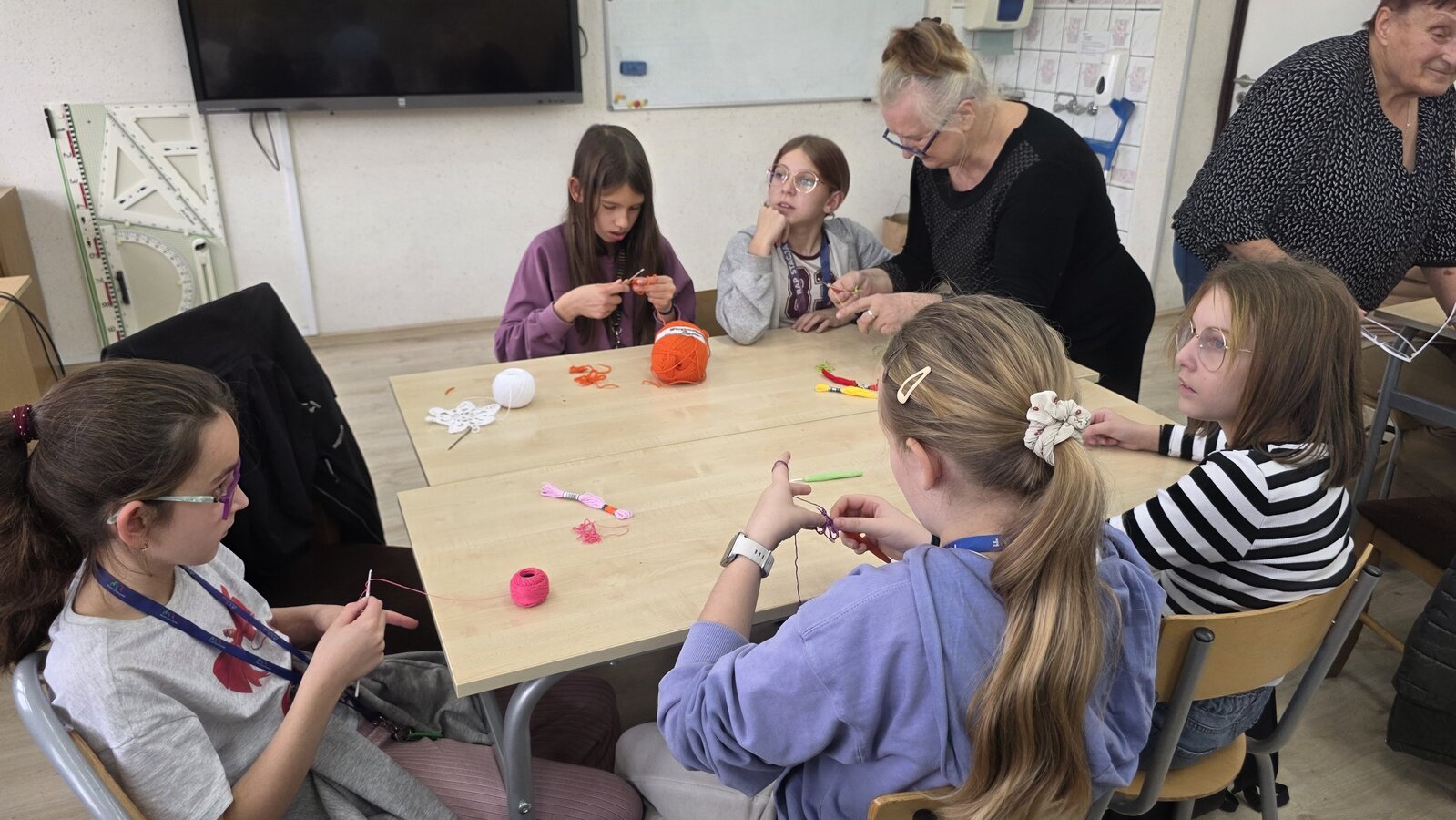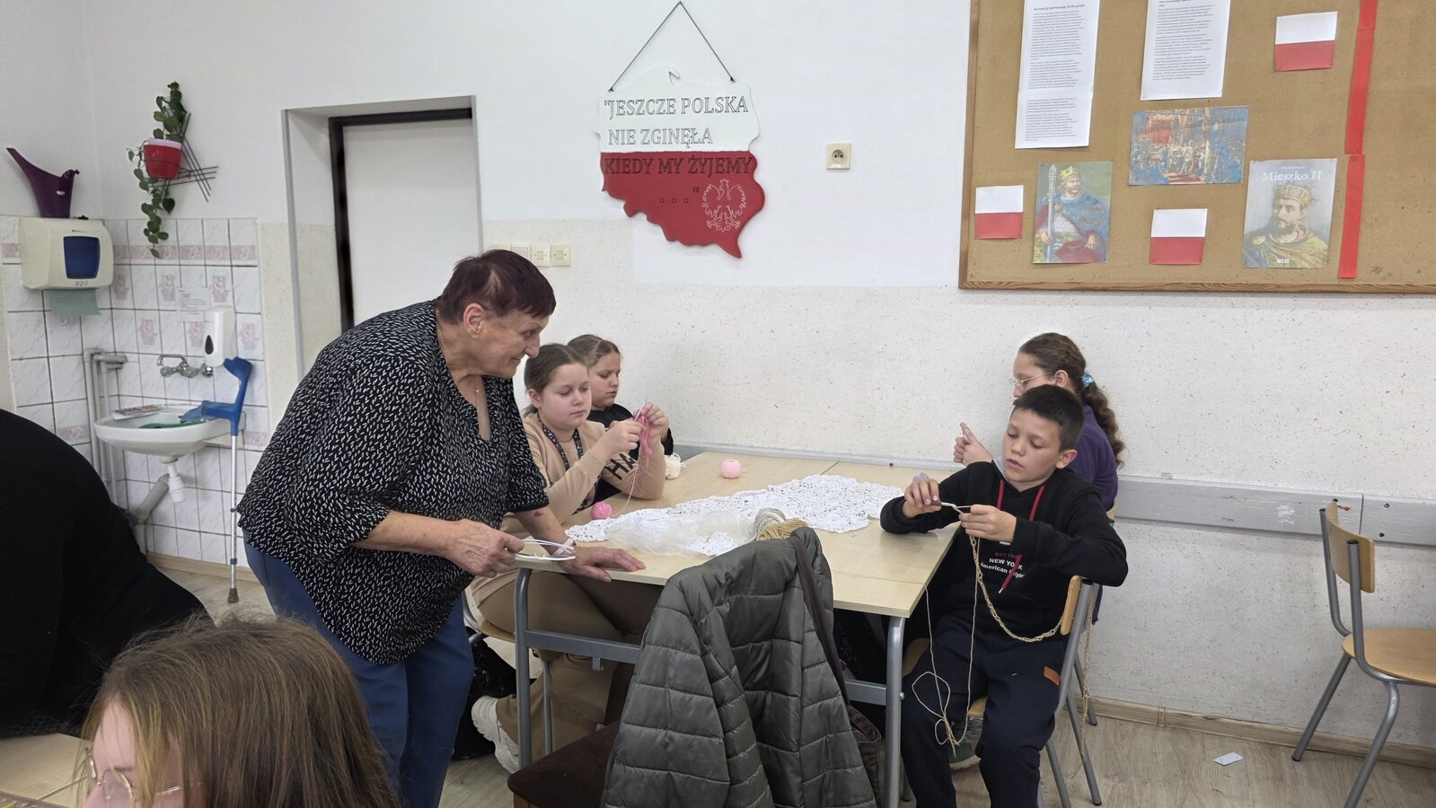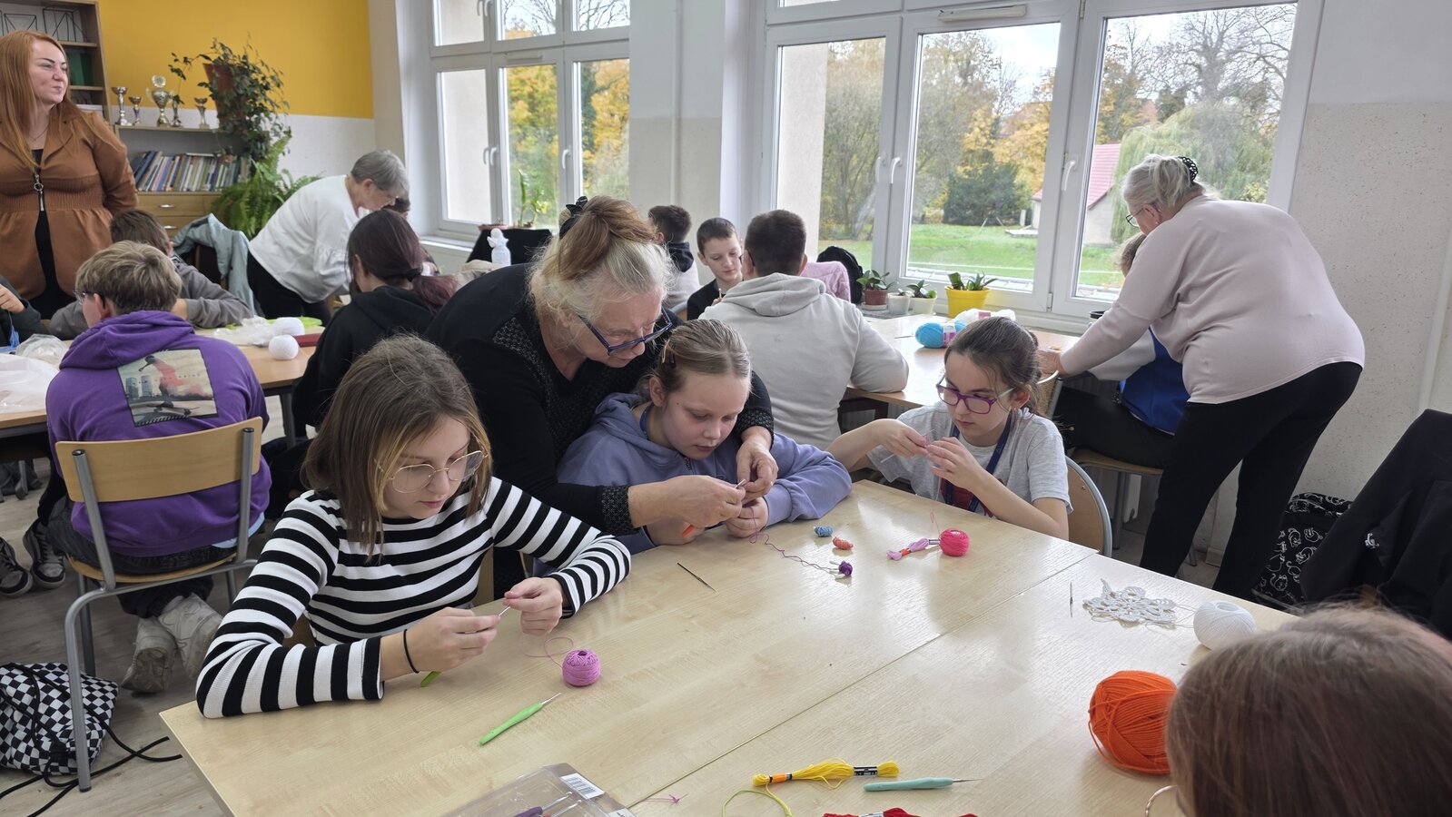 Jak co roku, tym razem we wtorek 28 października, nasze Seniorki z sekcji szydełkowej: panie Renata, Elżbieta, Rozalia, Teresa, Aniela oraz Zosia zostały zaproszone przez panią Monikę Rękoś na lekcje techniki w klasie 5. Wizyta Seniorek w szkole na zajęciach z szydełkowania to jeden z tych momentów, które choć z pozoru drobne, zostają w pamięci na długo. To spotkanie dwóch światów: młodych, często zabieganych uczniów oraz doświadczonych kobiet, które niosą ze sobą spokój, cierpliwość i historie utkane tak samo gęsto jak ich robótki.