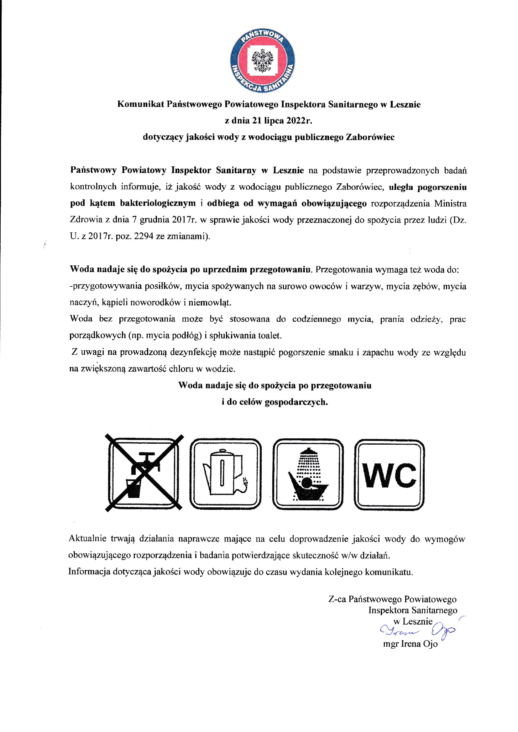 Uwaga komunikat dotyczący jakości wody w miejscowości Zaborówiec