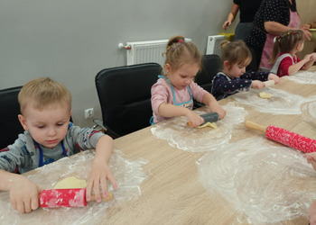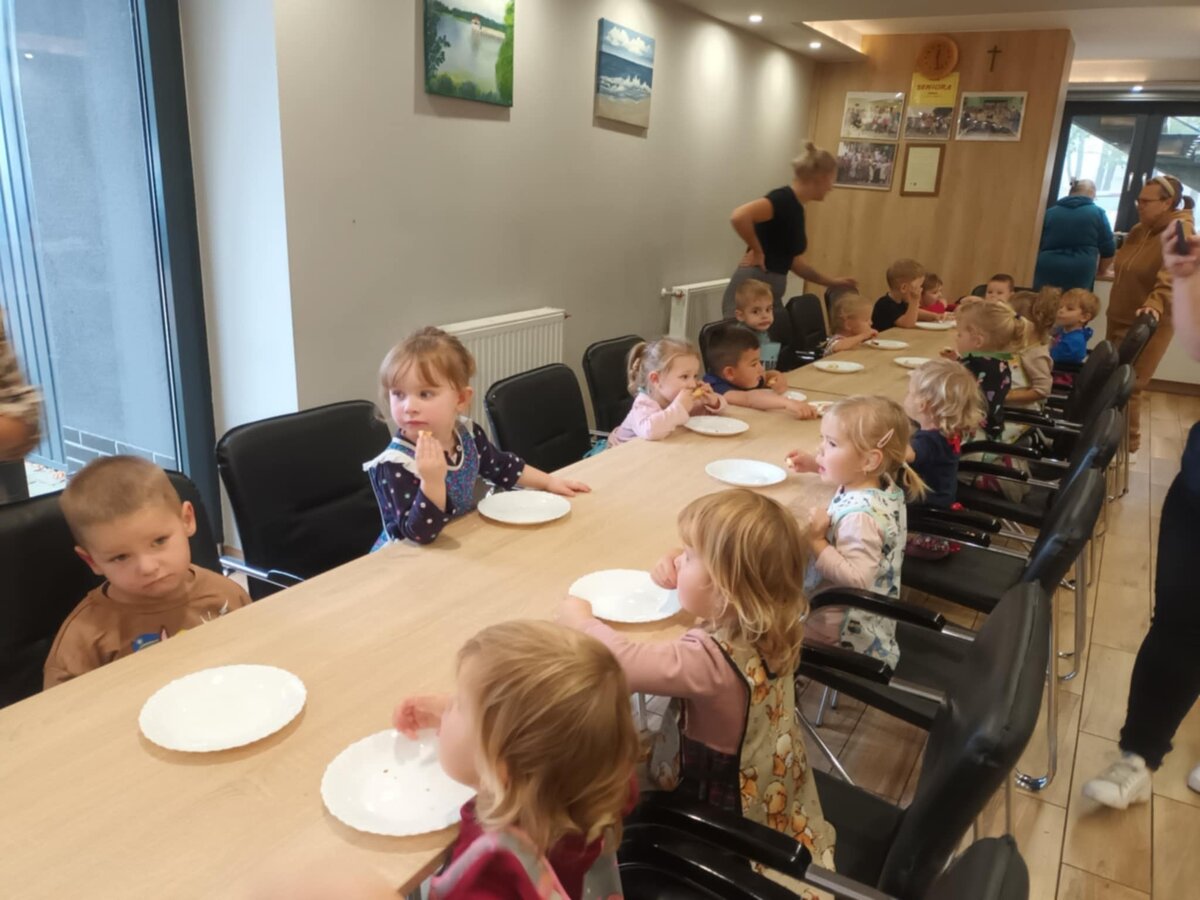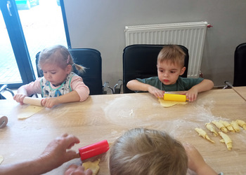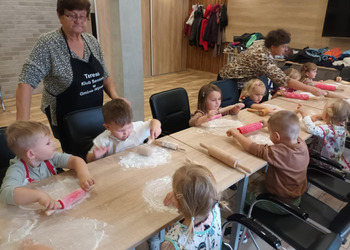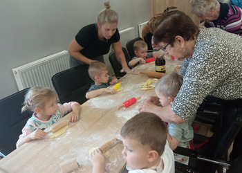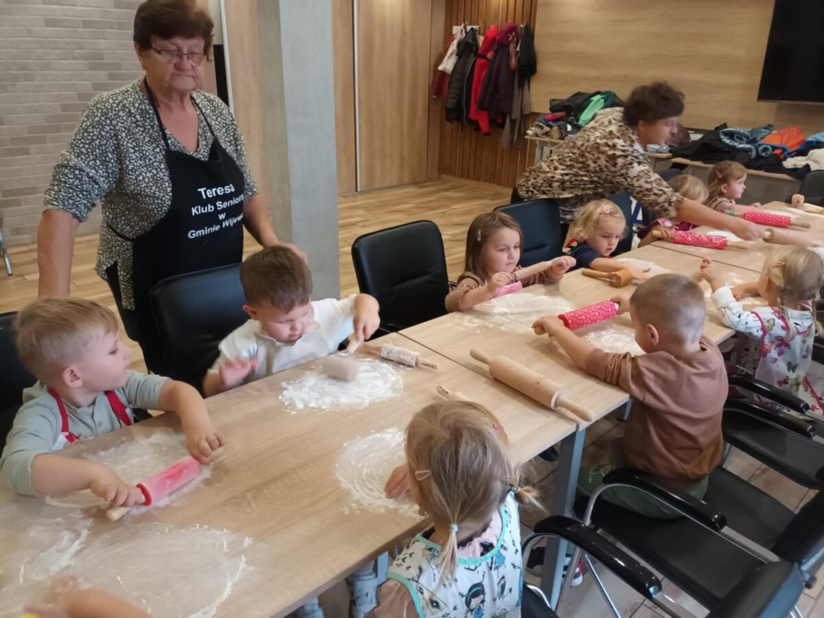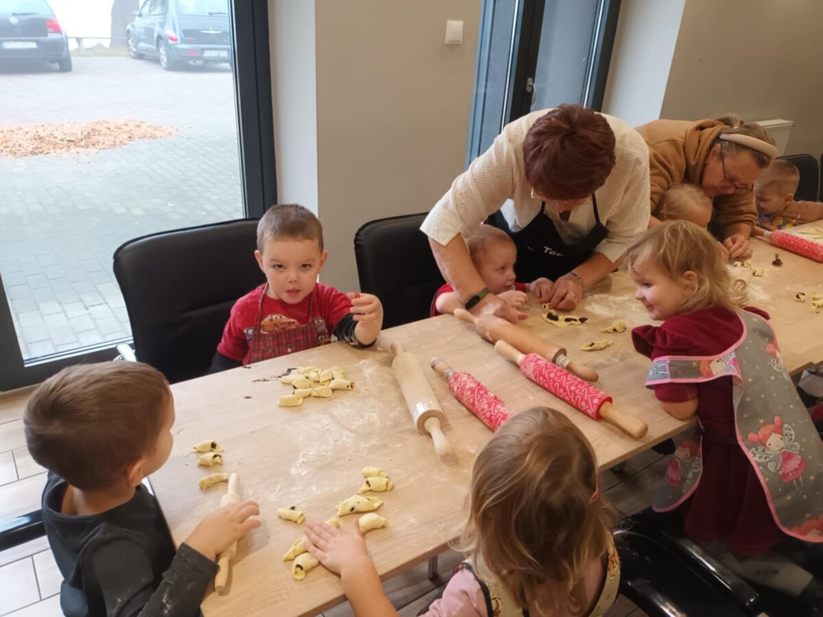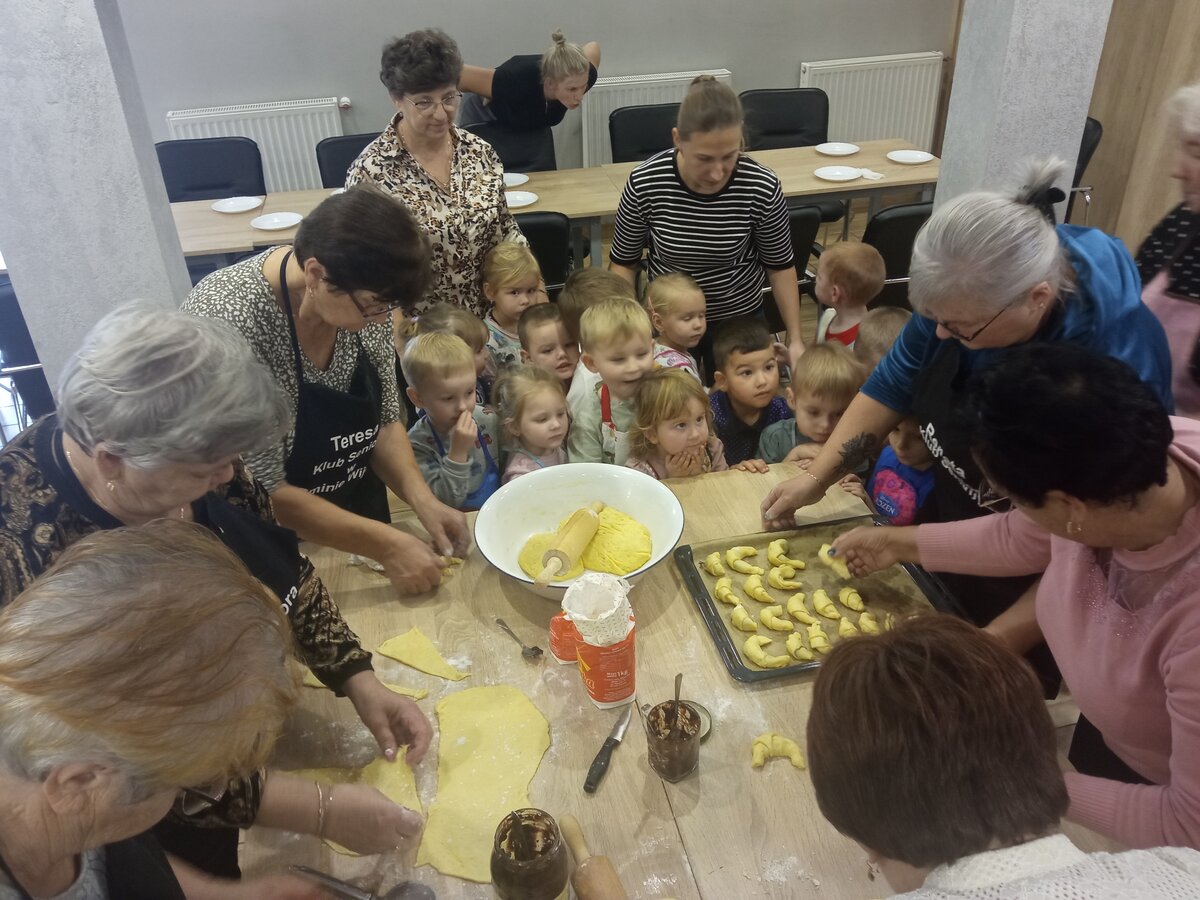 Głośno i wesoło zrobiło się w naszym Klubie w środę 6 listopada, a to za sprawą przedszkolaków z grupy „Pszczółki” z Samorządowego Przedszkola w Wijewie. Dzieciaczki przyjechały do nas piec rogaliki. Każdy przedszkolak miał swój fartuszek oraz wałek. Nasze Seniorki zrobiły wcześniej ciasto, które po wyrośnięciu dzieci wałkowały i nadziewały powidłami. Zabawa była wspaniała! Dzieci świetnie sobie radziły i spod wszystkich pracowitych rączek wyszły pyszne rogaliki, które później wszyscy zjedli. A że ciasta było dużo, nasze Seniorki zrobiły większą ilość, którą dzieci zabrały ze sobą do domów.