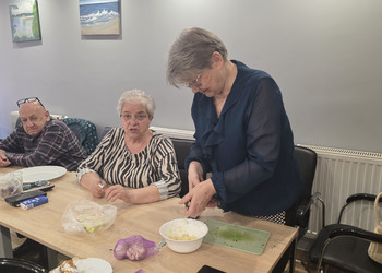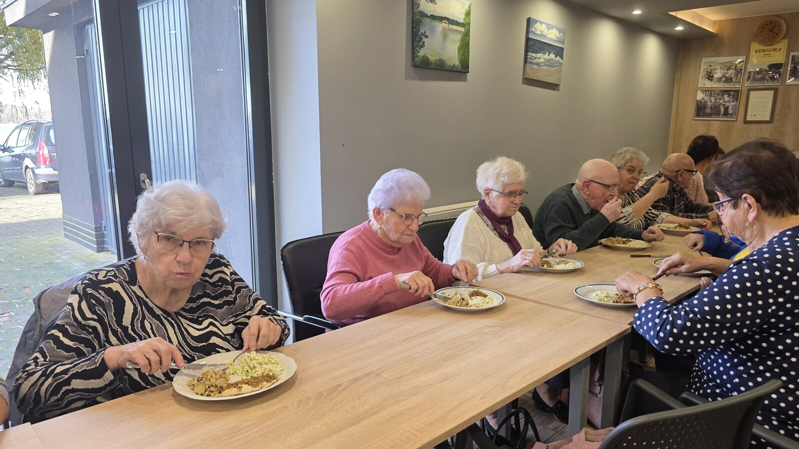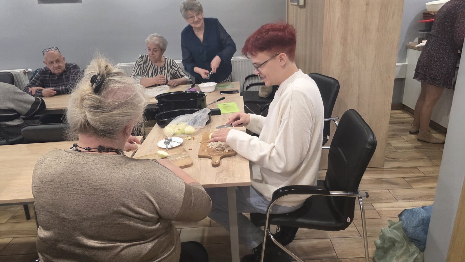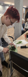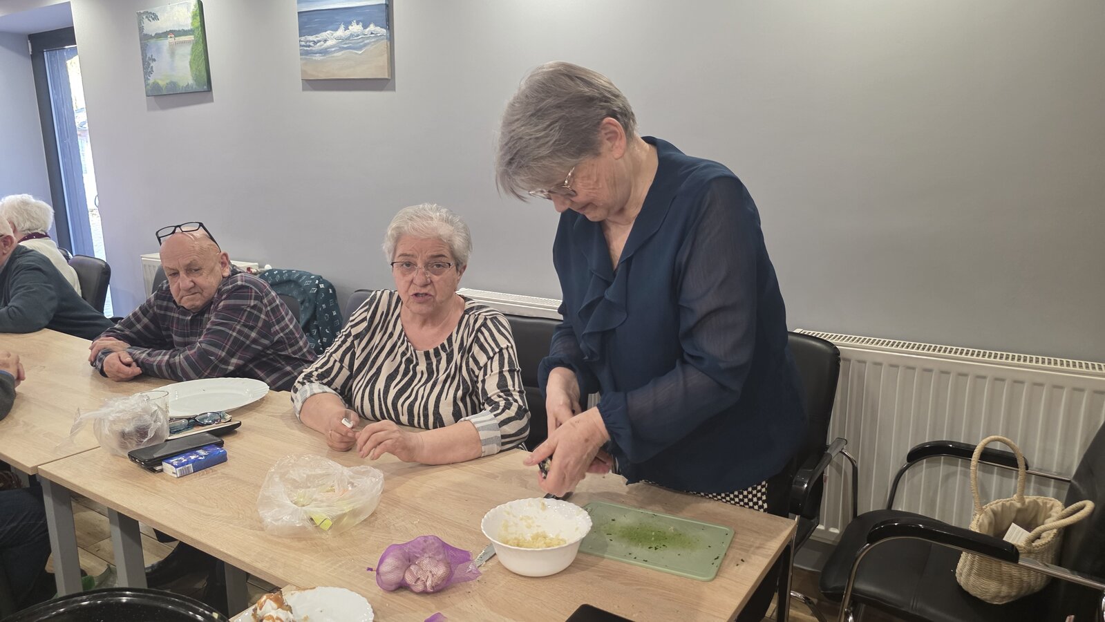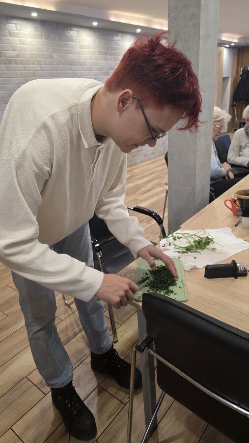 Było to spotkanie pełne smaku, wiedzy i dobrej zabawy! Pod czujnym okiem dietetyczki, Seniorzy uczyli się jak przygotowywać zdrowe, lekkie i pyszne potrawy, które nie tylko cieszą podniebienie, ale też wspierają nasze zdrowie. Wszyscy z zapałem pomagali jak mogli, żeby pomóc w przygotowaniu obiadu oraz deseru. Na stole pojawiło się kaszotto z grzybami i cukinią, surówka z kapusty pekińskiej oraz łosoś z panierką pieczony w piekarniku. Dla osób nie jedzących ryb, był oczywiście kurczak. Na deser pojawiły się nasiona chia z owocami.