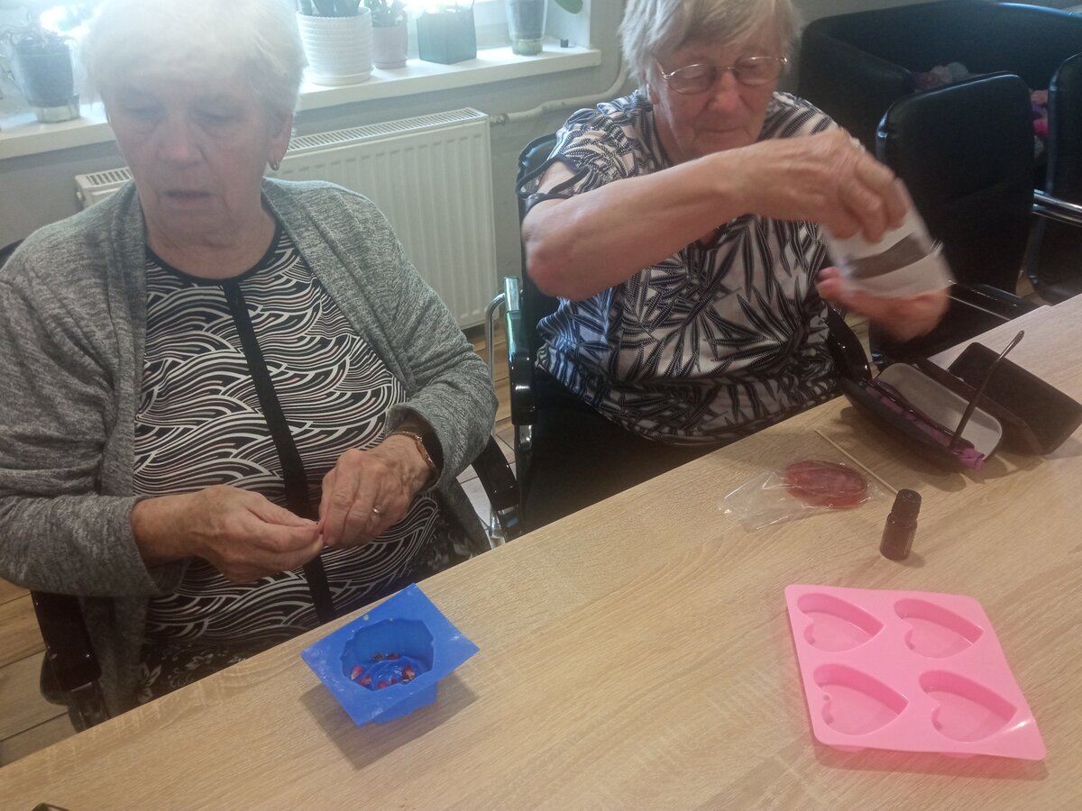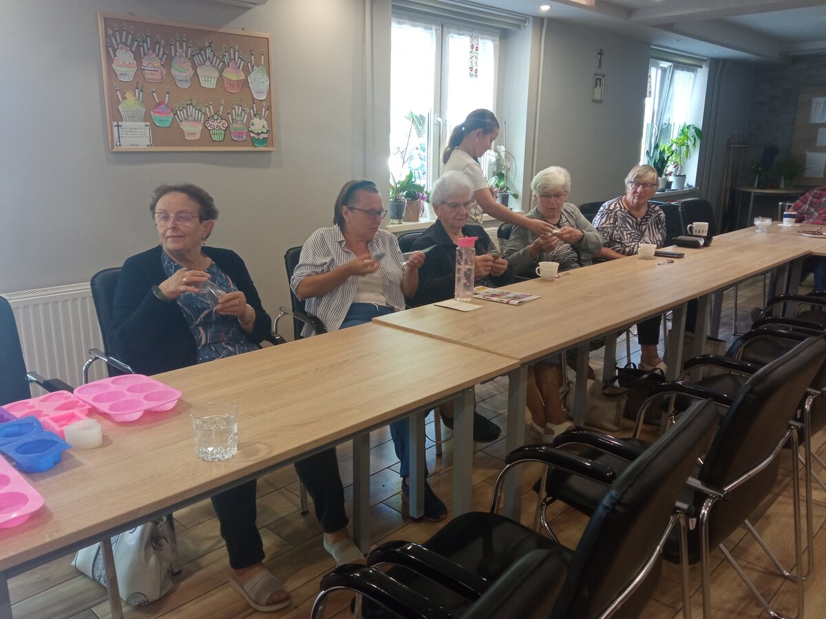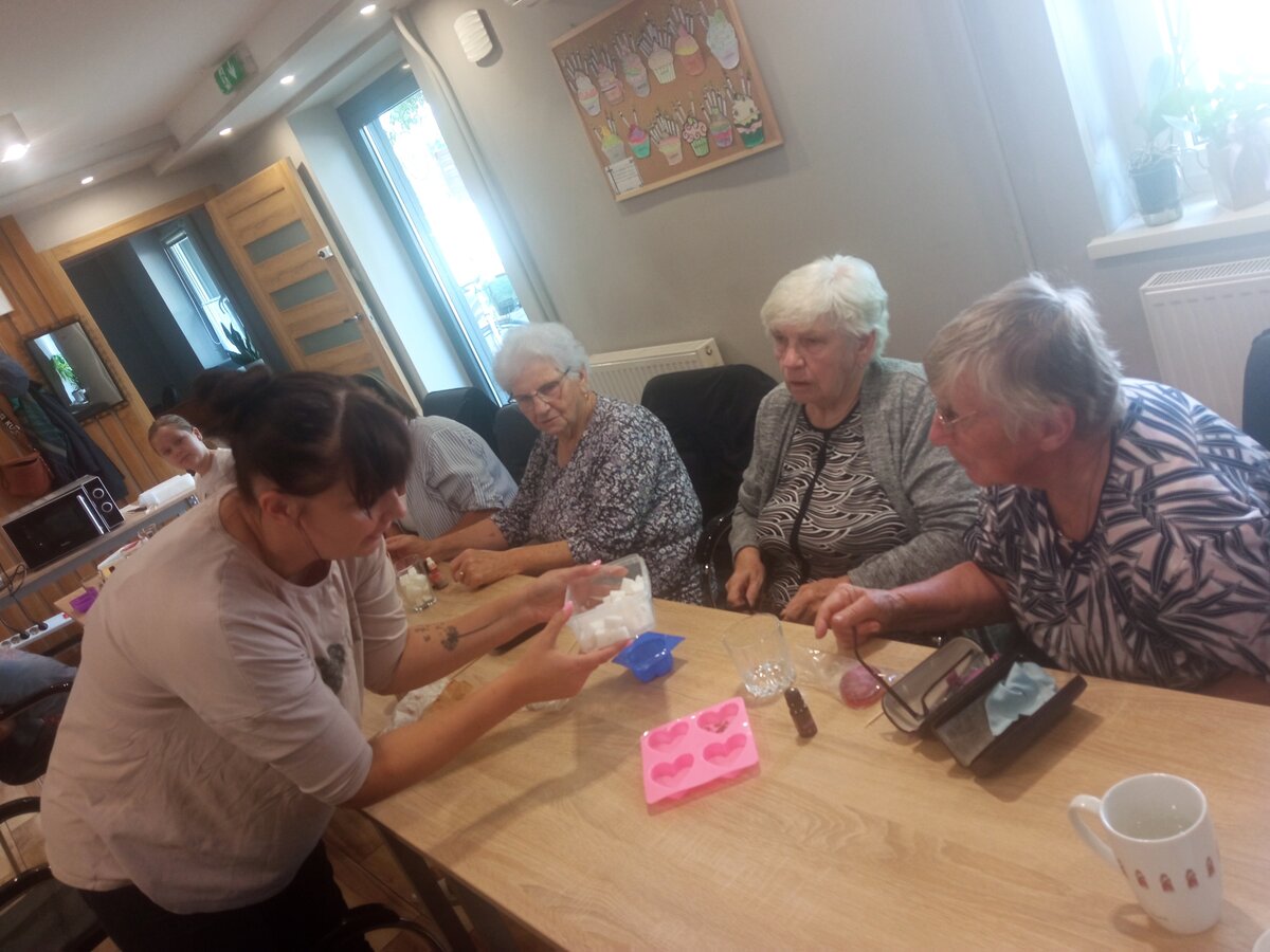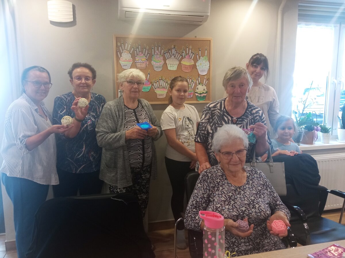 W czwartek 25 lipca 2024 r. w Klubie gościliśmy Panią Angelikę Kowalewicz z córkami. Odbyły się warsztaty z tworzenia mydełek. Seniorki najpierw zobaczyły jak te mydełka robić, a później samodzielnie zrobiły swoje. Były różne kształty, zapachy, kolory… Mydełka te charakteryzuje to, że są naturalne i nie zawierają chemii. Seniorki były zachwycone zapachami i kolorami, więc inwencja twórcza nie miała granic. Można było dodać do mydełek również płatki róż, piwonii, chabrów czy nawet lawendę.