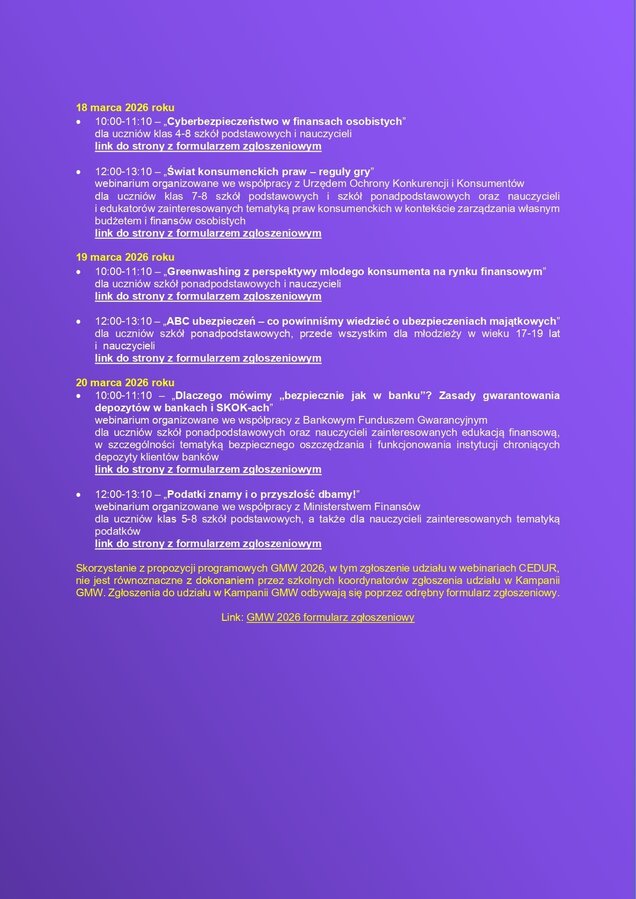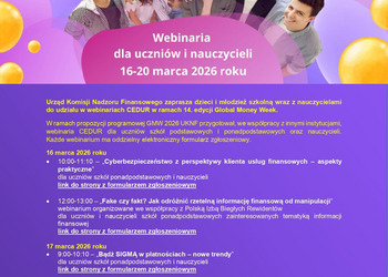 Uwaga: na każde webinarium CEDUR obowiązuje oddzielny elektroniczny formularz zgłoszeniowy. Zgłoszenie udziału w webinarium CEDUR w ramach GMW nie jest równoznaczne ze zgłoszeniem udziału w kampanii Global Money Week.