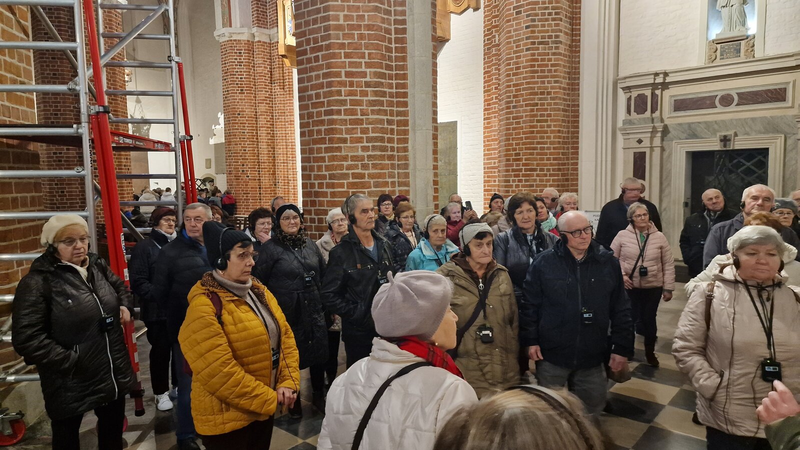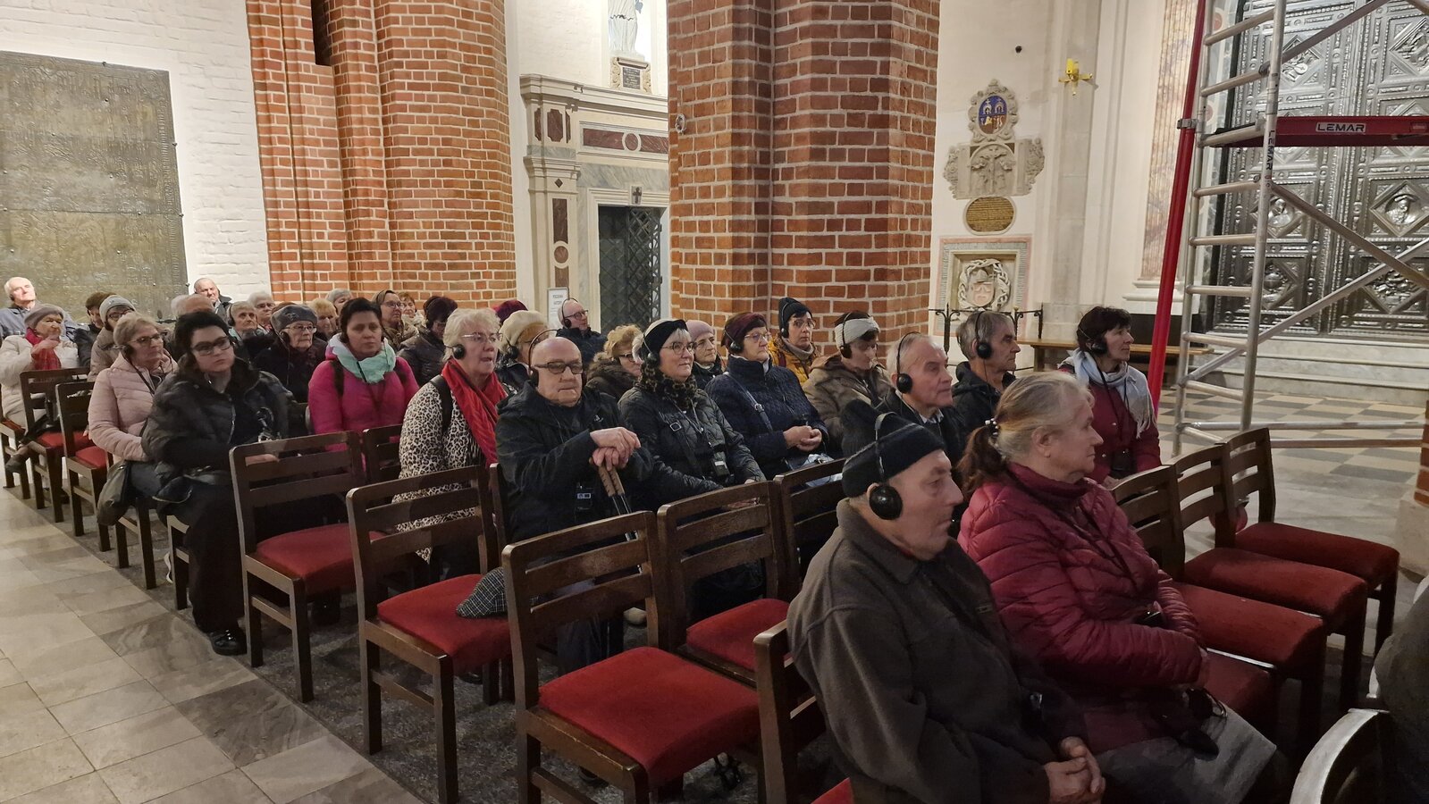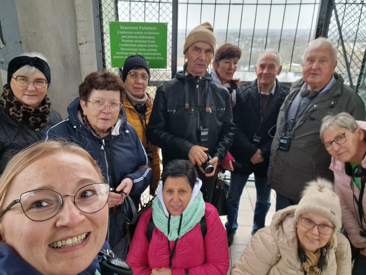 Wczesnym rankiem wyruszyliśmy w drogę. Naszym celem była Katedra w Gnieźnie. Tam, po otrzymaniu zestawu słuchawkowego rozpoczęliśmy zwiedzanie. Najpierw weszliśmy do podziemi. Tam obejrzeliśmy odkrywkę wykopalisk archeologicznych związanych ze świątynią. Następnie zwiedzaliśmy wnętrze Katedry. Nasza pani przewodnik miała ogromną wiedzę, którą fantastycznie potrafiła przekazać. Kolejnym punktem zwiedzania były Drzwi Gnieźnieńskie, które przedstawiają życiorys św. Wojciecha. Ostatnim etapem zwiedzania Katedry był taras widokowy umiejscowiony na wieży zegarowej. Grupa osób pokonała 240 schodów i mogła podziwiać panoramę Gniezna.