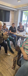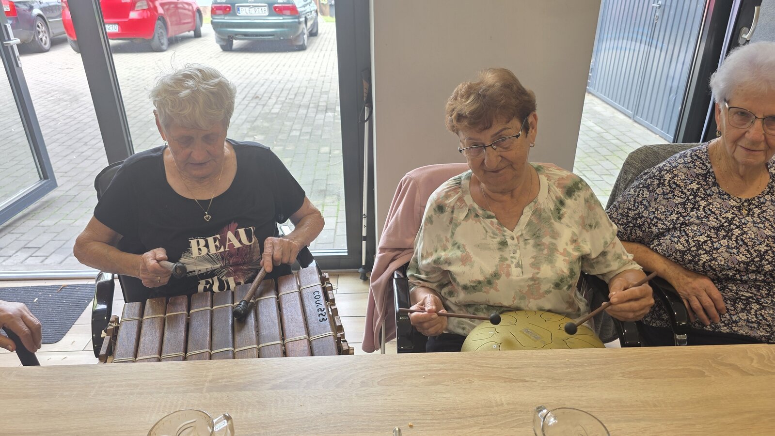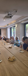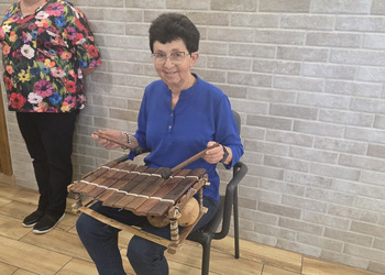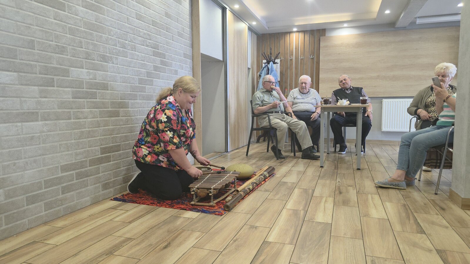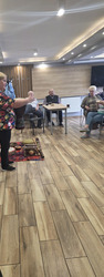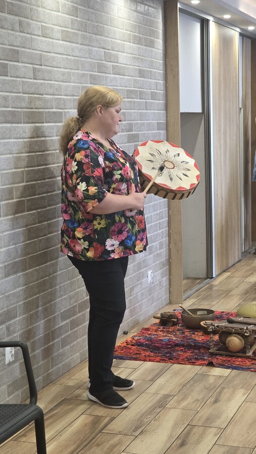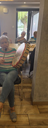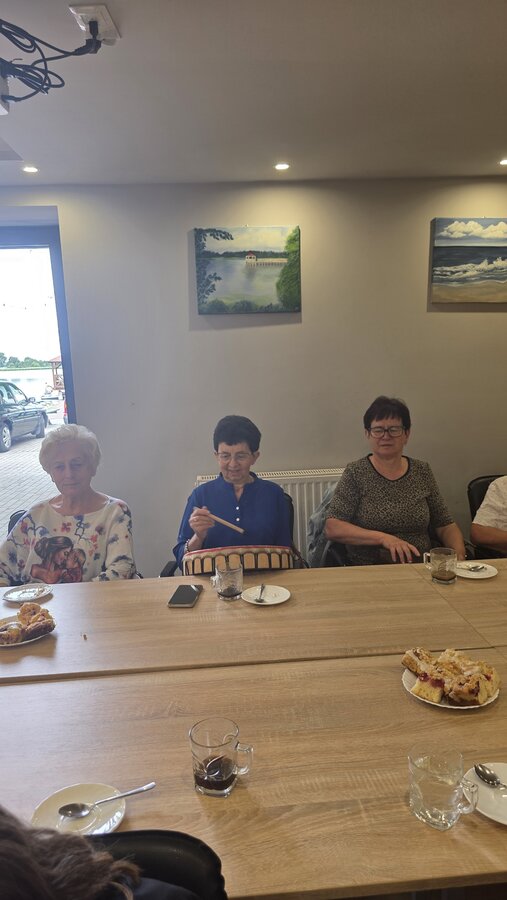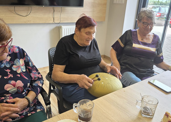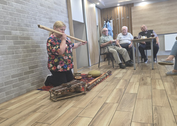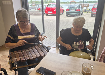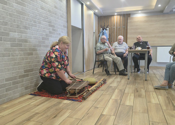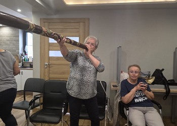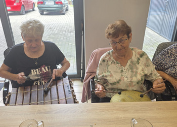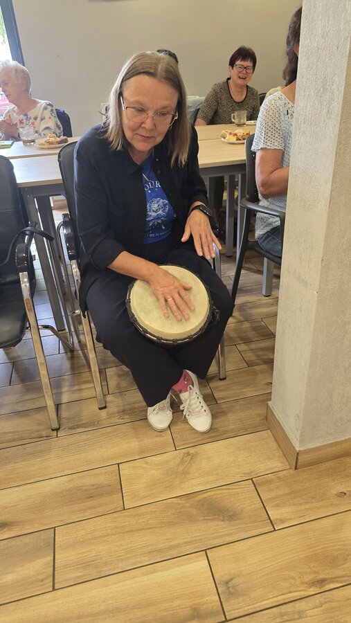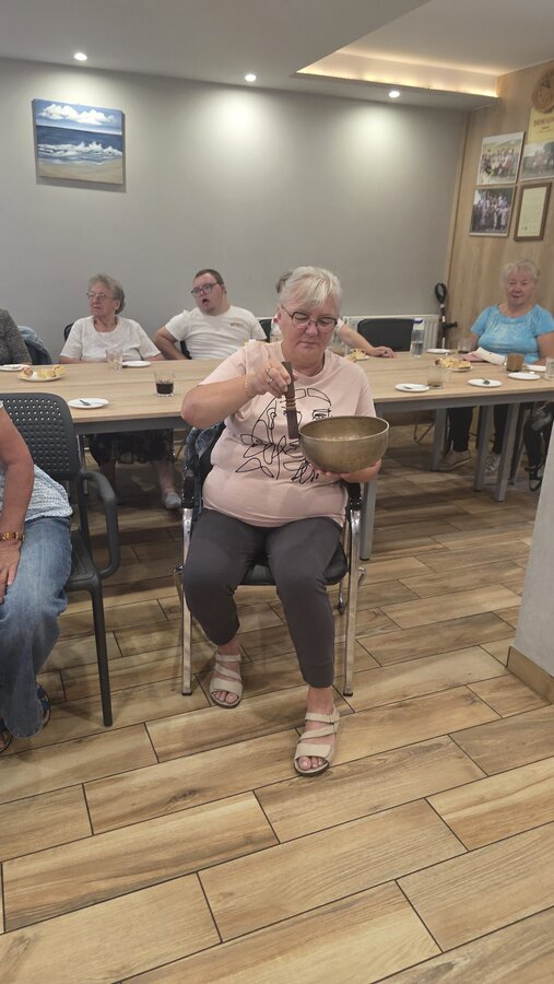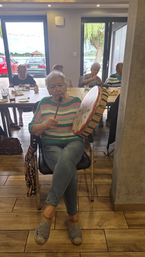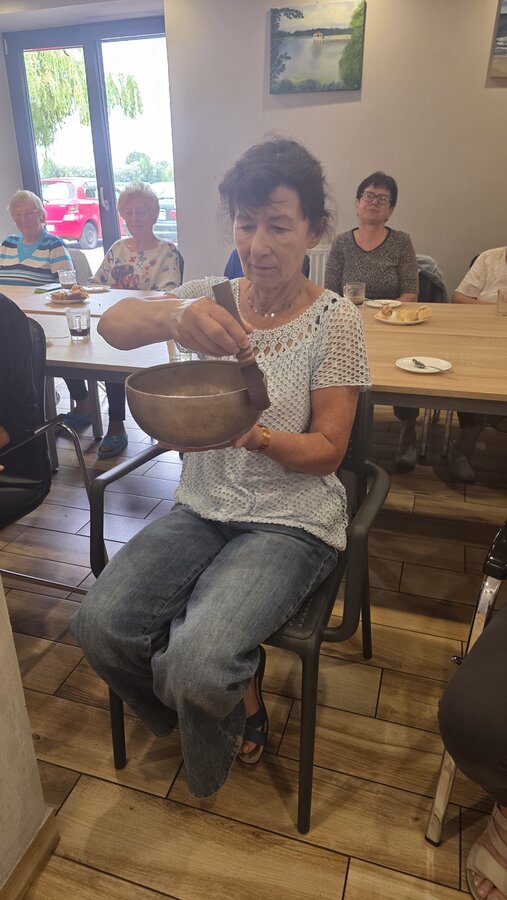 A na koniec tygodnia (piątek, 18 lipca 2025) czekały na naszych Seniorów fantastyczne zajęcia i to nie byle jakie, bo zajęcia z muzykoterapii. Poprowadziła je pani Magdalena Wasyluk z Wijewa, która muzykoterapię holistyczną studiowała w Czechach u samego twórcy – Lubomira Holzera. Pani Magda opowiedziała o swojej pracy i jednocześnie pasji jaką jest muzyka i muzykoterapia. Opowiedziała o instrumentach, które ze sobą przywiozła, a także na nich zagrała! Seniorzy z zachwytem i zainteresowaniem słuchali naszego gościa, który niewątpliwie sprawił im wiele radości muzyką! Uśmiech nie schodził im z twarzy, tym bardziej że mogli na tych instrumentach również sami zagrać…